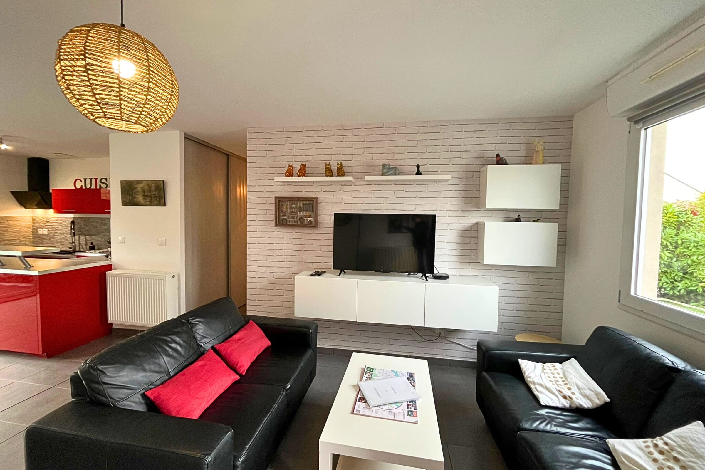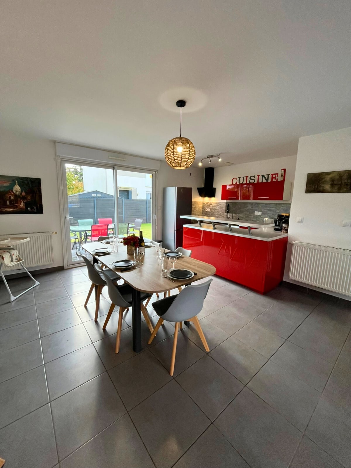 En entrant, vous trouverez une pièce de vie conviviale avec un salon équipé d’un canapé, d’une TV et d’une table basse, ouverte sur une salle à manger spacieuse (table, chaises et chaise haute à disposition).