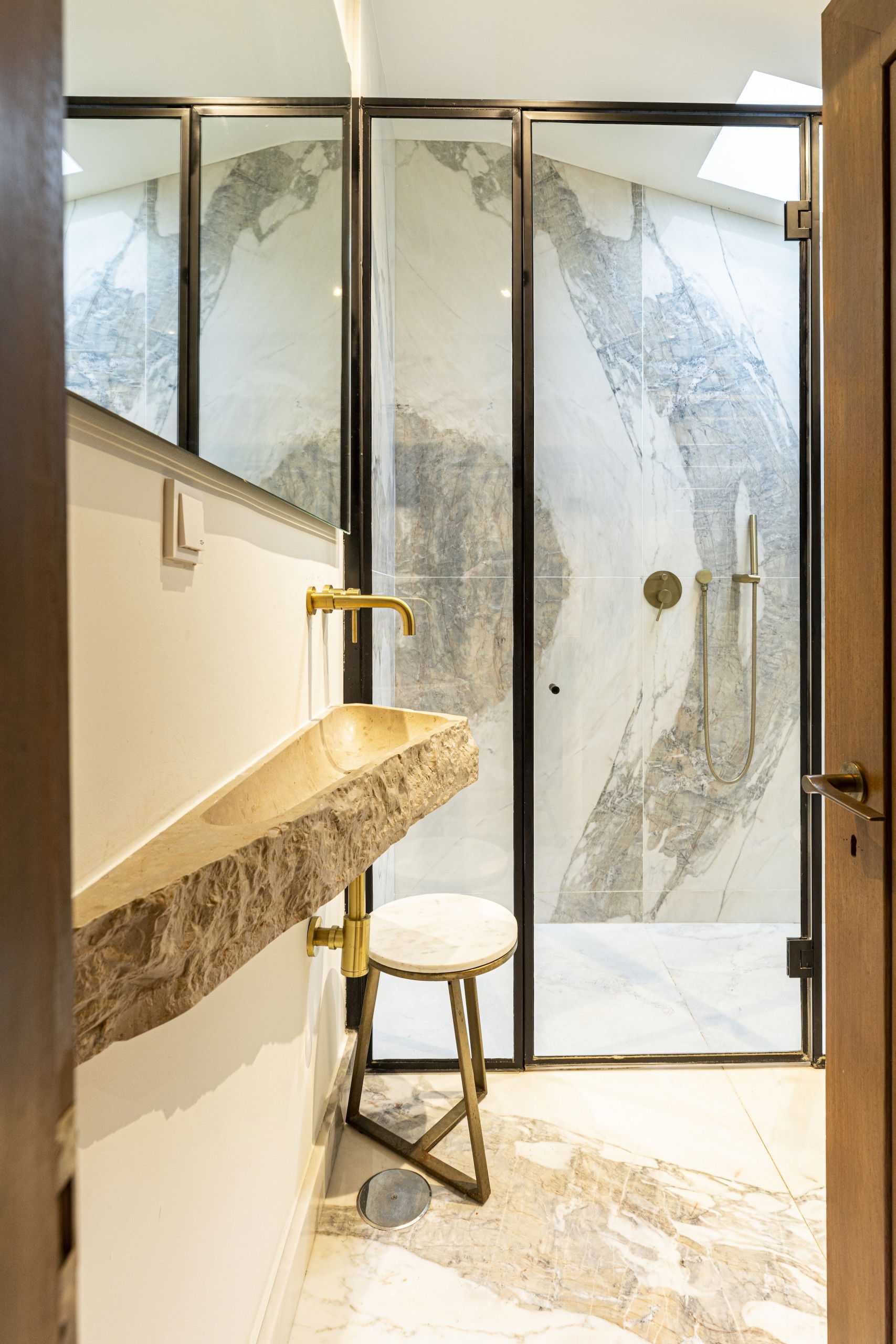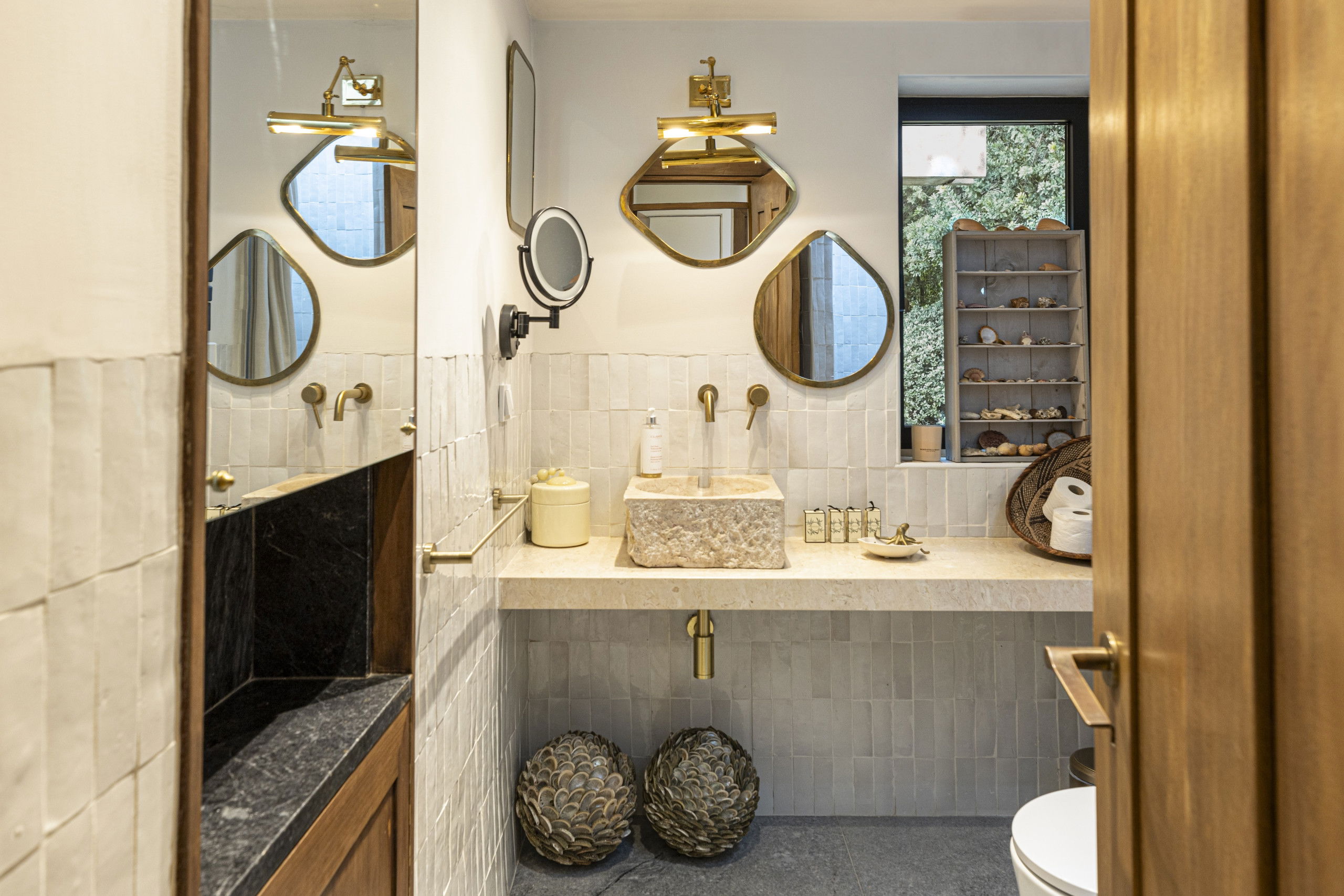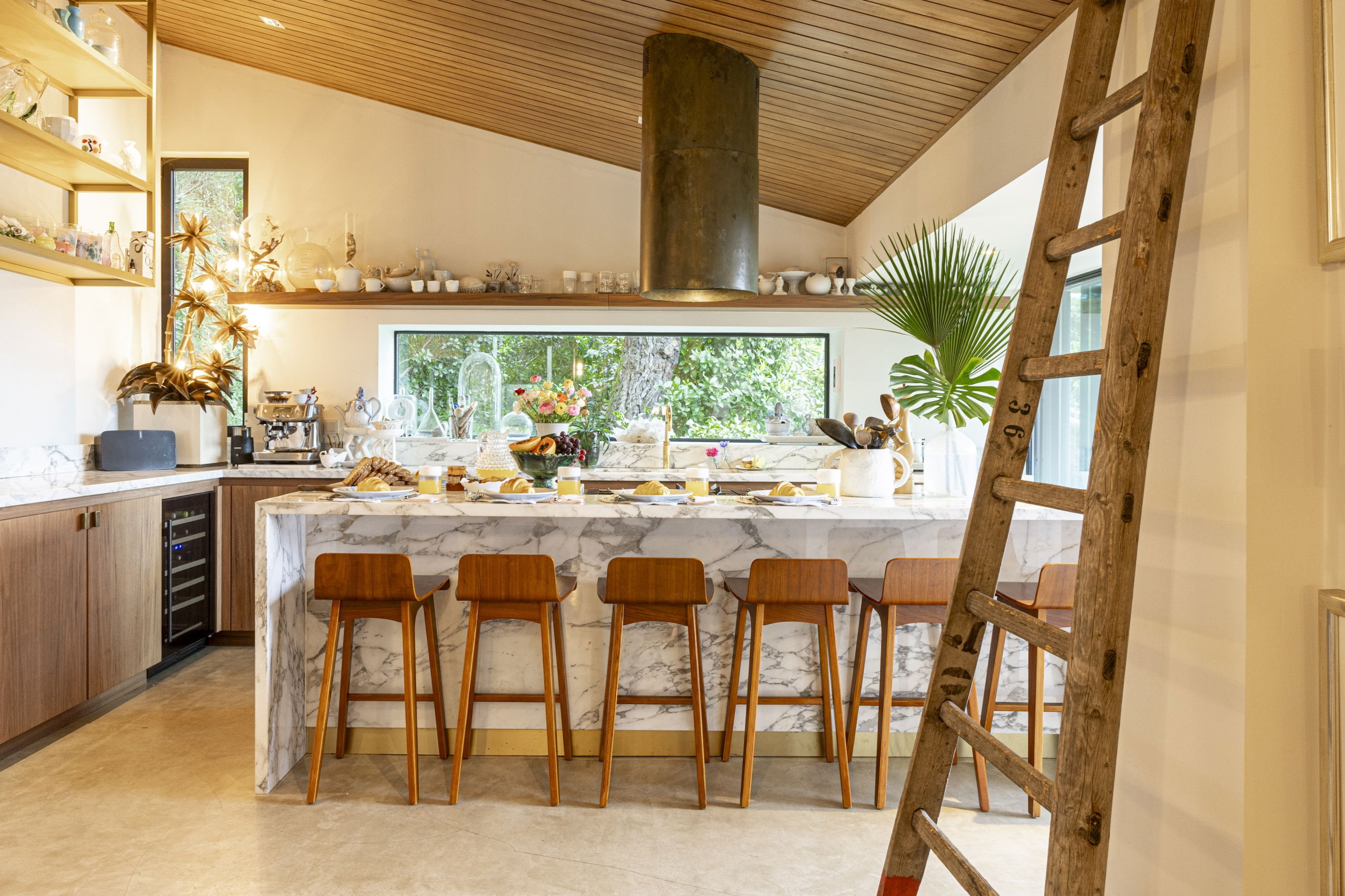 With contrasting materials across warm wood and cooling marble. Marble features heavily throughout the property, from the breakfast bar and chef’s kitchen style worktop, to the flooring in the reception hallway. The kitchen is achingly beautiful, every detail has been considered. Dark wood doors, clean marble worktops and clean golden shelving units. The grand landscape windows invite some outdoor greenery indoors.