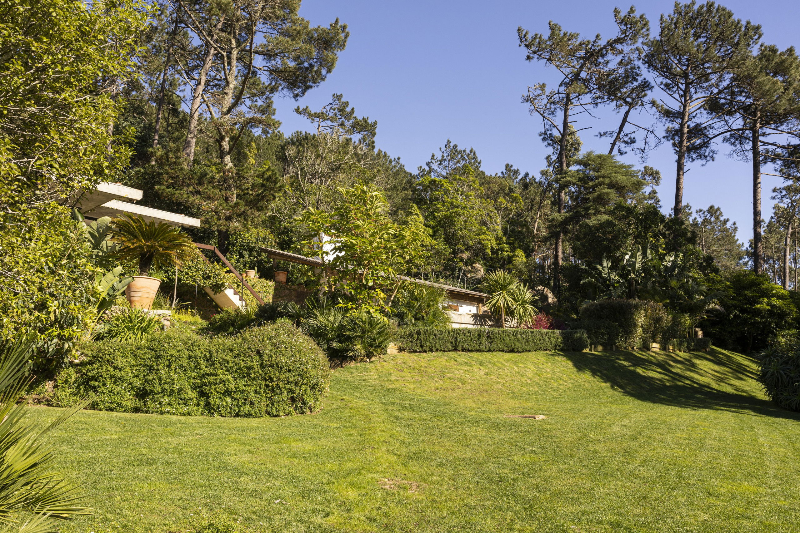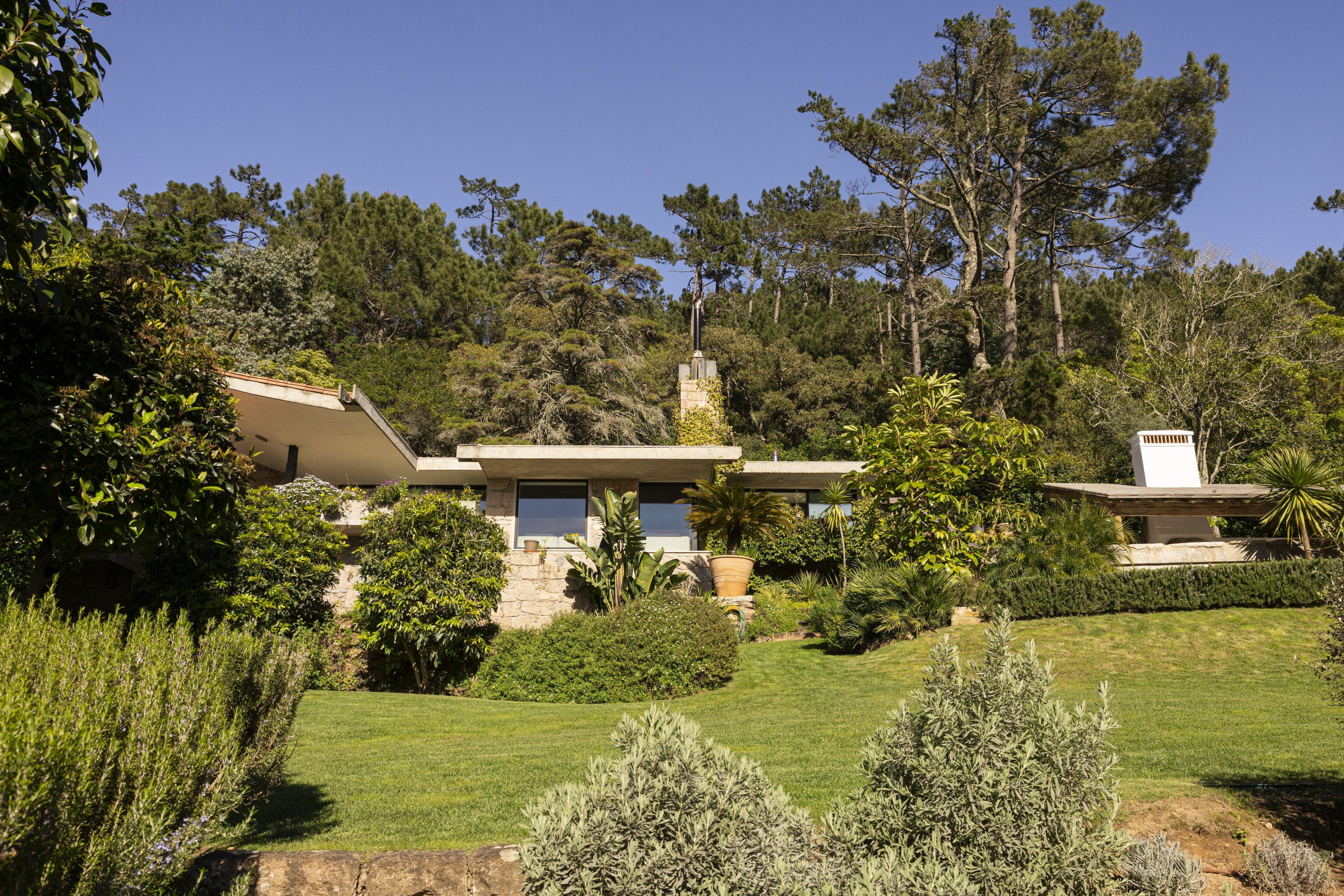 Plots of grass are generously spaced around the exterior of the villa , bordered by flower beds filled with delightful endemic colourful flora and fauna. Next to the pool area we find a cubby relaxation area with outdoor open fireplace, built in surround bench seating shaded from the Portuguese sun by a wooden slatted roof. The outdoor kitchen creates an outdoor setting for summer evenings gathering around the fire cooking with the family.