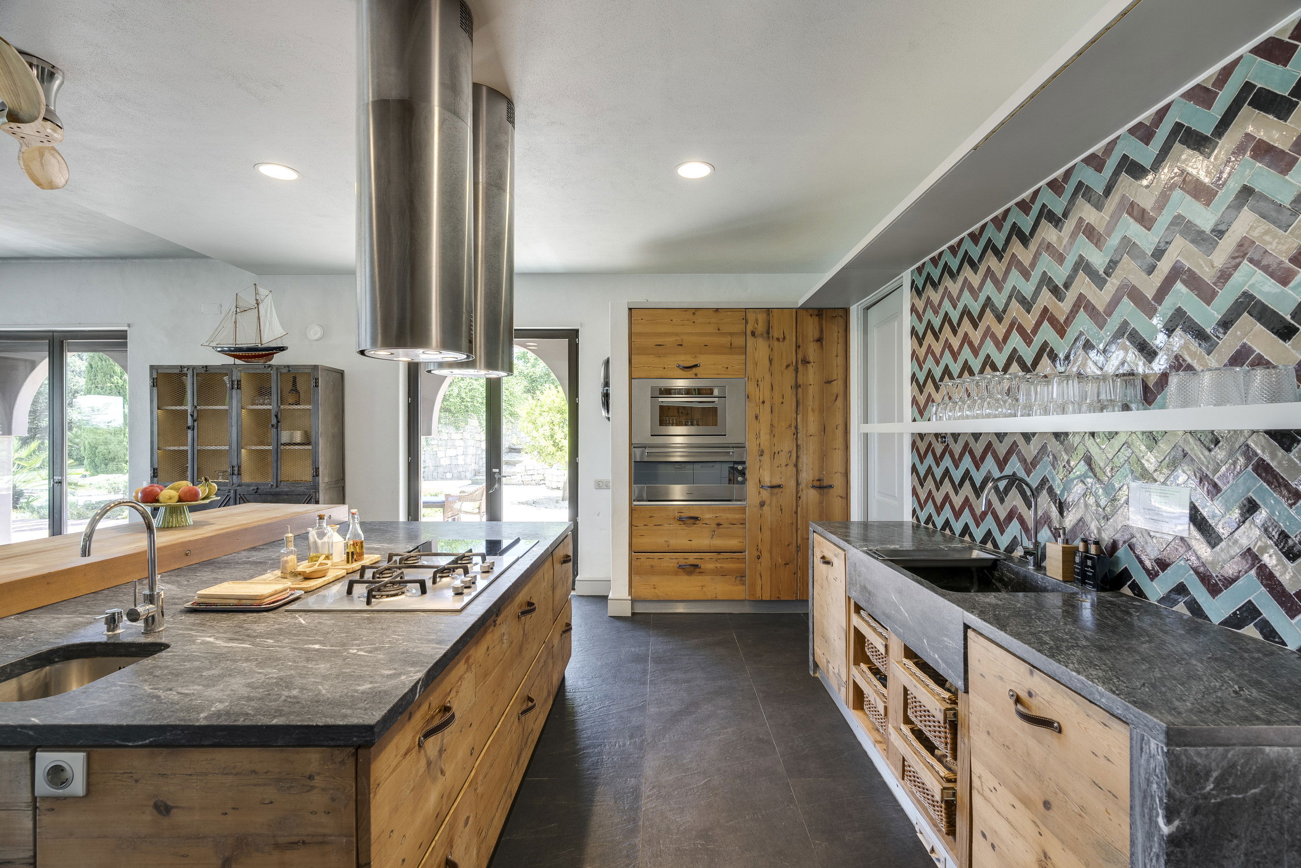 La cuisine américaine à plan ouvert est bien équipée, comprenant une plaque chauffante Teppanyaki. Le comptoir de petit-déjeuner invite à des matins détendus. Il y a également un garde-manger pour le rangement et une buanderie séparée avec une zone de séchage discrète.