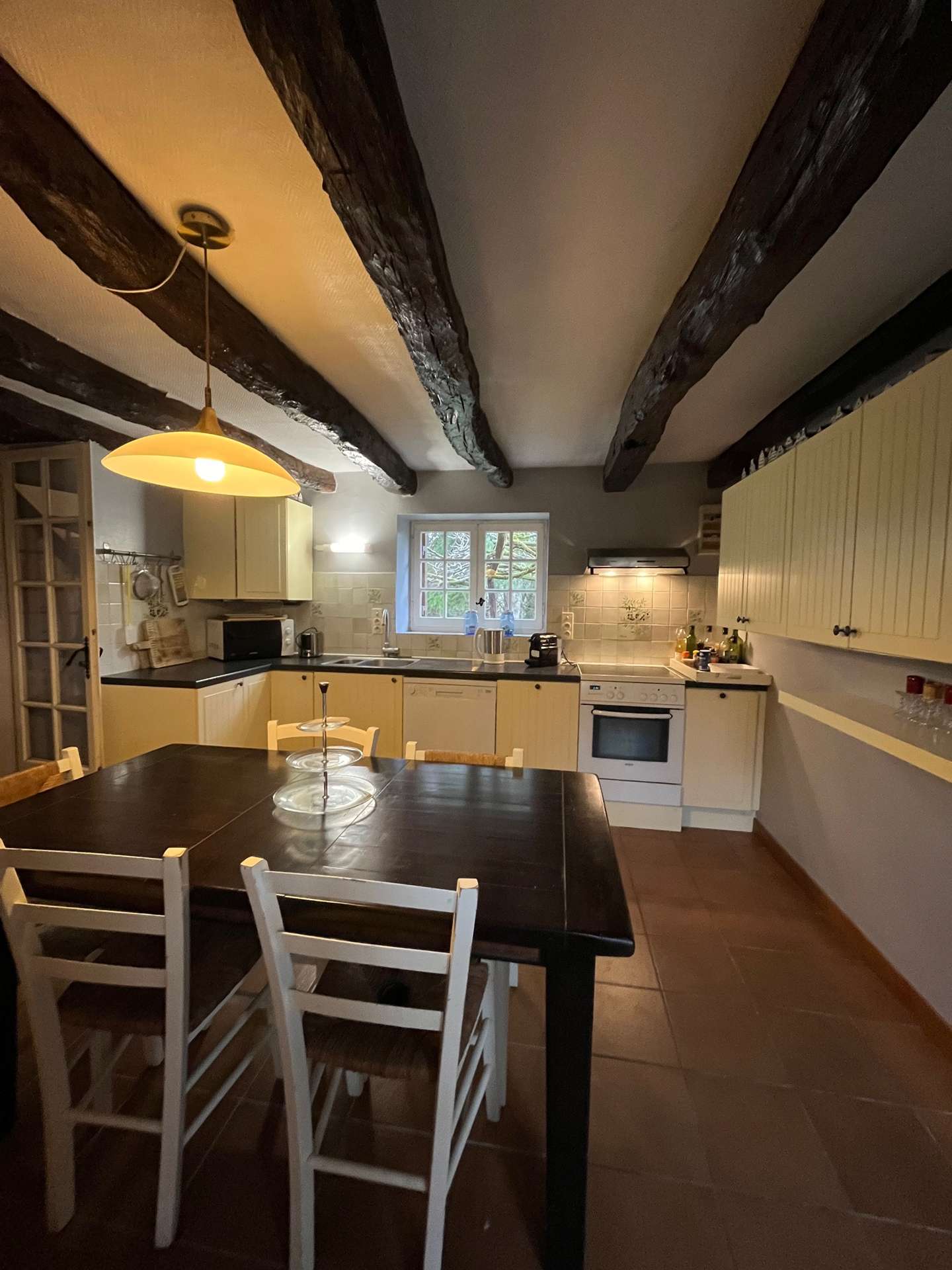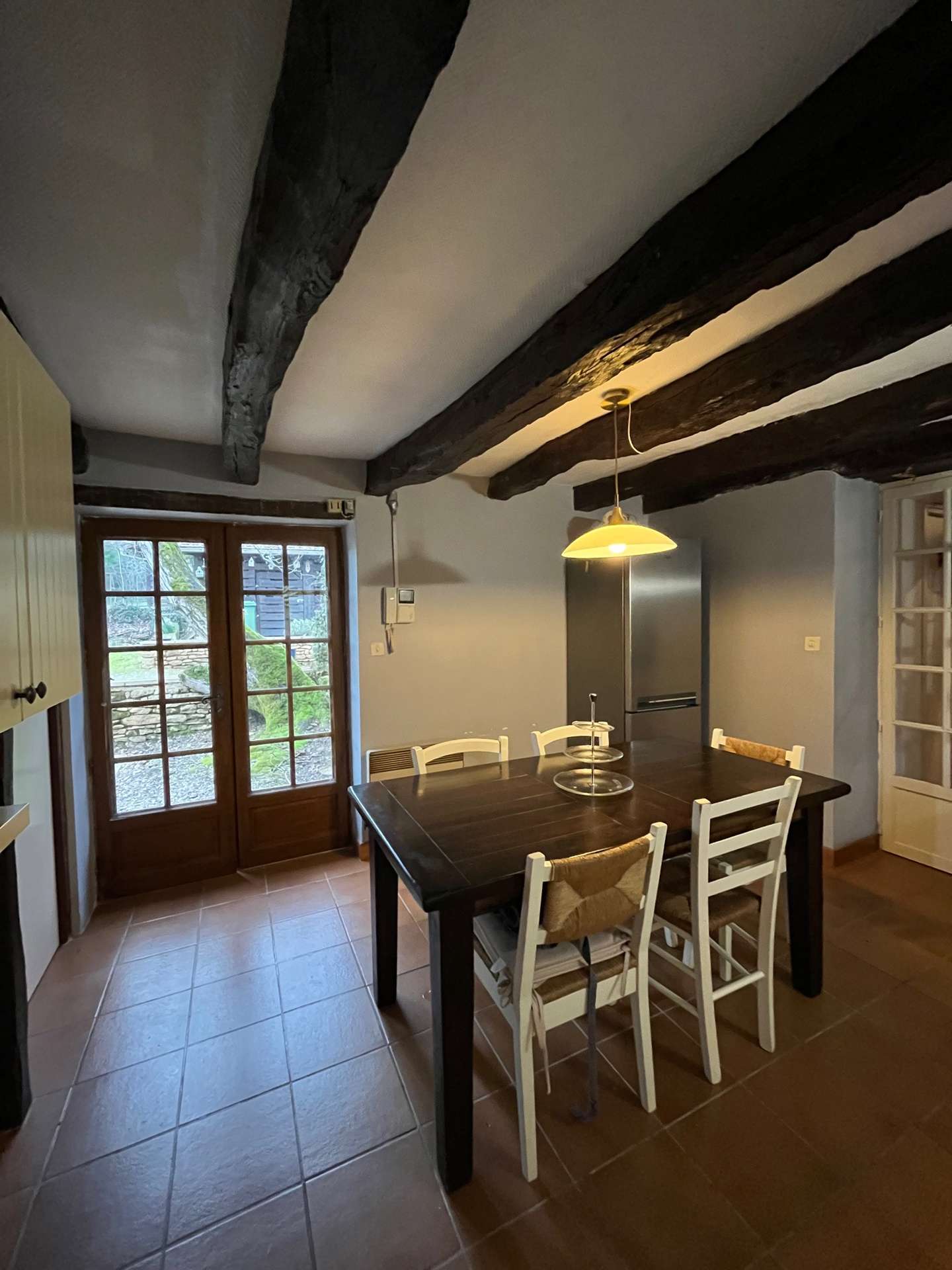 Sur la droite du hall, une cuisine équipée, avec notamment un lave vaisselle, vous attend pour préparer vos repas dans les meilleures conditions. Elle s'ouvre sur une spacieuse salle à manger qui bénéficie d'un accès direct à deux terrasses dont l'une est ombragée par une magnifique glycine.