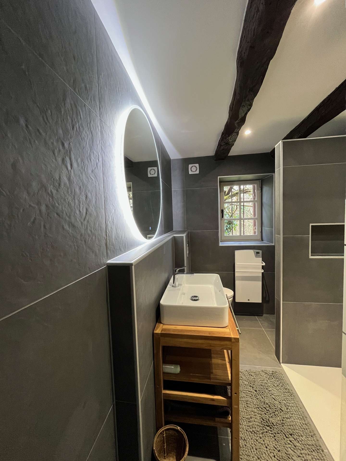 Une salle d'eau contemporaine complète ce niveau, avec sa douche à l'italienne, son coin buanderie équipé d'un lave-linge et d'un sèche-linge, ainsi que des toilettes.