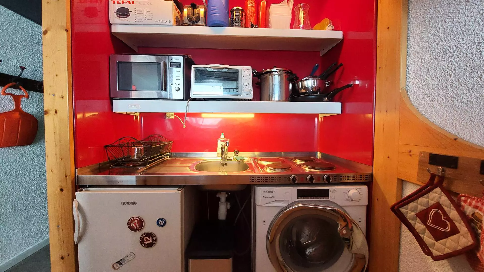 La cuisine ouverte sur le séjour est équipée de 3 plaques électrique, d'un mini four, d'une four à micro-ondes, d'un réfrigérateur, d'un lave-linge, d'un grille-pain, d'une cafetière et d'une bouilloire.
