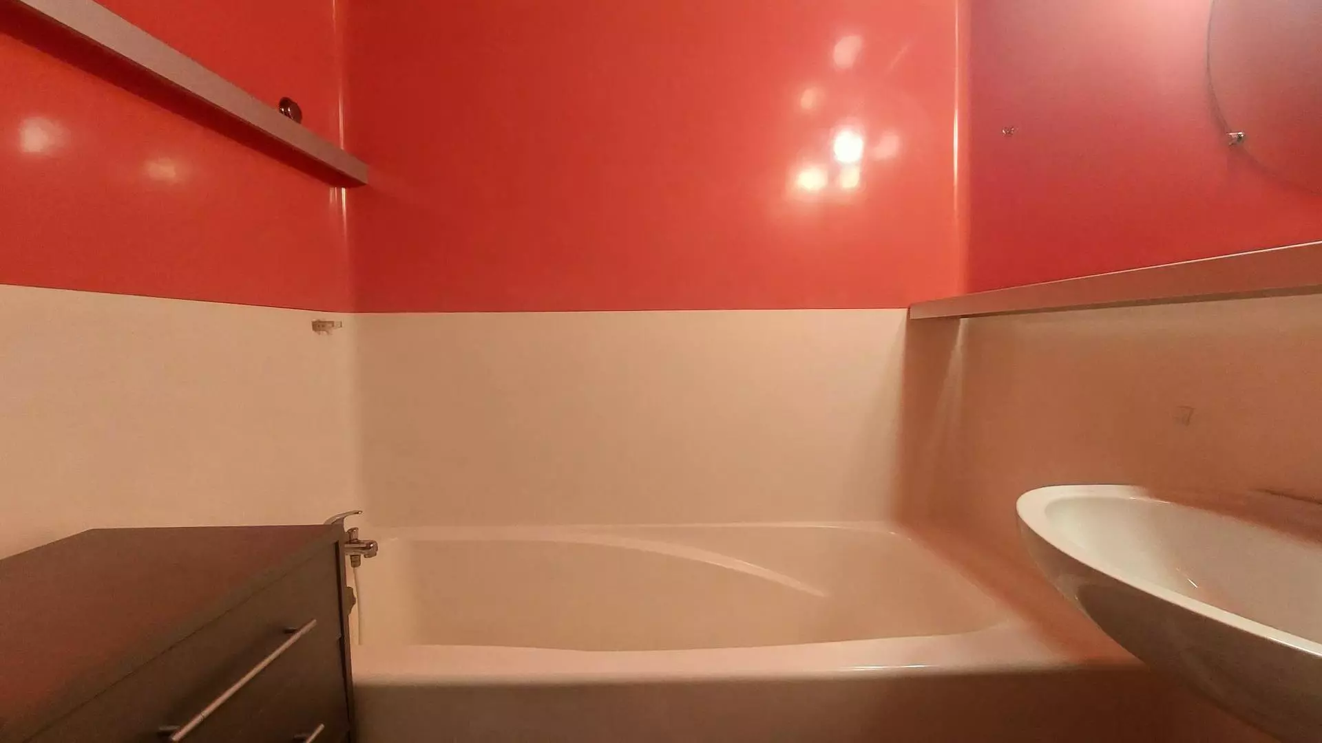 La salle de bain dispose d'une baignoire et les toilettes sont séparées.