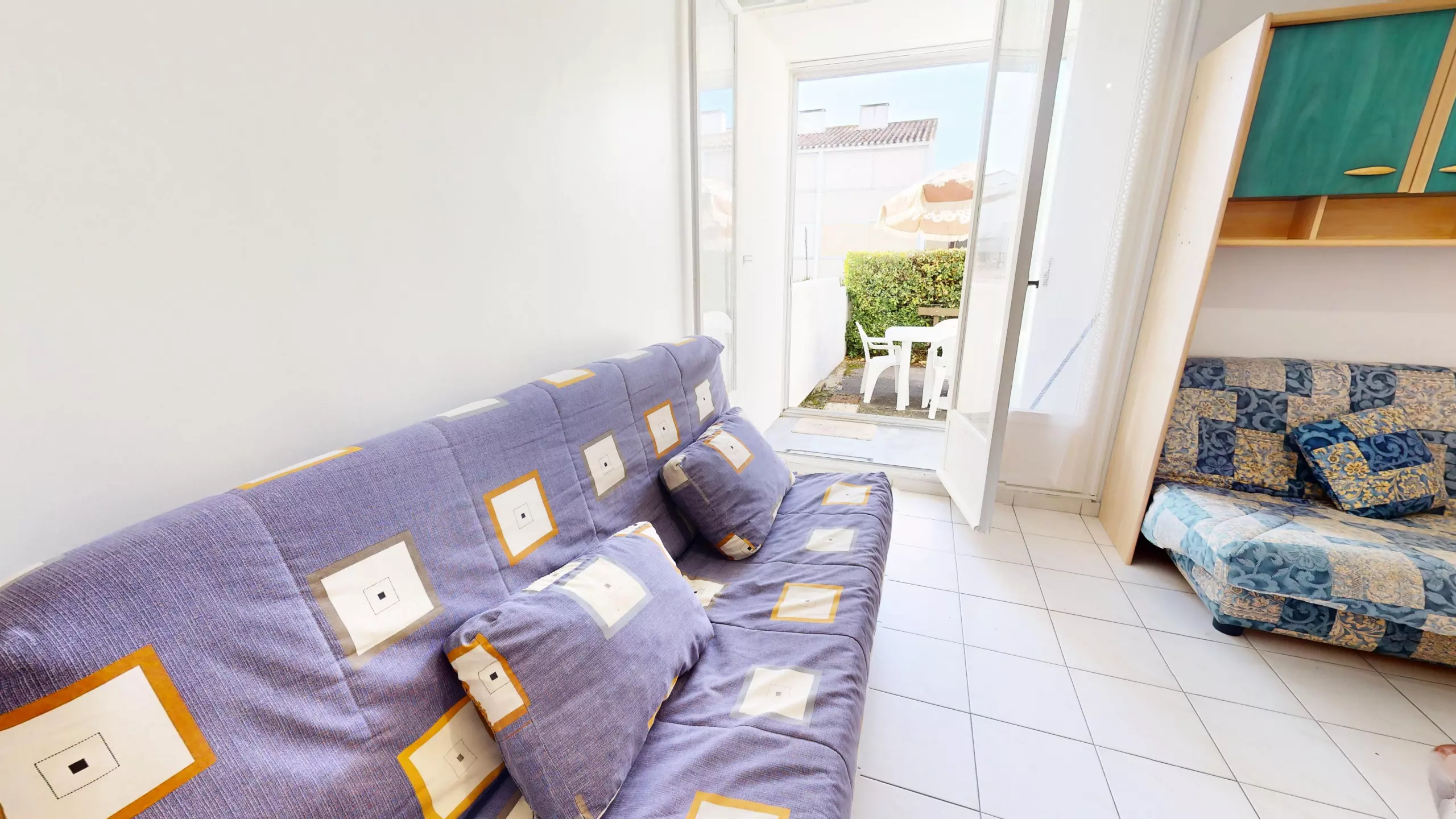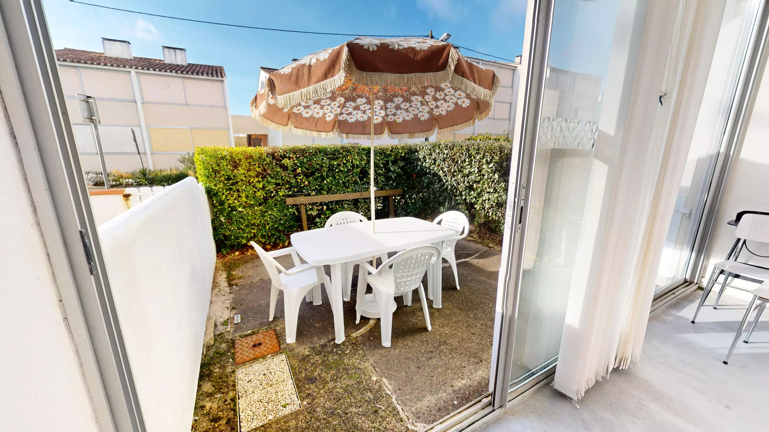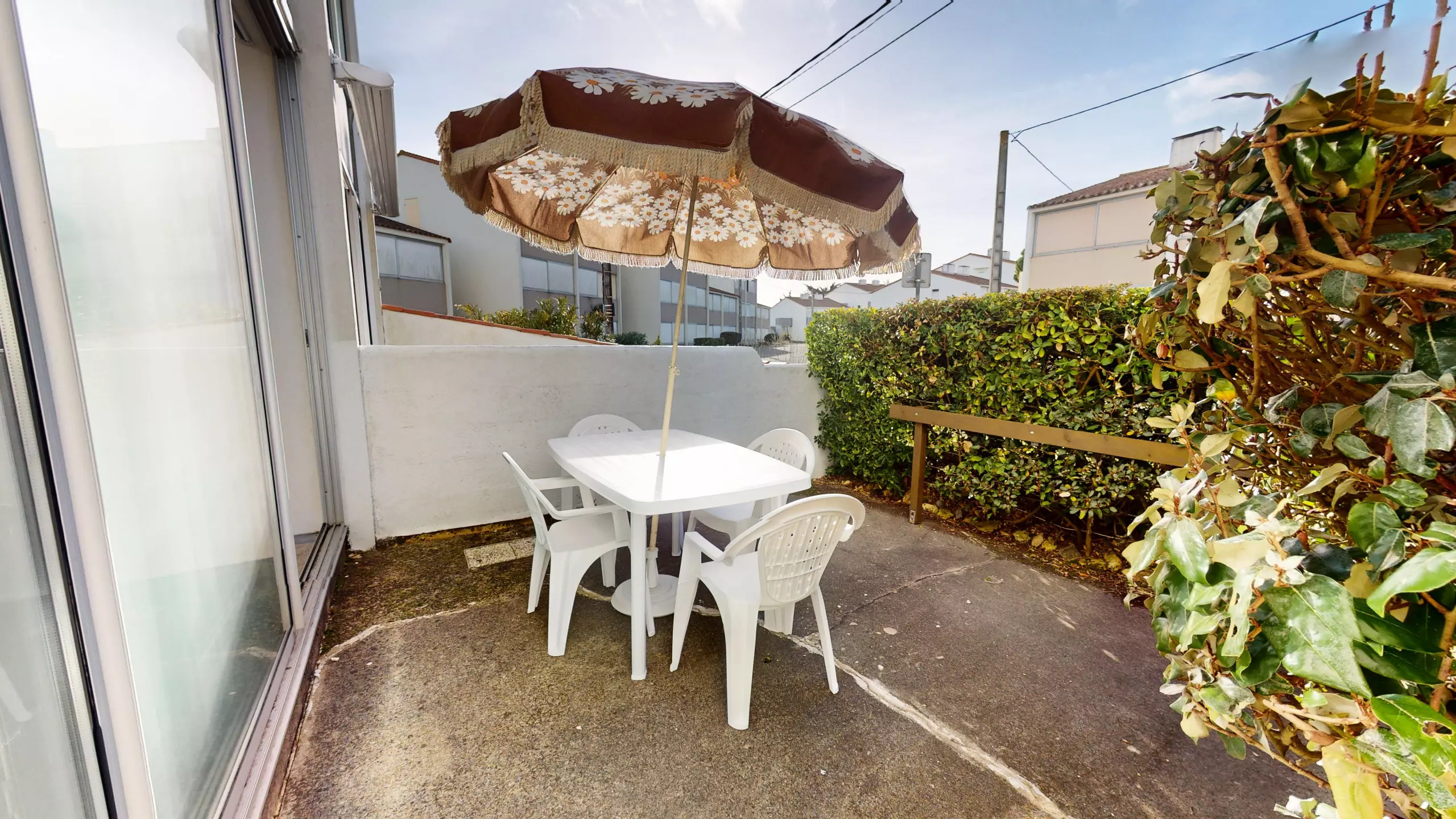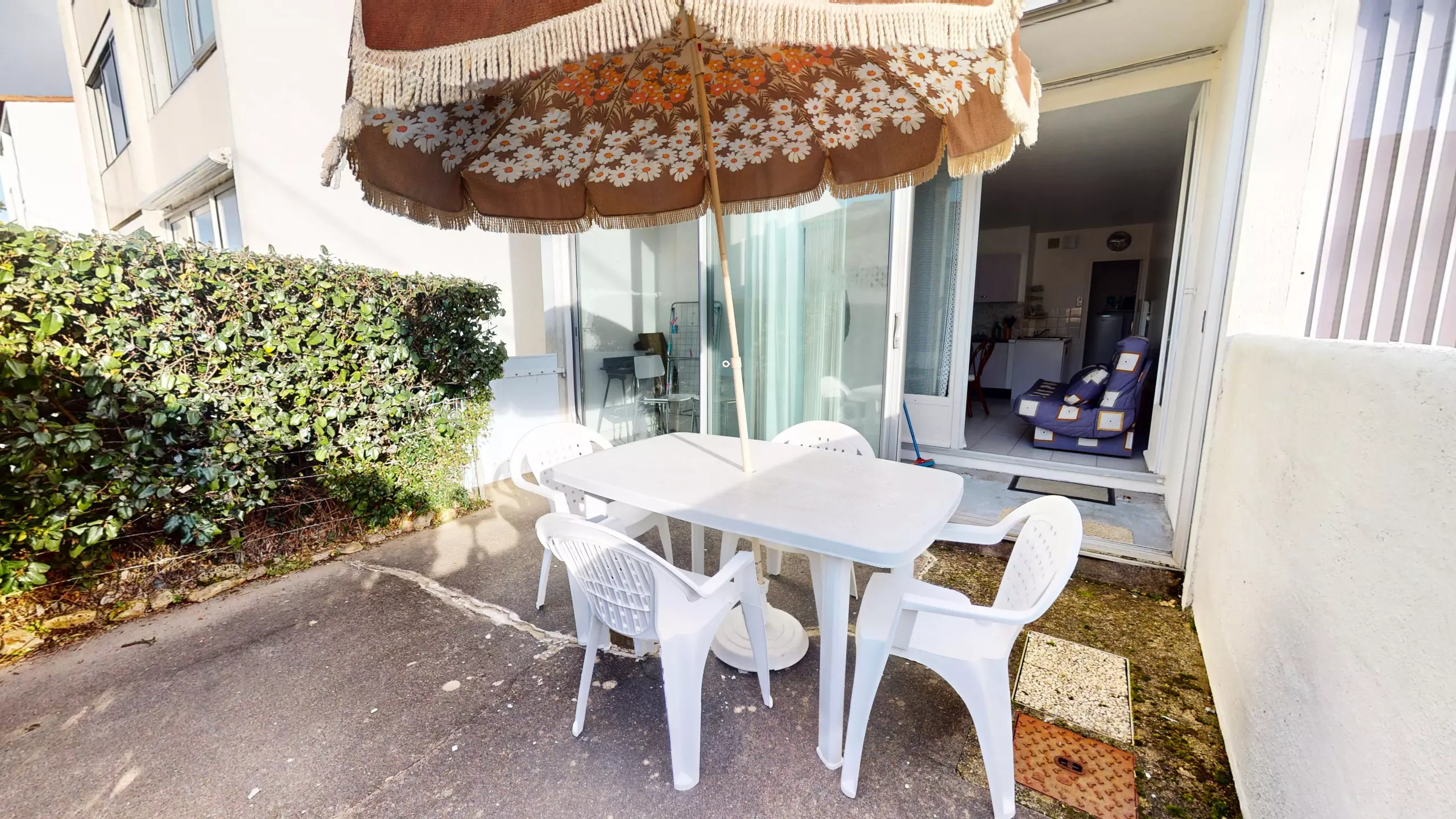 Situé en rez-de-chaussée, l’appartement dispose d’une terrasse clôturée, aménagée avec mobilier de jardin et parasol, idéale pour vos petits-déjeuners, repas en extérieur ou moments de détente au soleil.