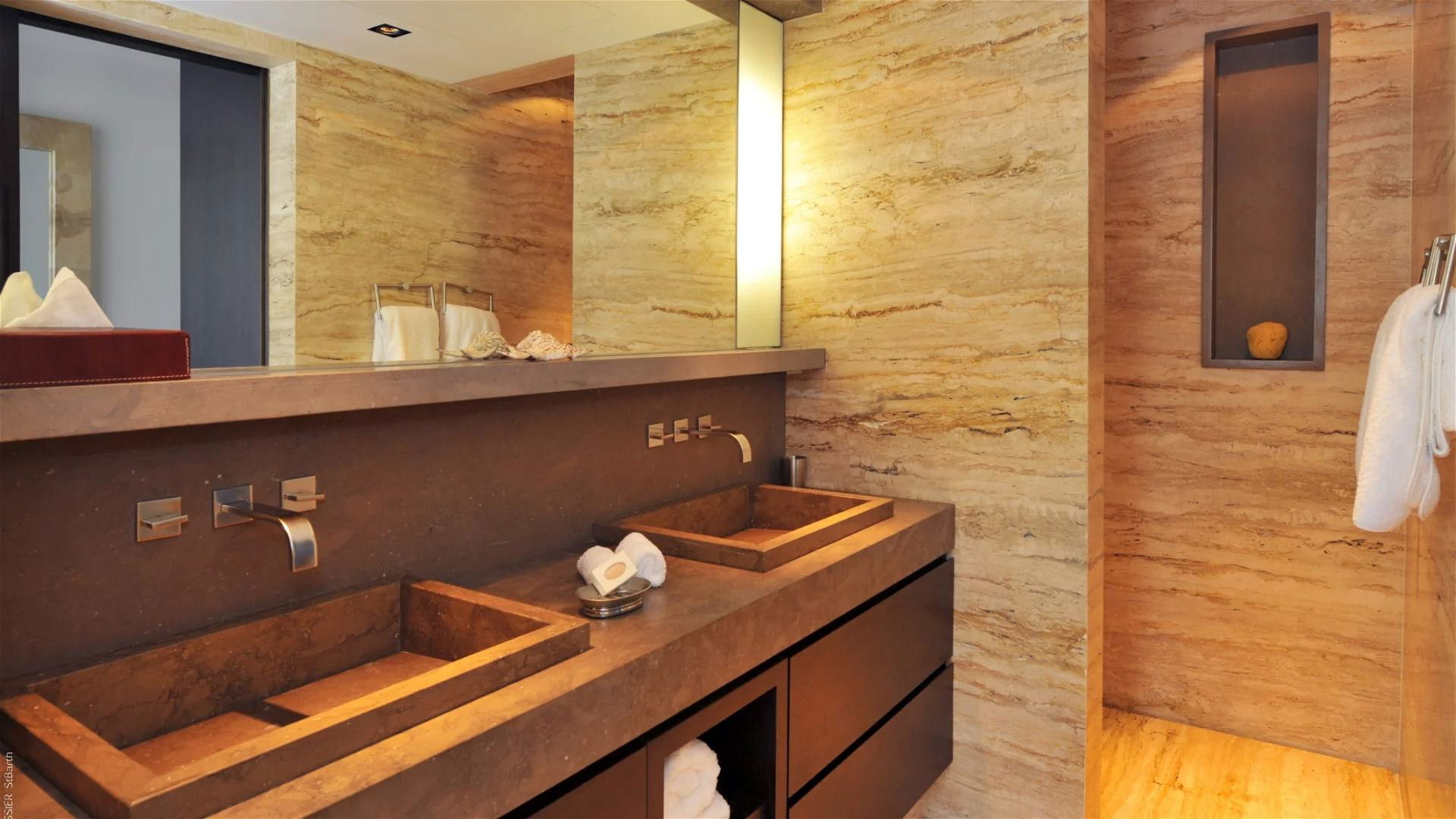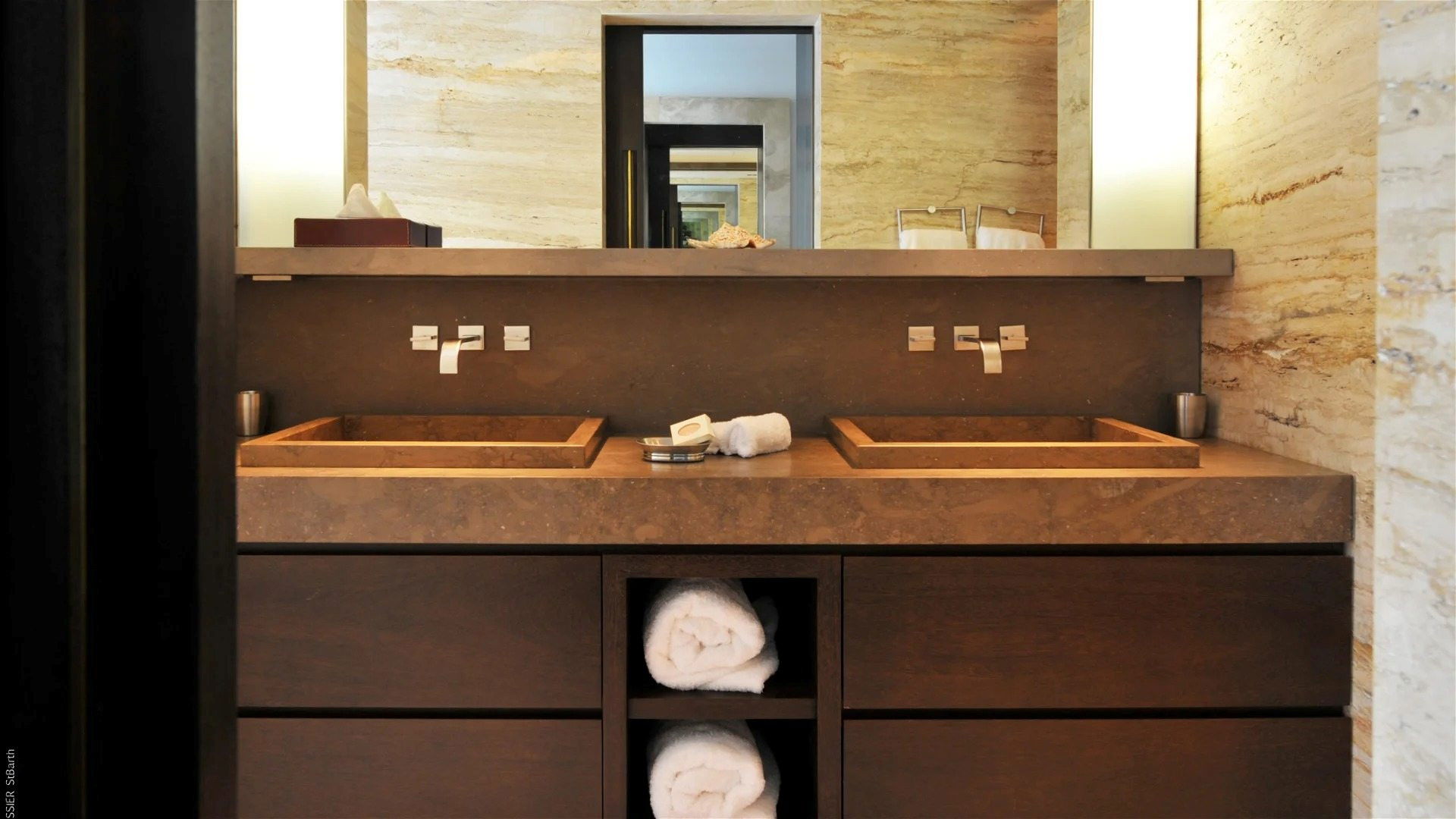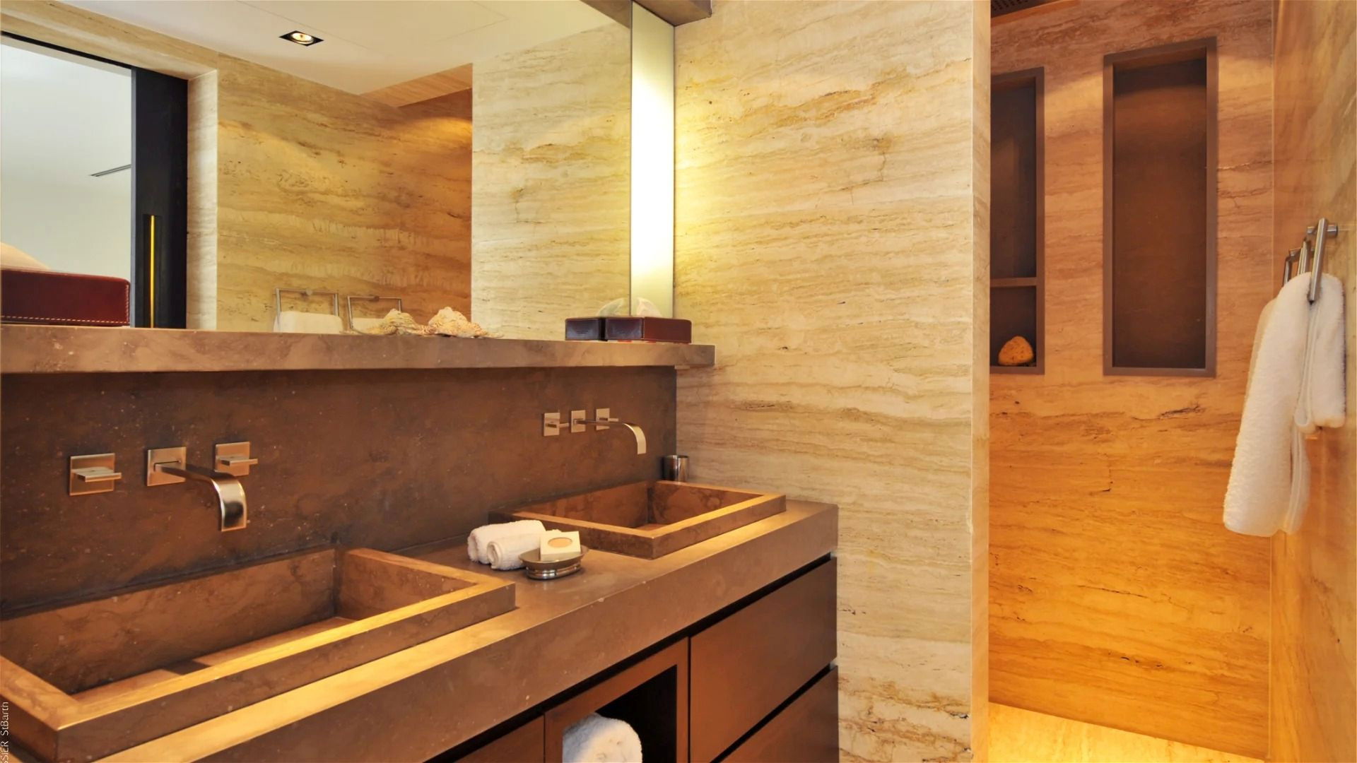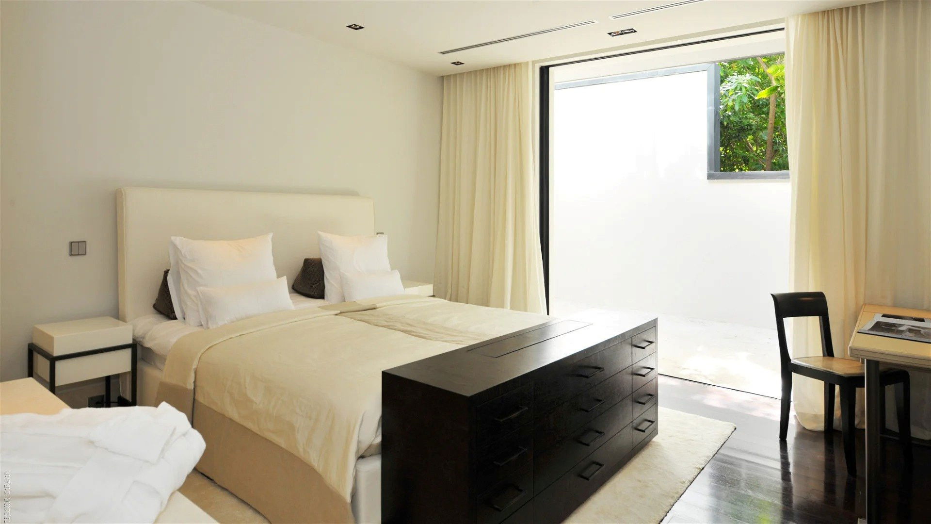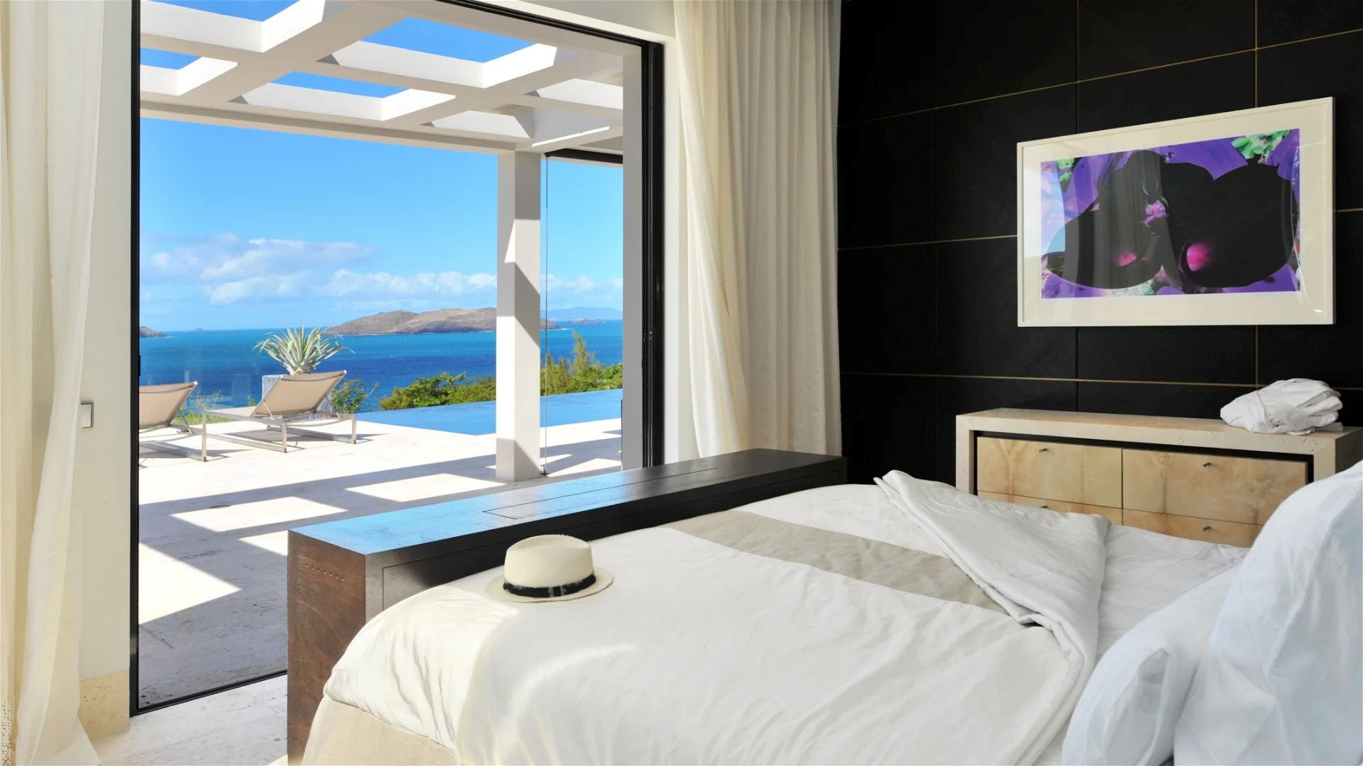 Les cinq chambres de La Petite Sereine présentent un niveau de confort et de raffinement homogène, faisant de cette villa de luxe à Saint-Barth une adresse idéale pour les familles ou les groupes d’amis voyageant ensemble. Chacune dispose d’un lit queen-size, d’une salle de bains attenante avec double vasque et douche à effet pluie, ainsi que d’une télévision discrètement intégrée dans des meubles sur mesure. Deux chambres se situent au niveau supérieur, tandis que les trois autres occupent le niveau inférieur, avec un accès direct à une seconde terrasse et à une piscine encore plus vaste, garantissant intimité et sérénité à chaque hôte.