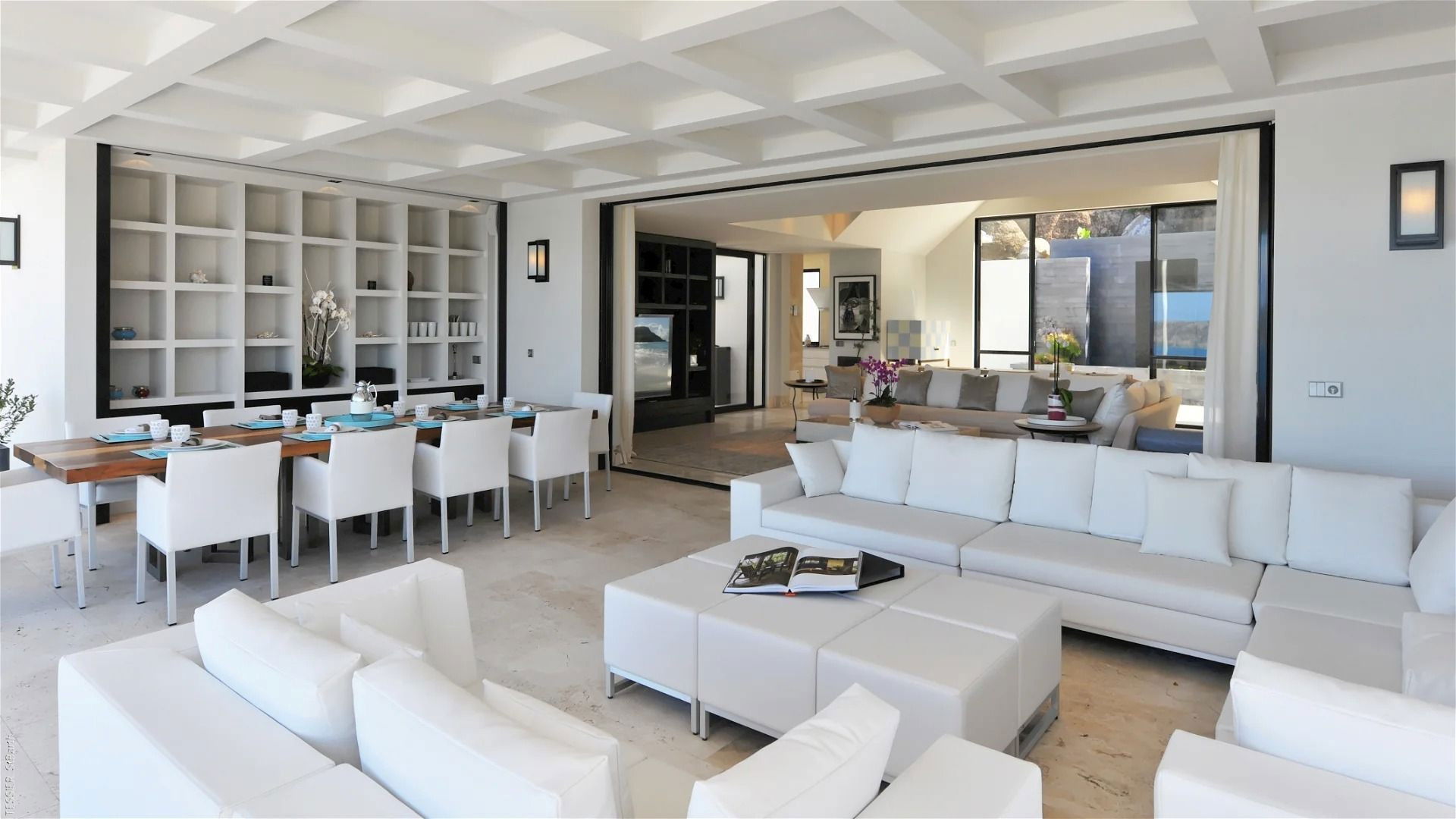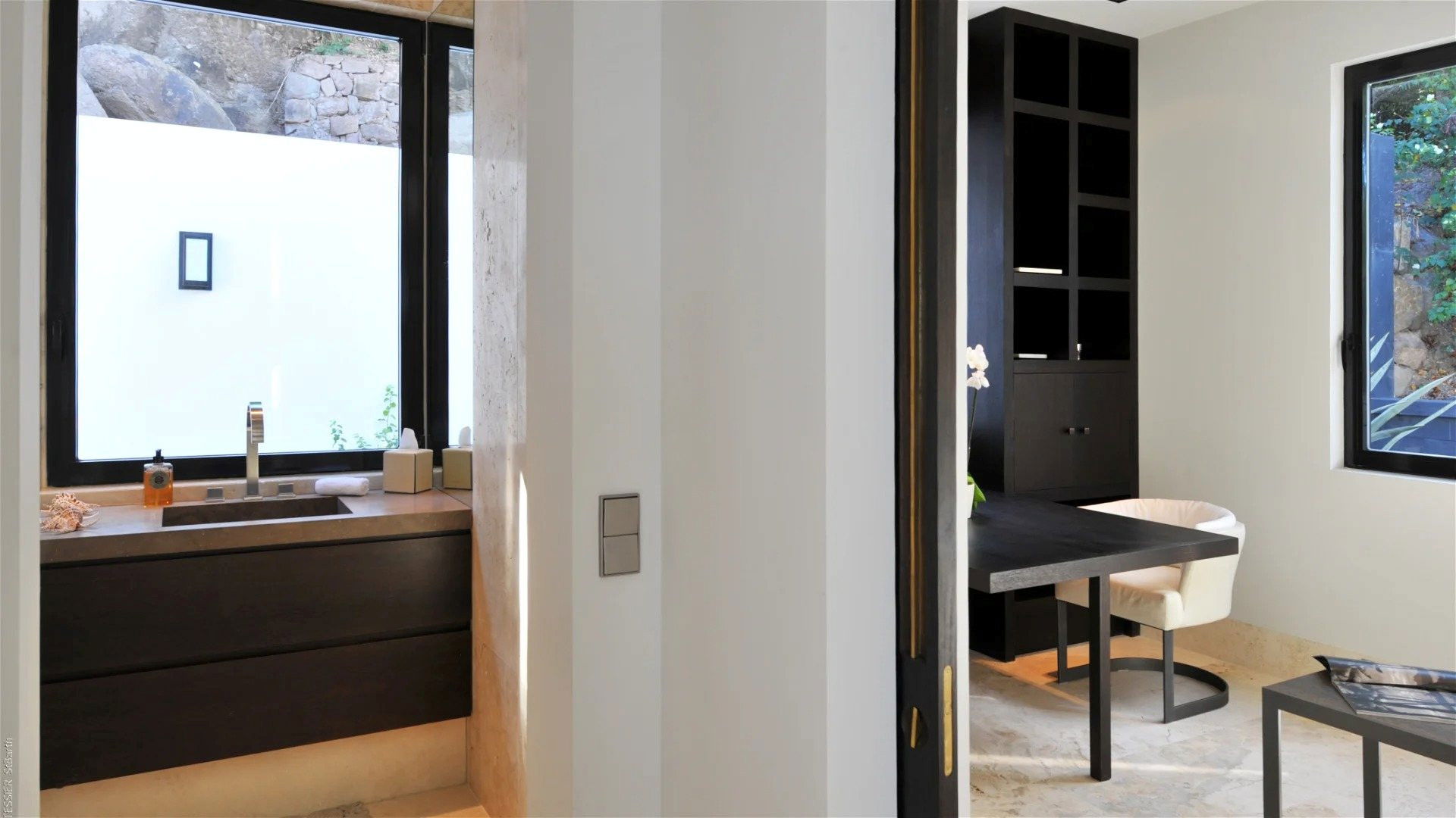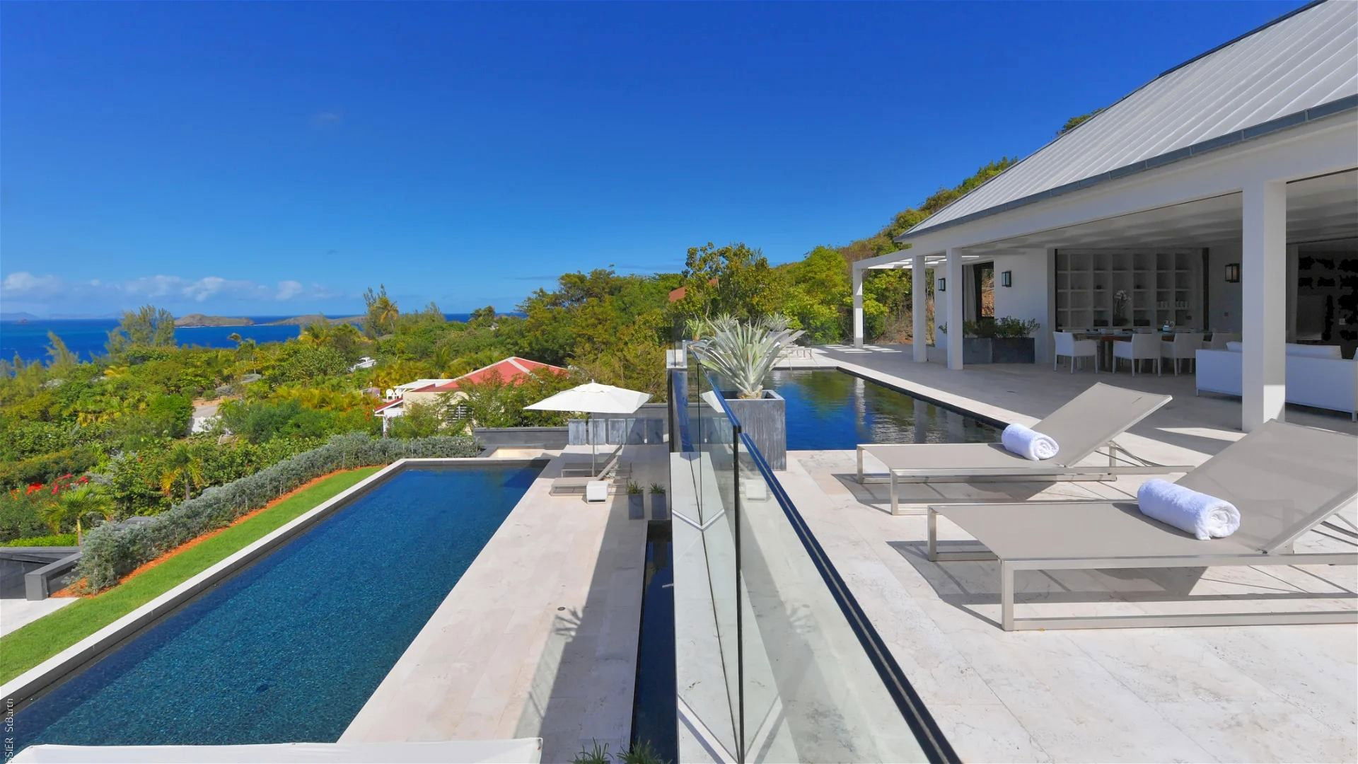Érigée sur deux niveaux, chacun disposant de sa propre terrasse et de sa piscine privée, La Petite Sereine conjugue parfaitement intimité et convivialité. Le vaste espace central accueille deux salons distincts, idéals pour recevoir ou se détendre en toute élégance. Le salon intérieur, entièrement climatisé, permet de profiter d’un home cinéma de dernière génération, tandis que le salon extérieur s’ouvre sur la terrasse, la piscine et une vue imprenable sur l’océan. À la tombée du jour, un éclairage soigneusement étudié sublime les volumes et crée une atmosphère chaleureuse et sophistiquée.
