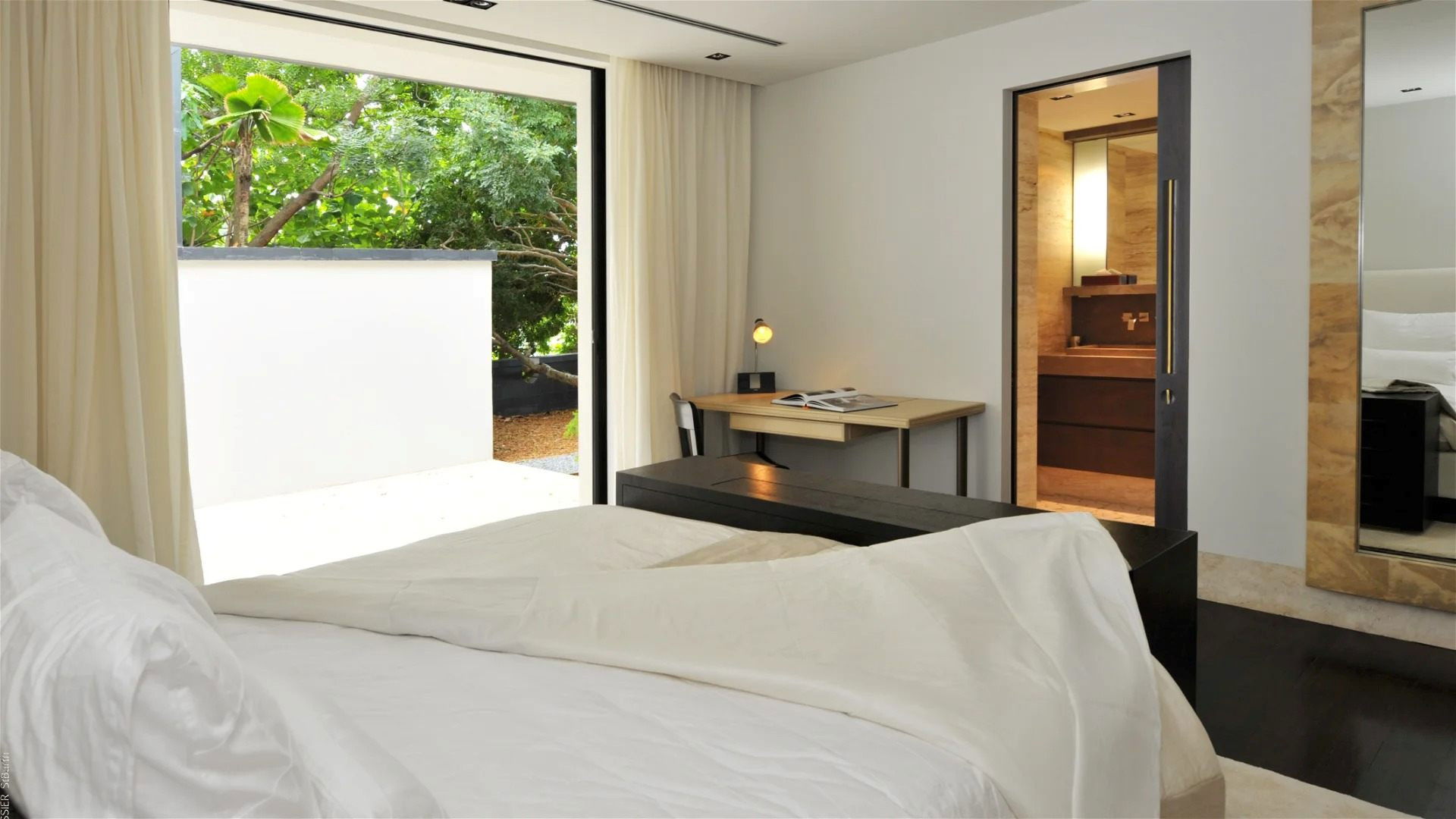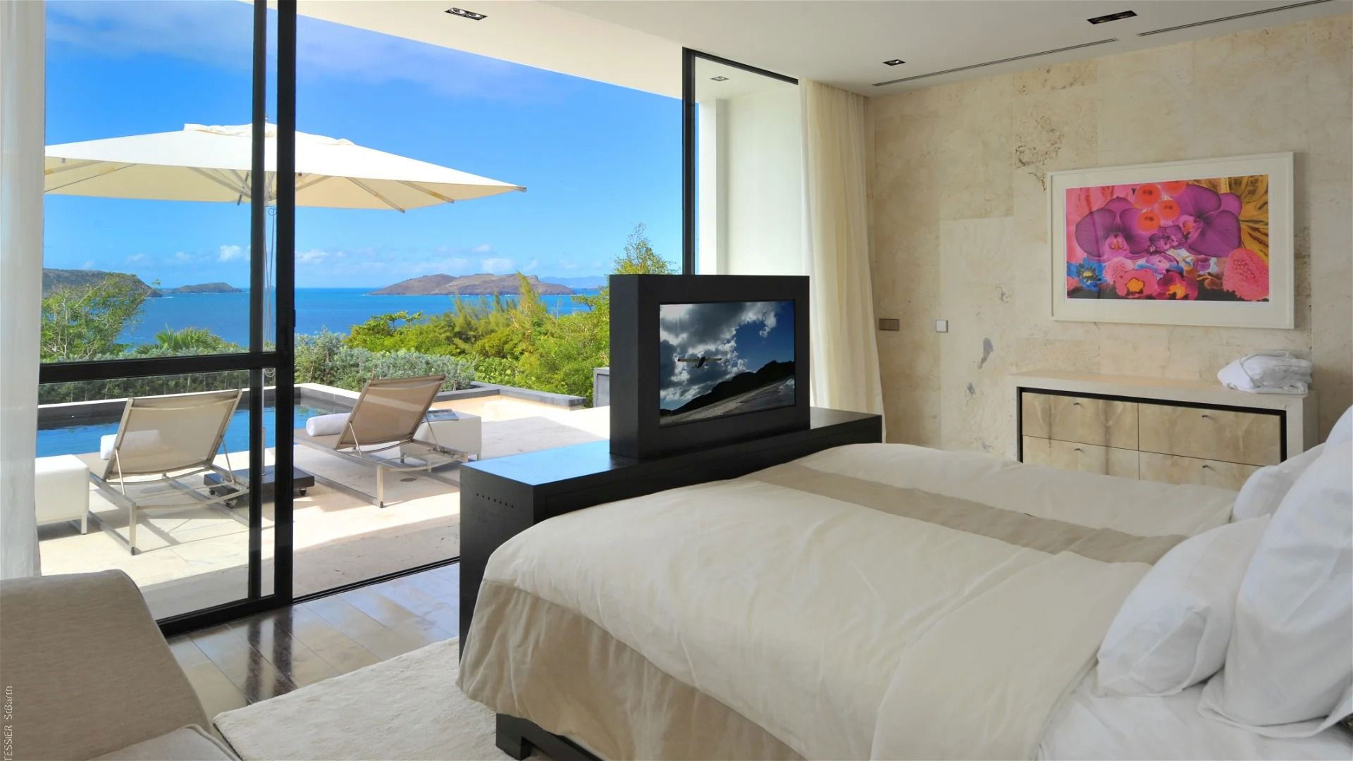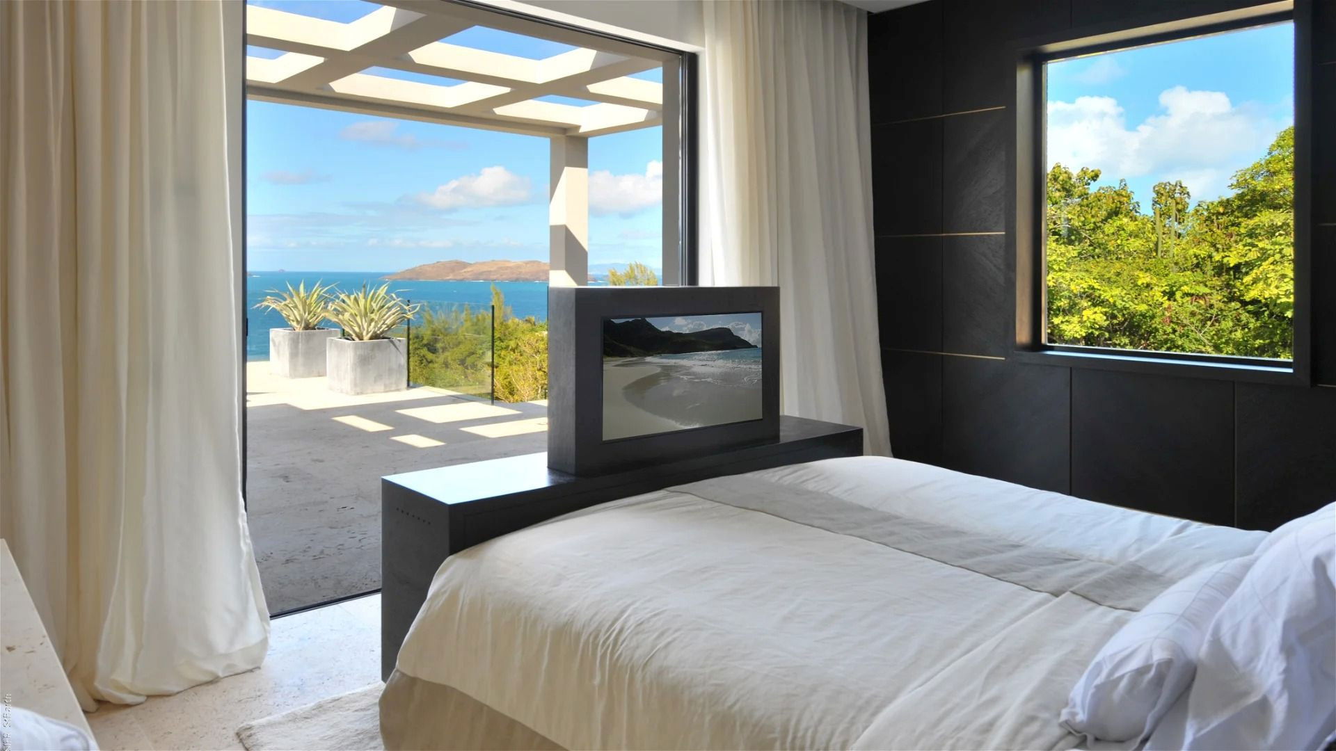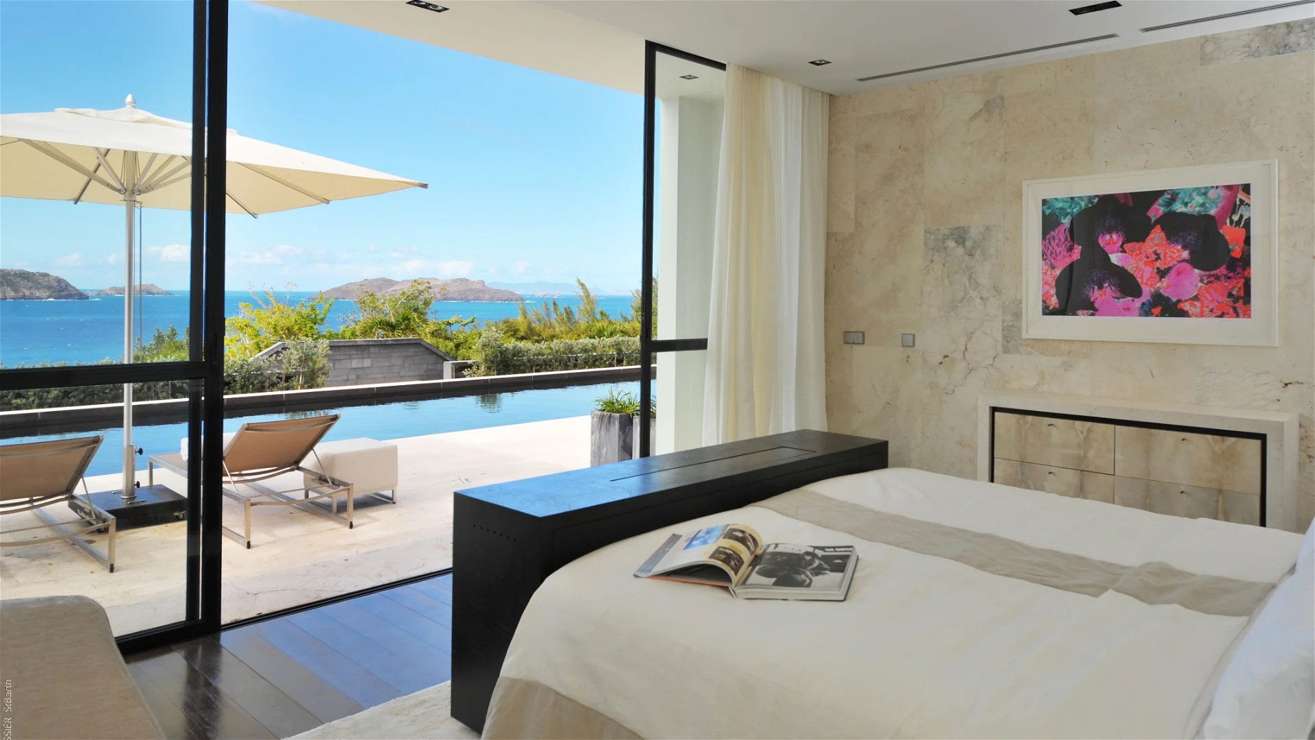 Les cinq chambres de La Petite Sereine présentent un niveau de confort et de raffinement homogène, faisant de cette villa de luxe à Saint-Barth une adresse idéale pour les familles ou les groupes d’amis voyageant ensemble. Chacune dispose d’un lit queen-size, d’une salle de bains attenante avec double vasque et douche à effet pluie, ainsi que d’une télévision discrètement intégrée dans des meubles sur mesure. Deux chambres se situent au niveau supérieur, tandis que les trois autres occupent le niveau inférieur, avec un accès direct à une seconde terrasse et à une piscine encore plus vaste, garantissant intimité et sérénité à chaque hôte.
