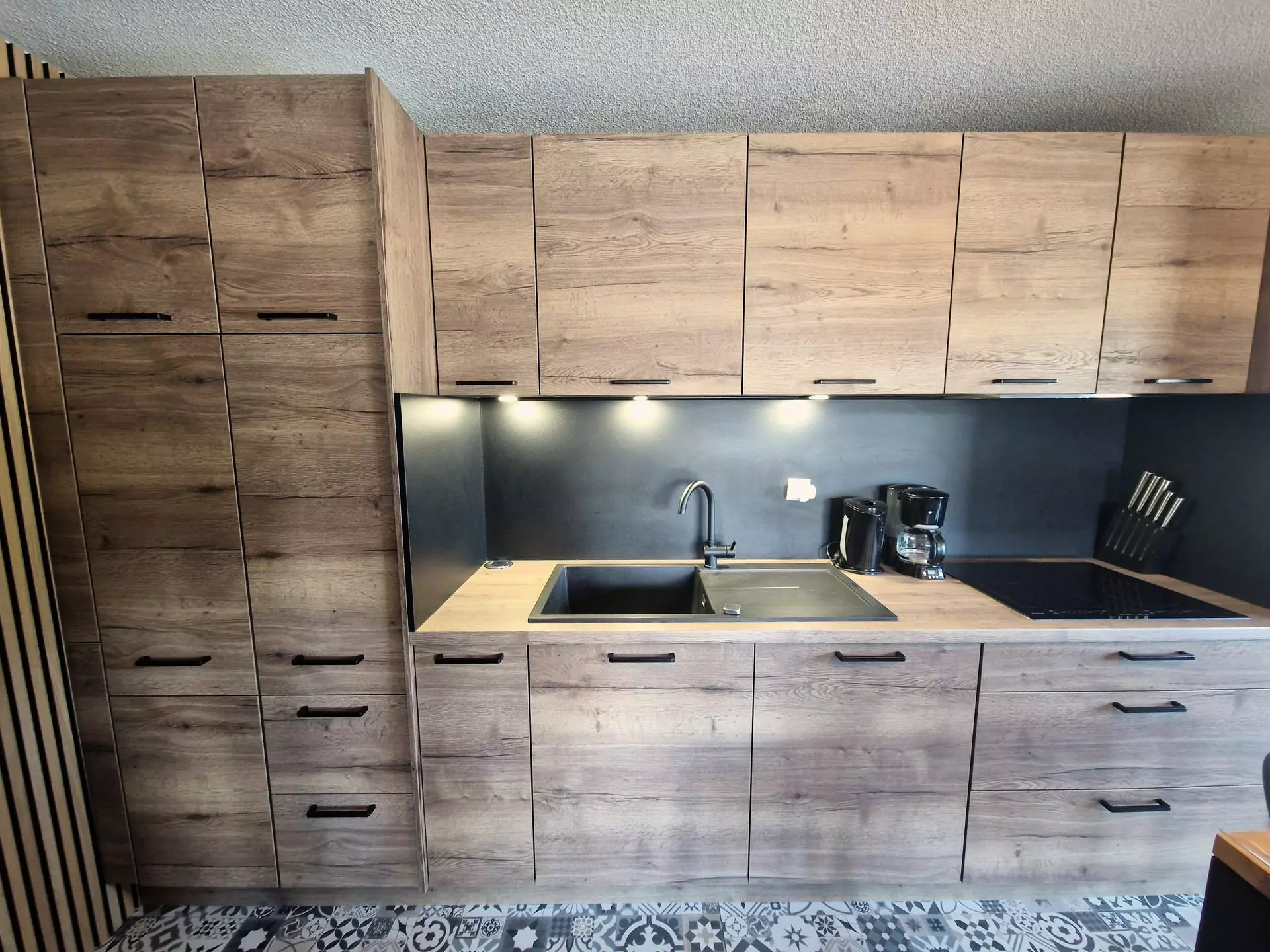 - Coin cuisine avec 4 plaques chauffantes, réfrigérateur, four, micro-ondes, lave-vaisselle et nombreux placards de rangement.