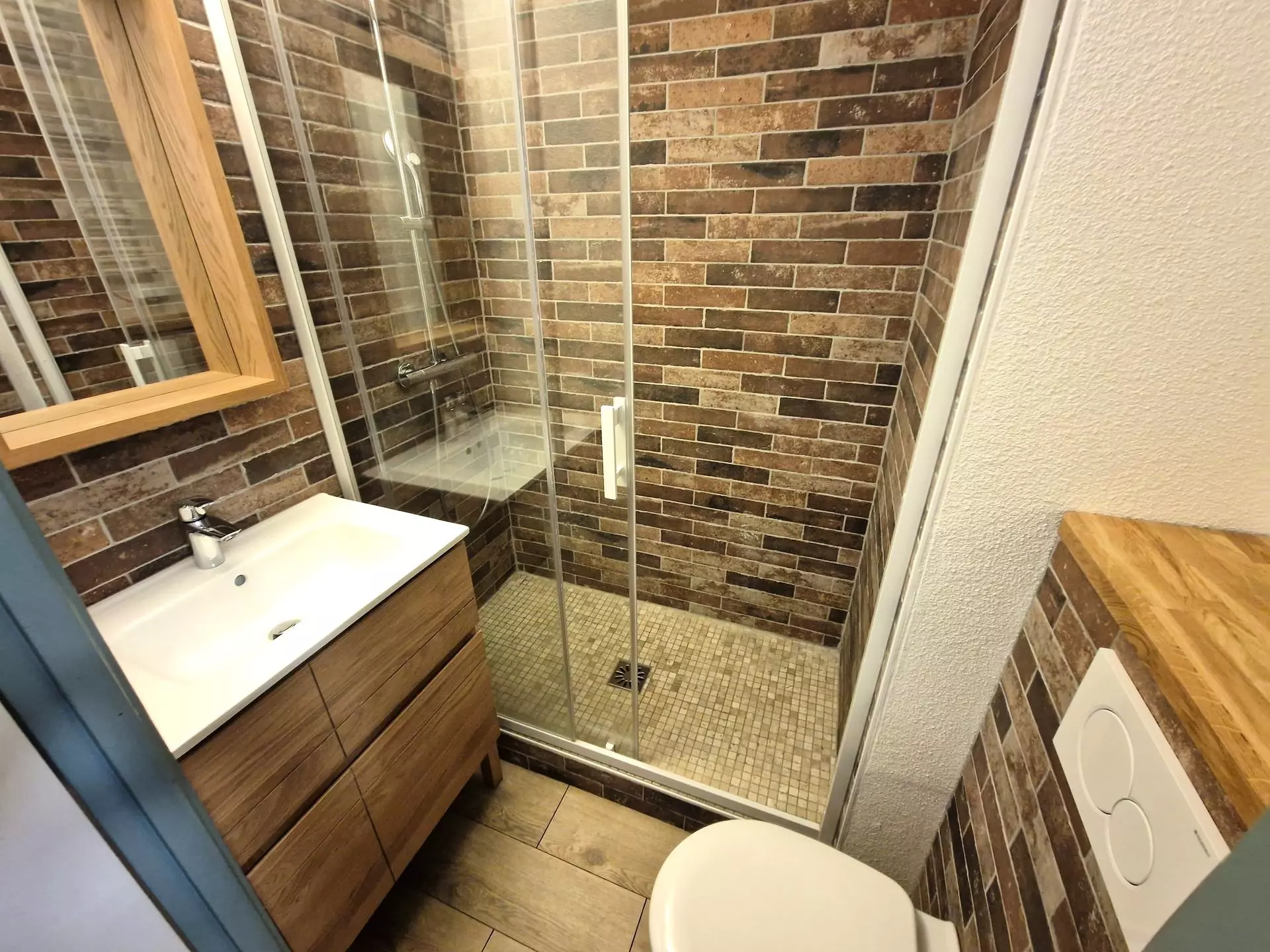 - 1 salle d'eau avec douche, lavabo et sèche-serviettes.