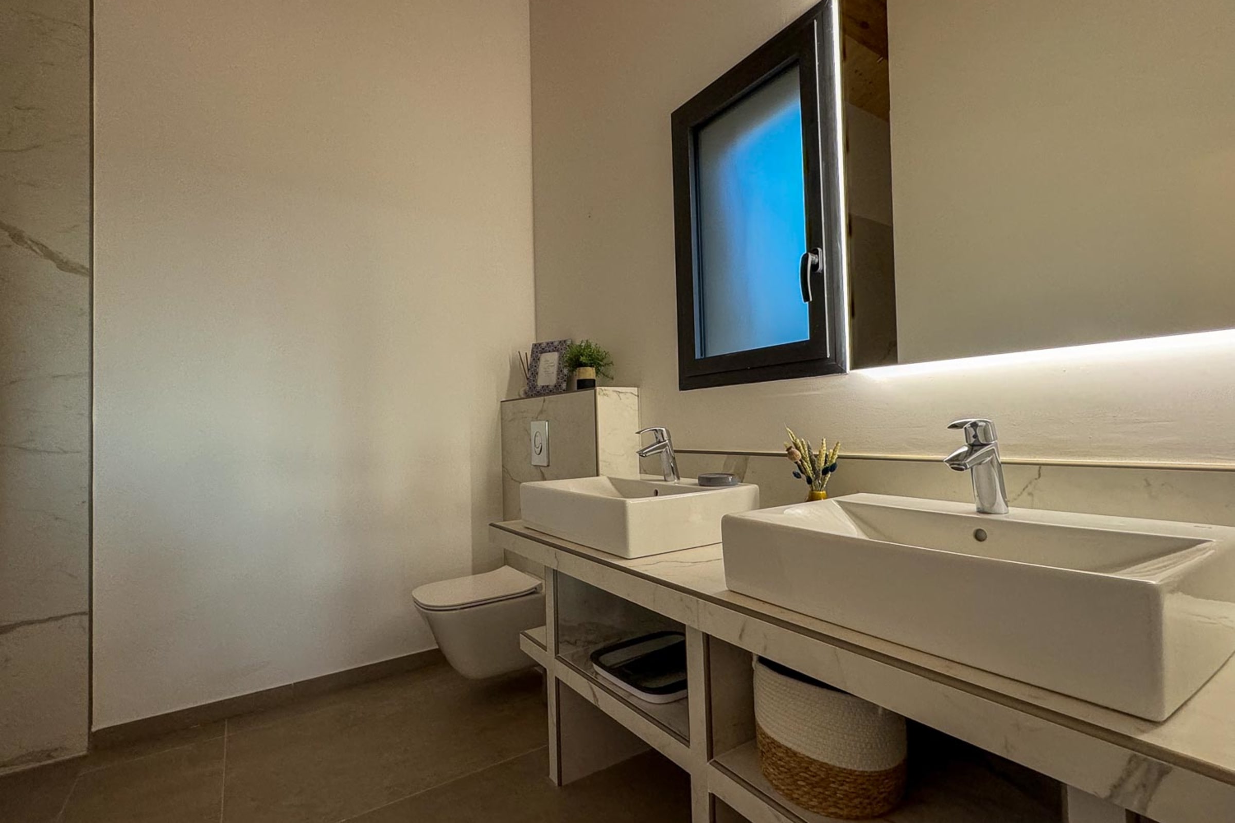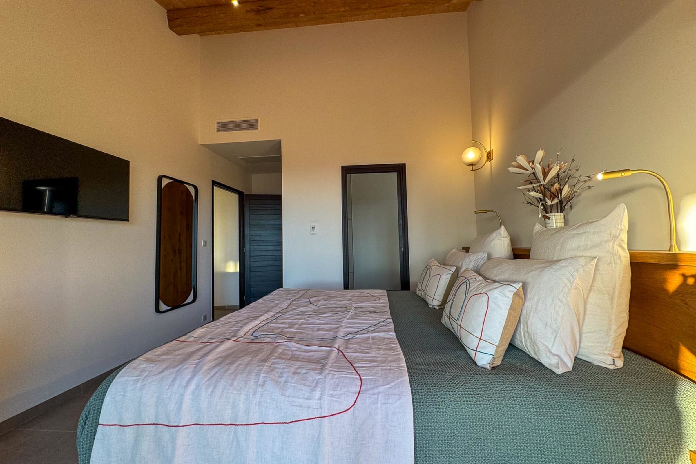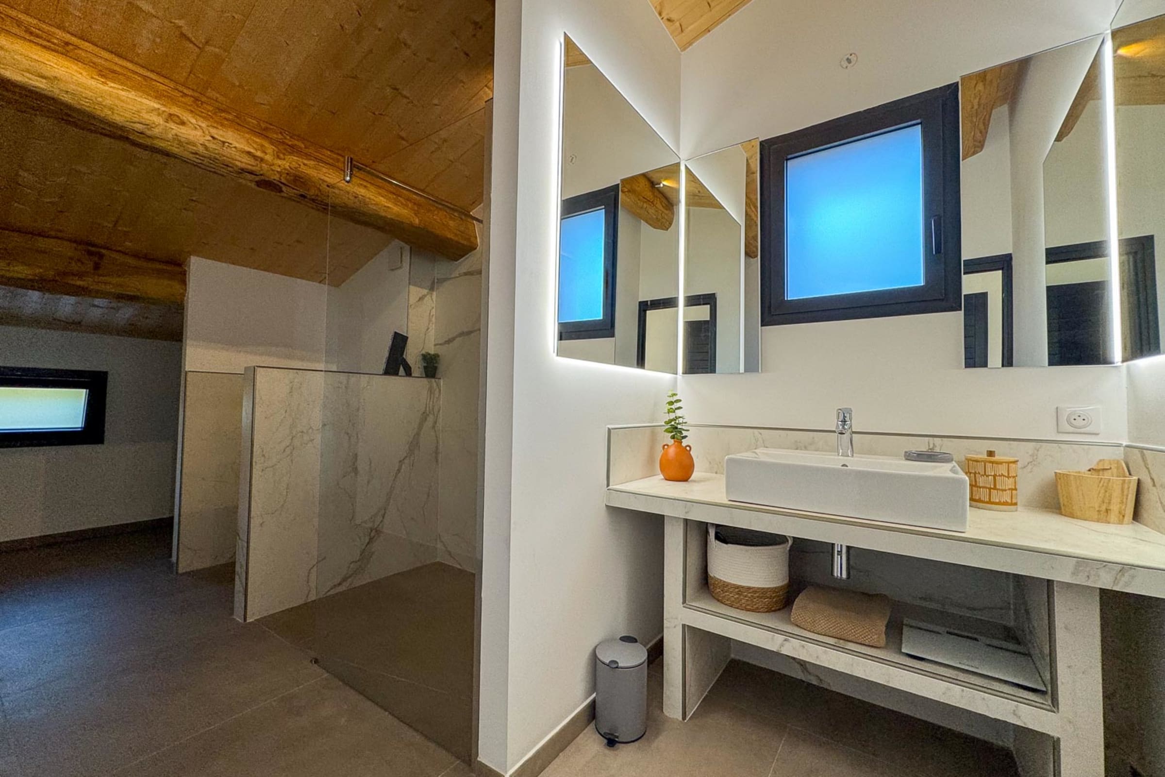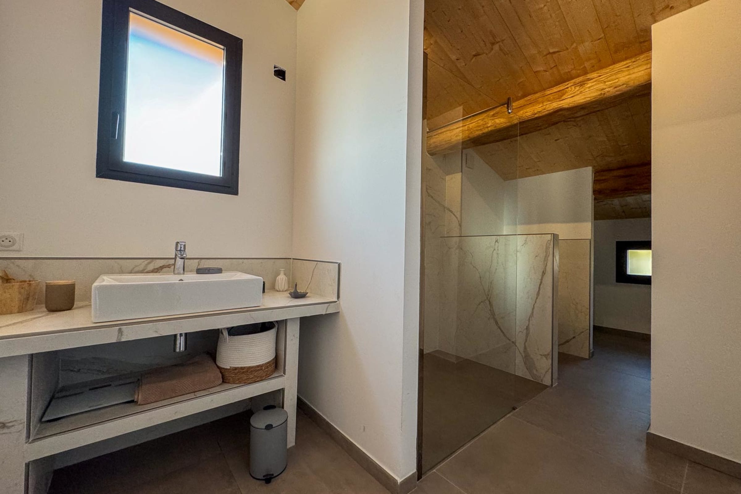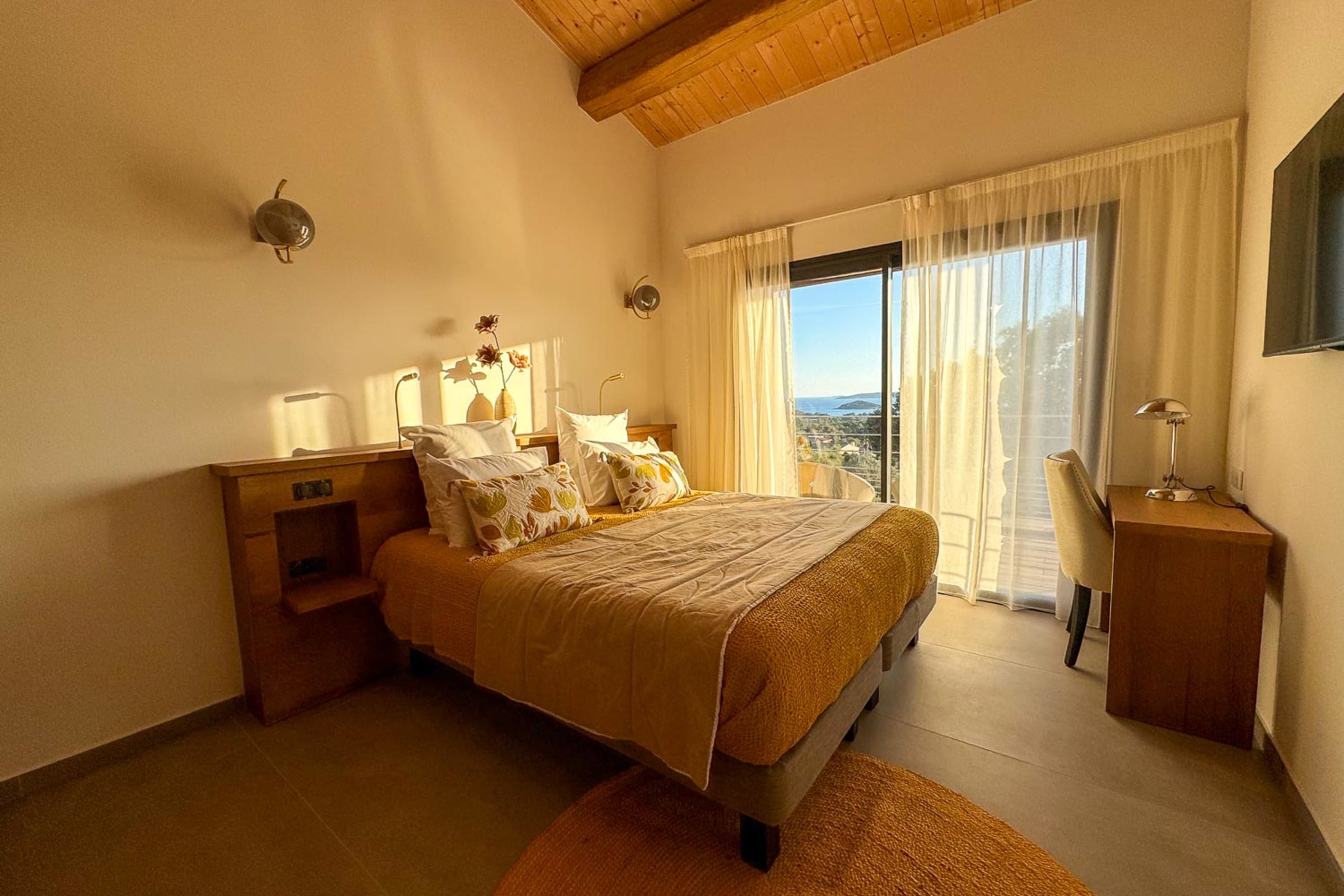 Étage : 2 chambres avec lits 180 cm, TV, salle de douche à l’italienne, ouvrant sur une terrasse avec vue mer.