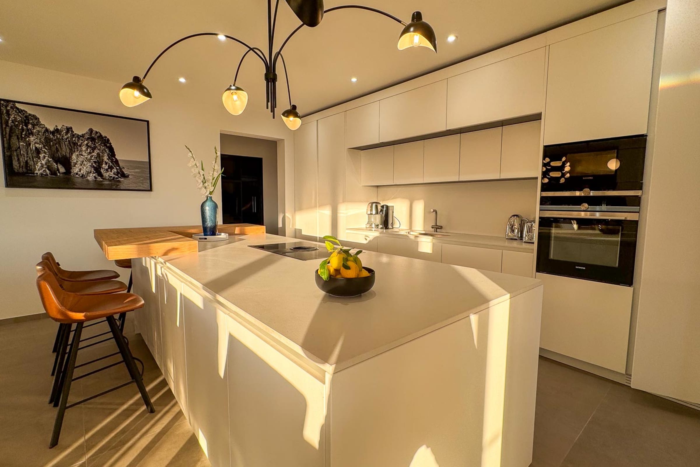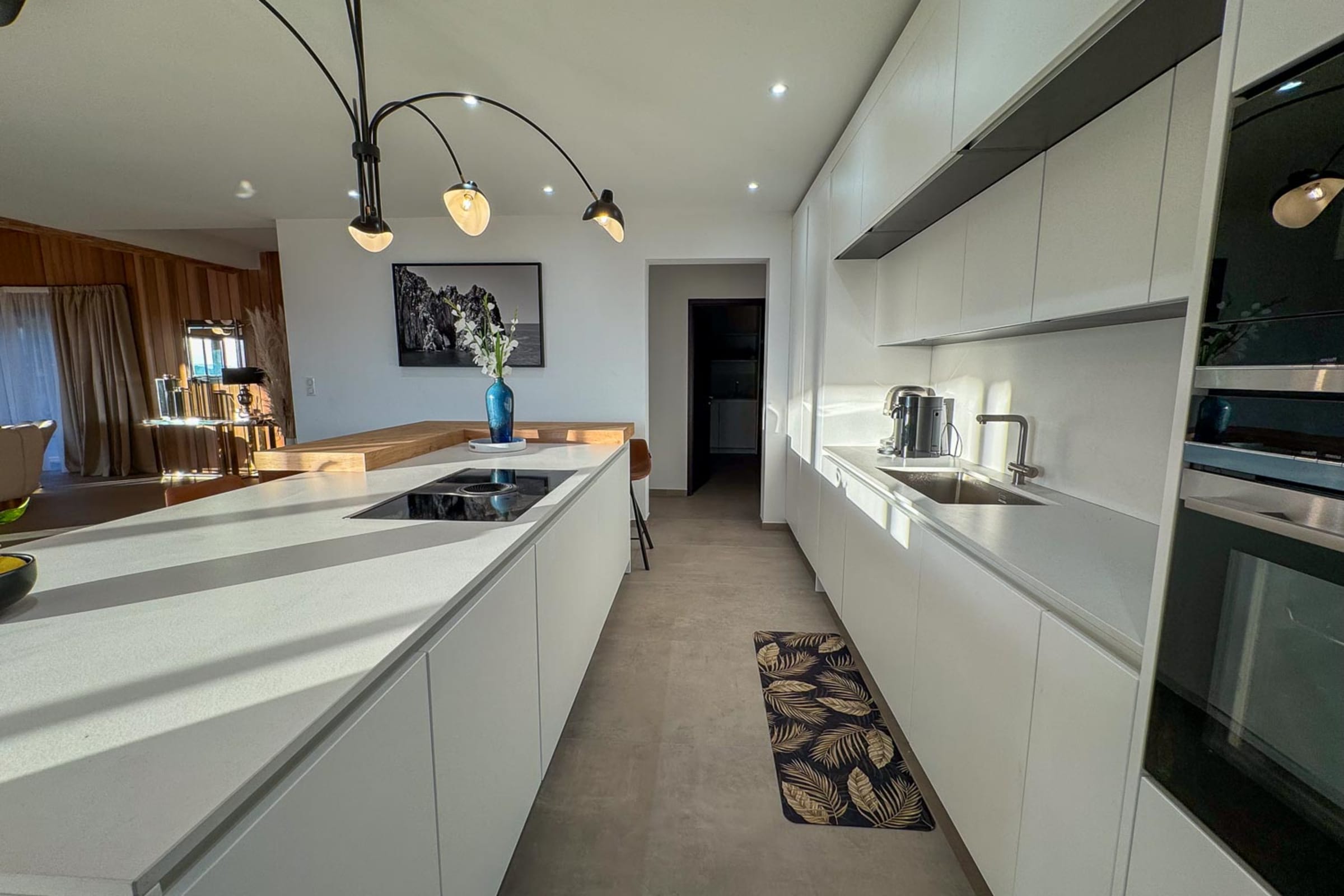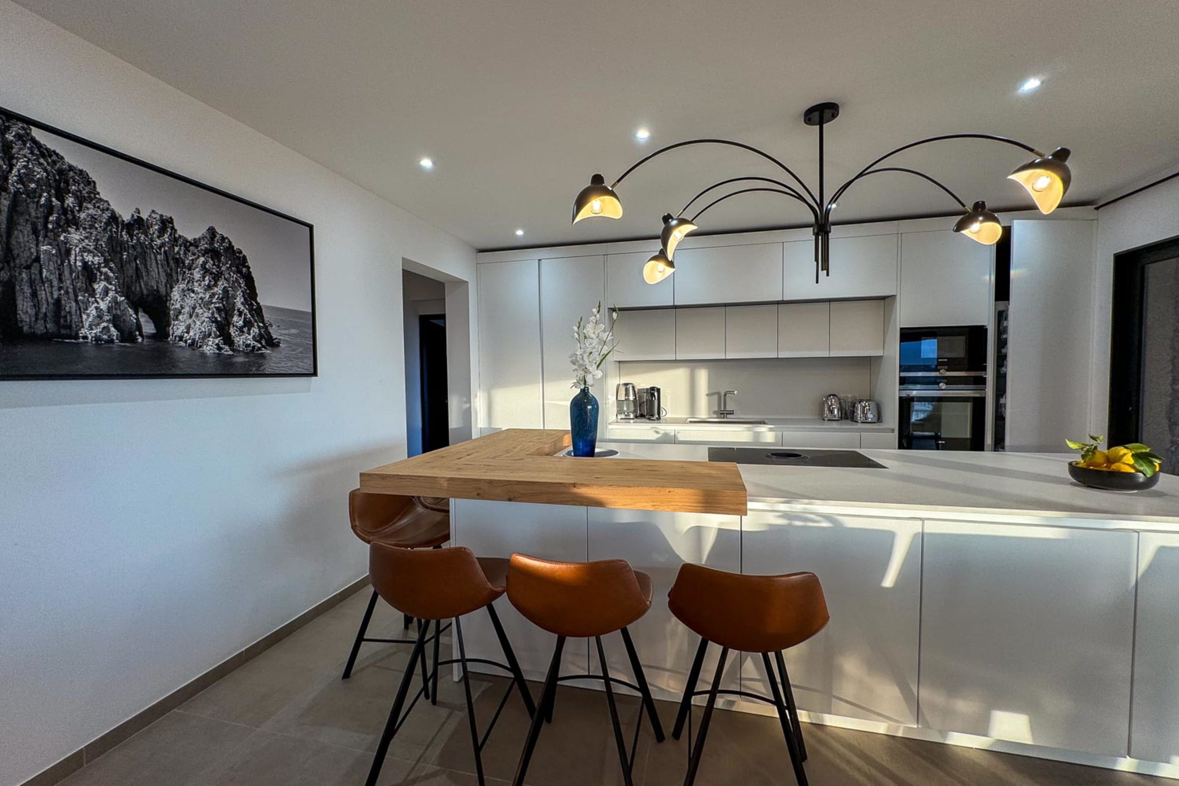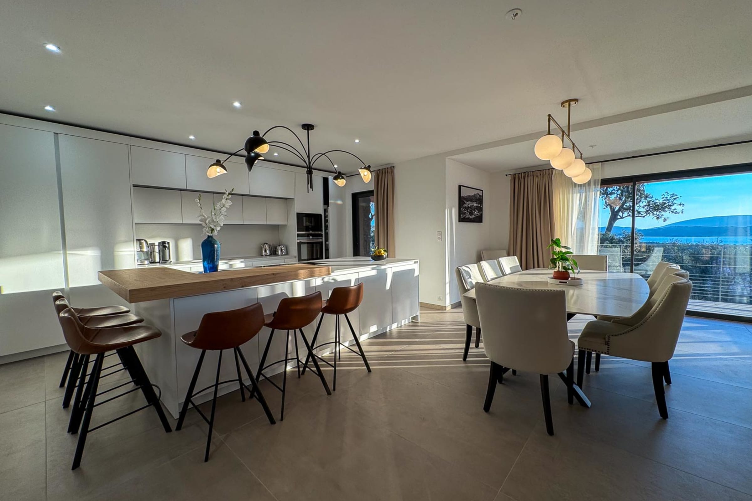 Cuisine moderne : Ouverte, avec îlot central, entièrement équipée (lave-vaisselle, four, micro-ondes, robots culinaires, machine Nespresso), complétée par un cellier et une buanderie.