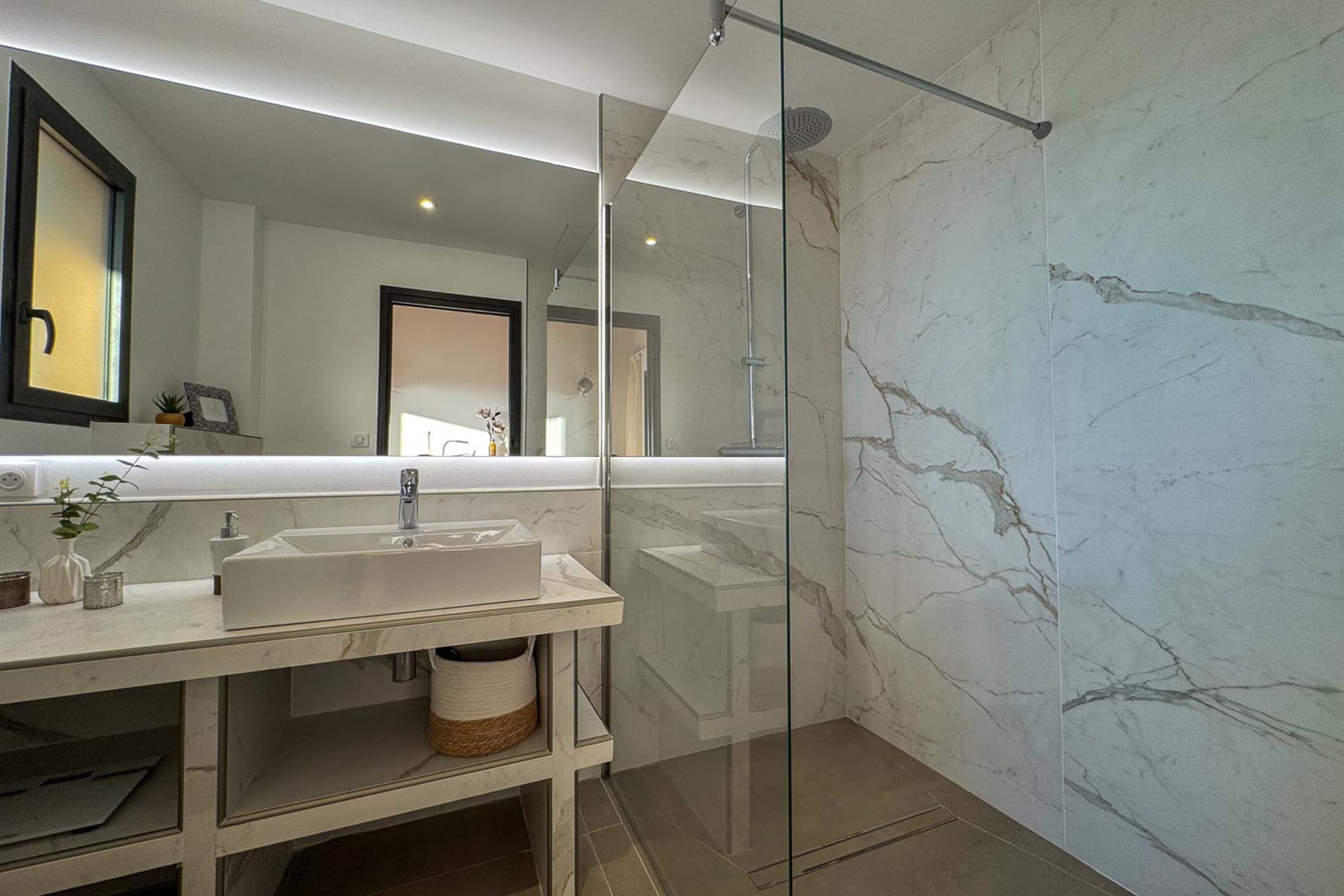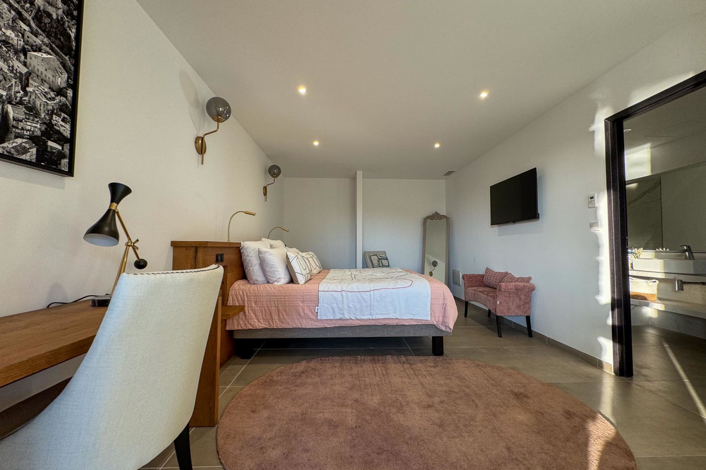 Rez-de-chaussée : 1 chambre en suite avec lit 180 cm, TV, salle de douche à l’italienne et WC, ouvrant sur la terrasse avec vue mer.