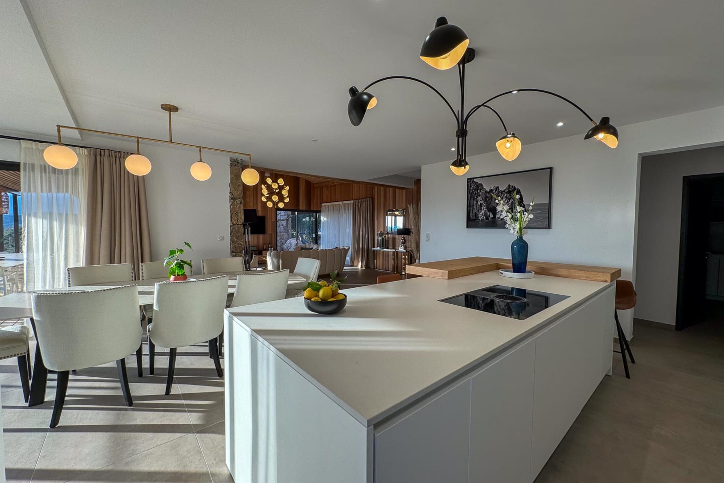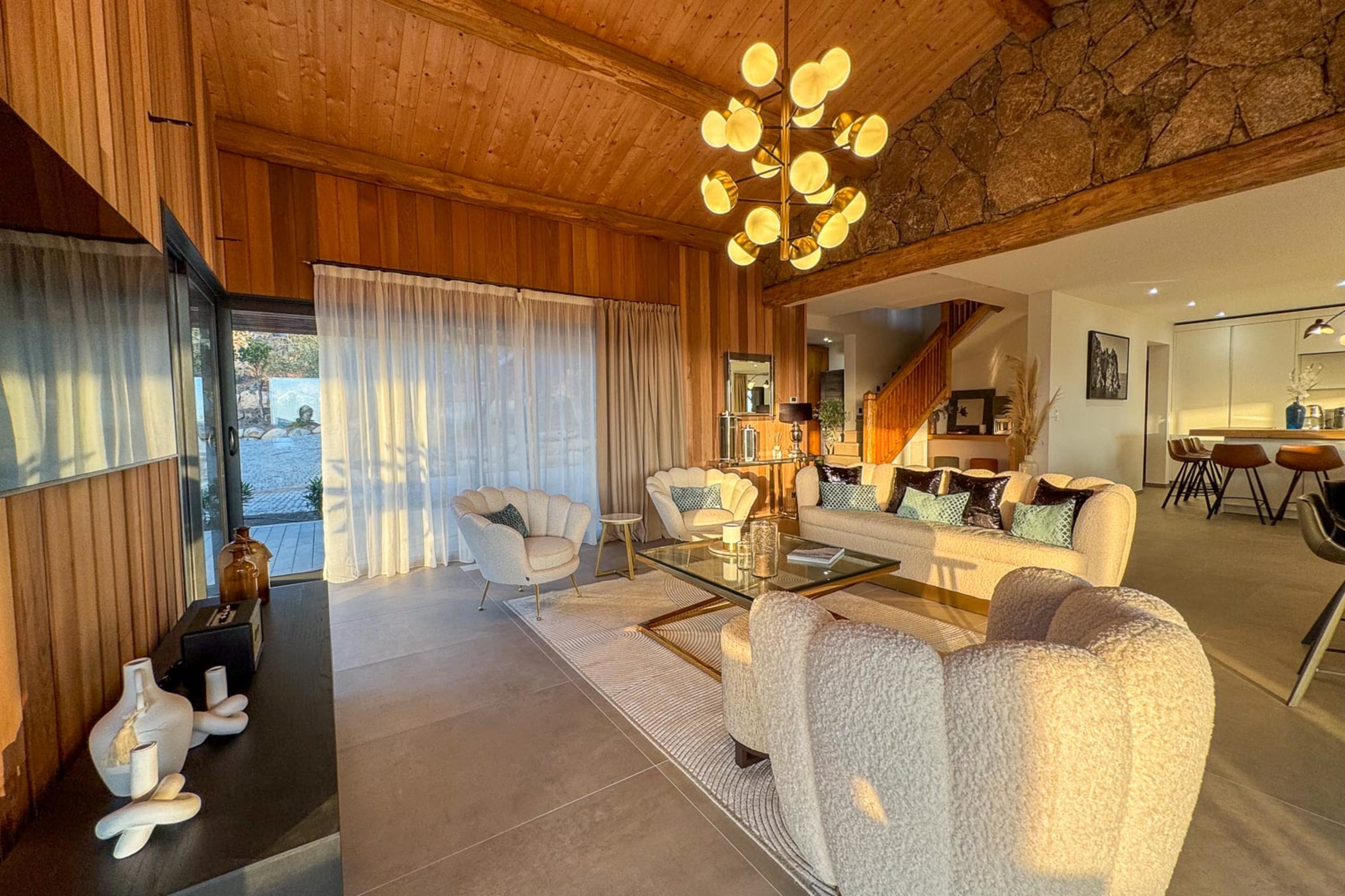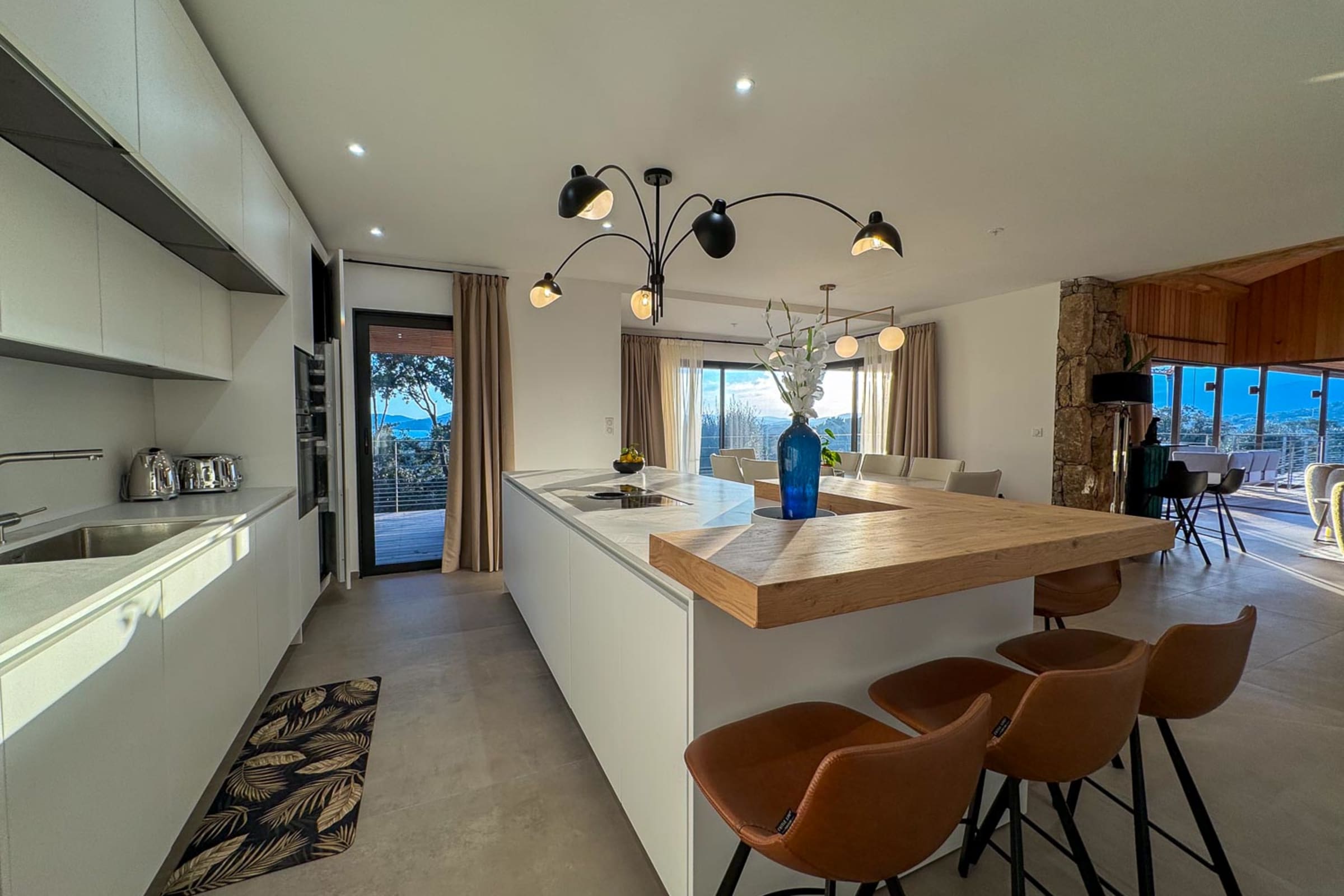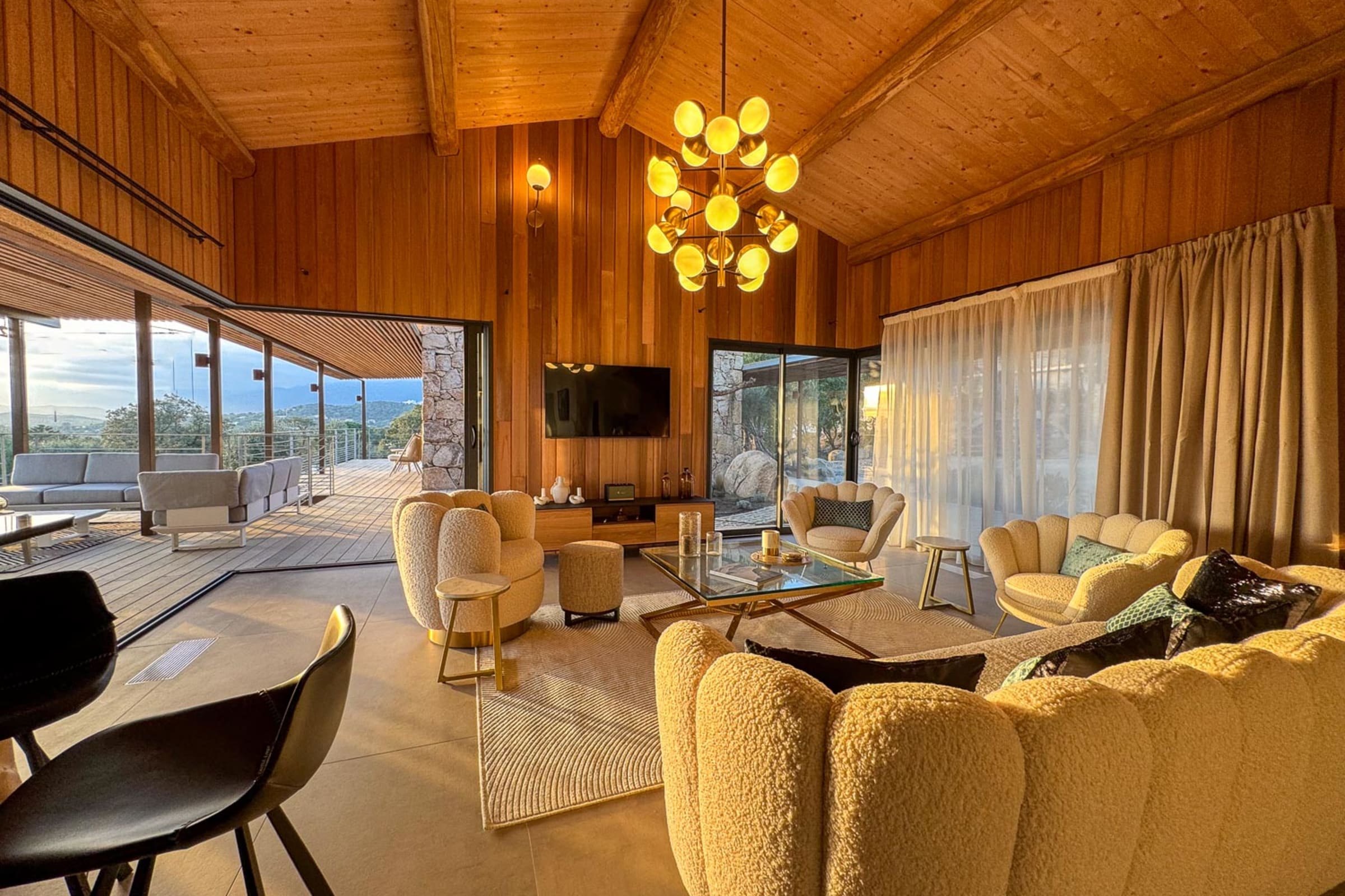 Salon et salle à manger : Spacieux, lumineux, avec de larges baies vitrées donnant sur la mer et ouvrant sur une terrasse abritée d’une pergola en bois, équipée d’un espace lounge et d’une salle à manger extérieure.