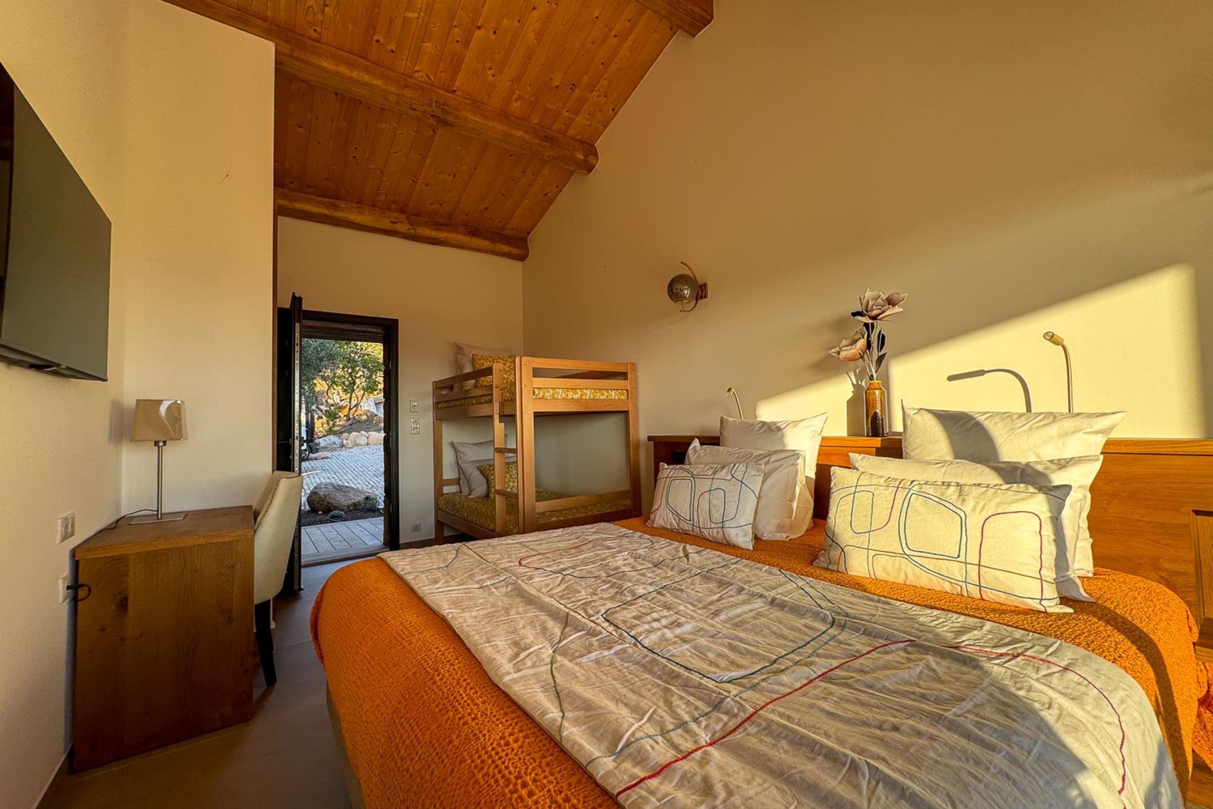 Chambre n°5 : lit 180 cm + lit superposé, salle de douche à l’italienne, terrasse privée.
