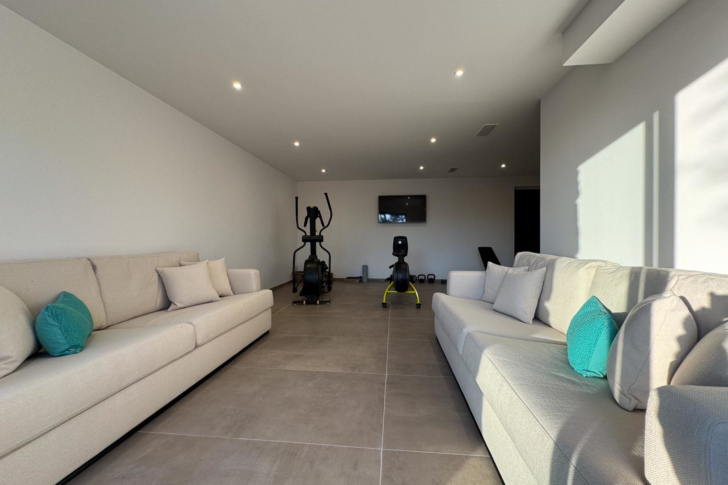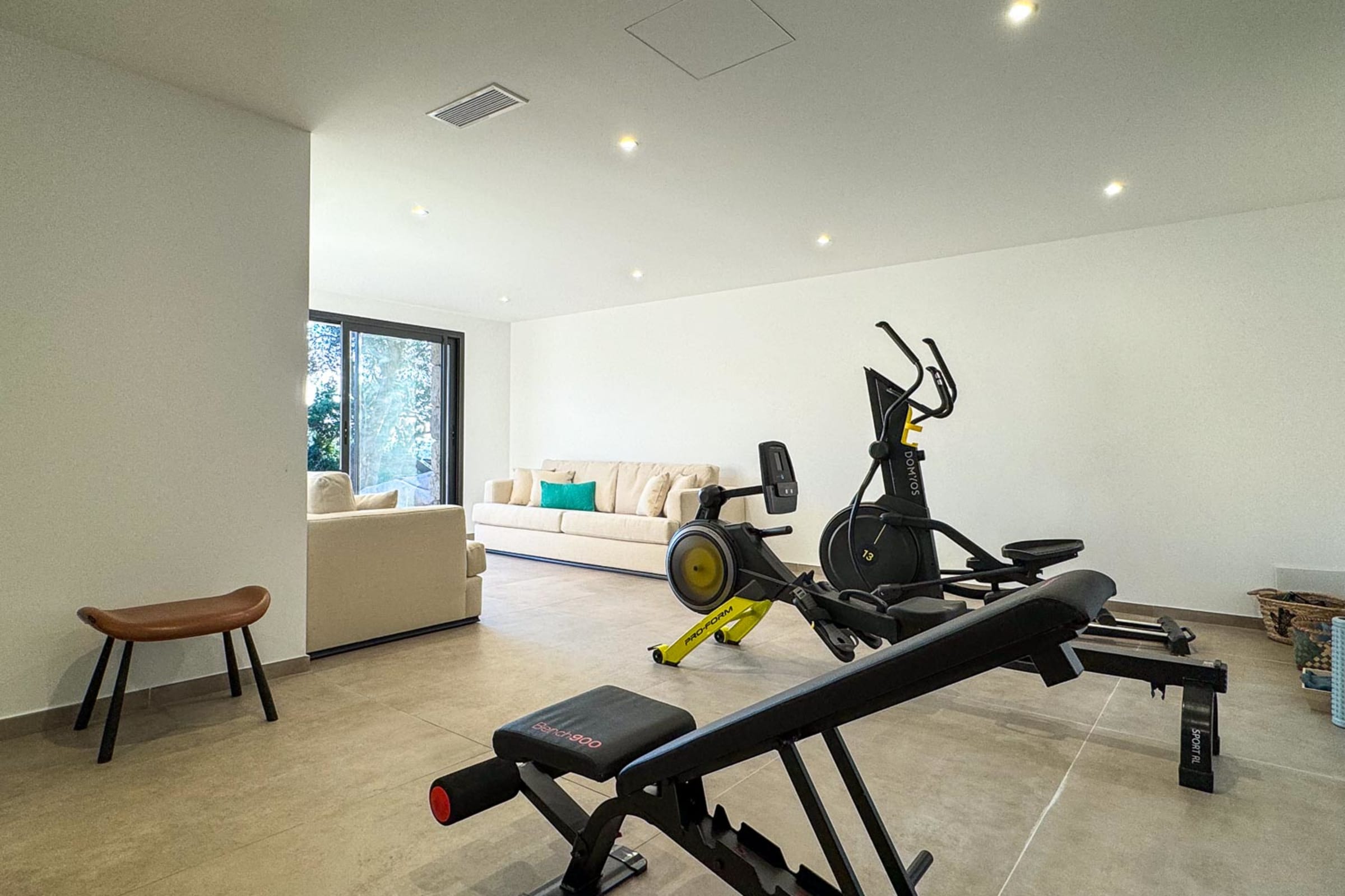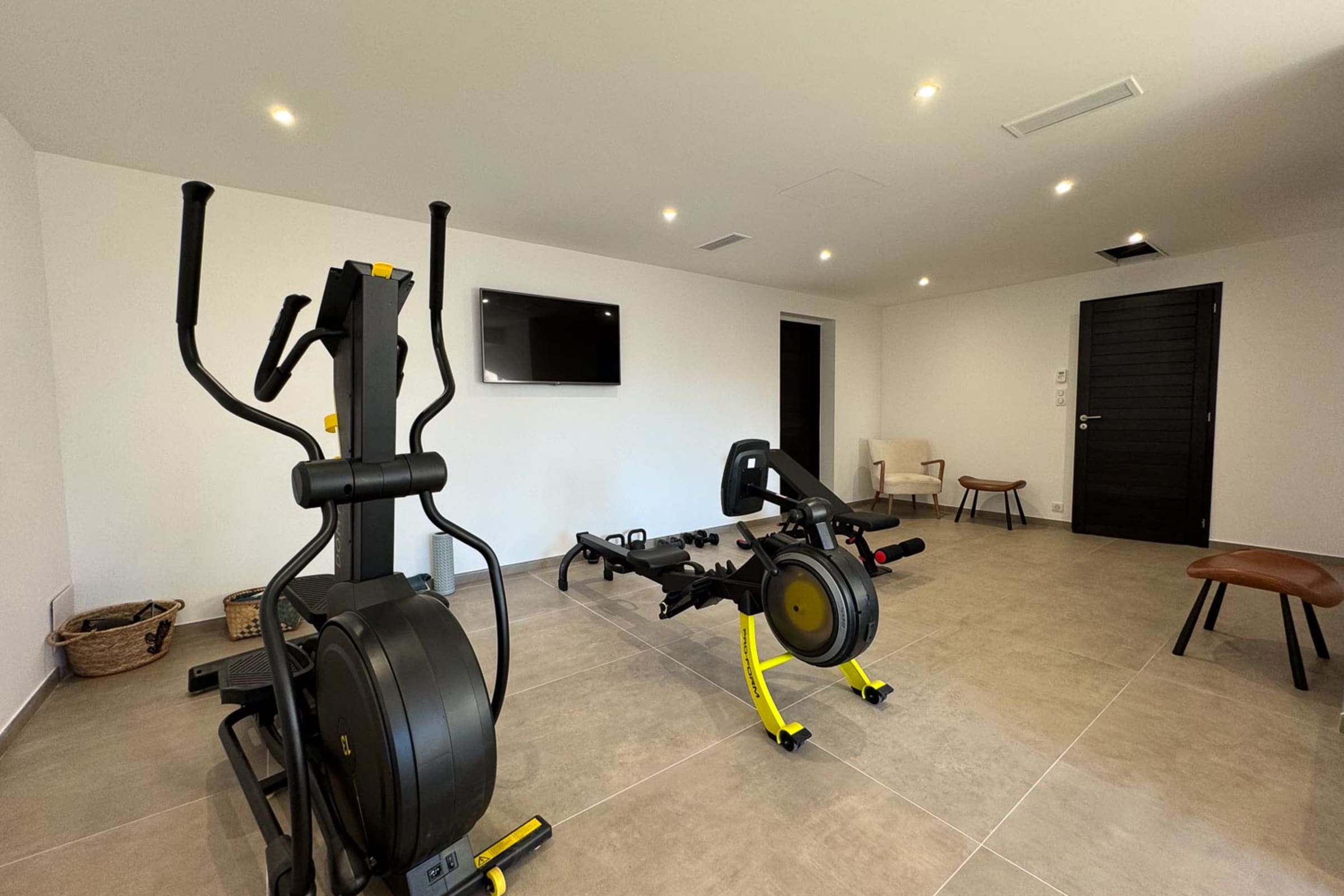 Loisirs intérieurs : Salle de sport équipée (rameur, vélo elliptique, banc et poids), table de ping-pong, salle de cinéma privée.