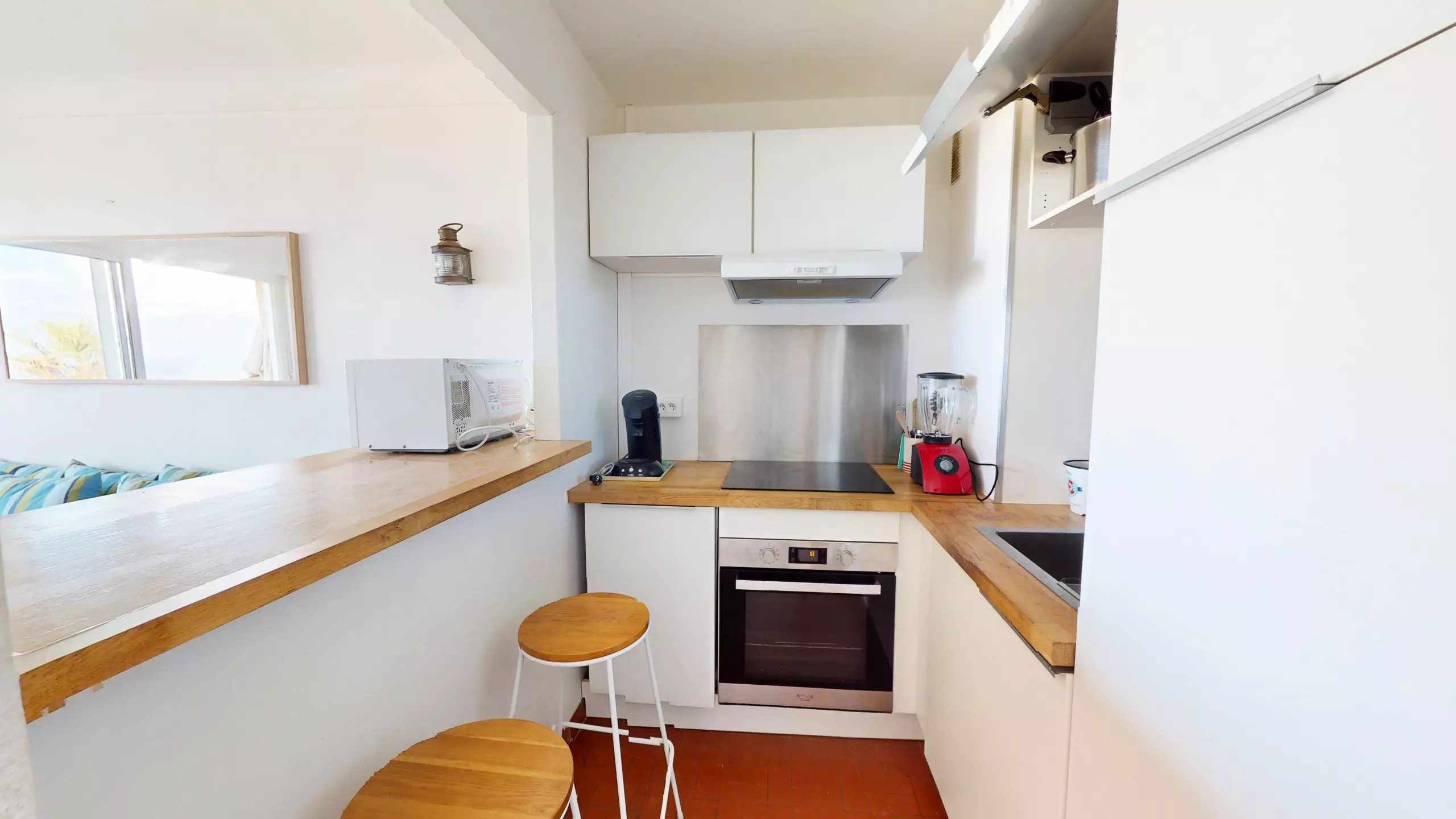 La cuisine entièrement équipée en plan ouvert donne sur l'espace de vie, avec un accès direct à un balcon offrant une vue mer imprenable.