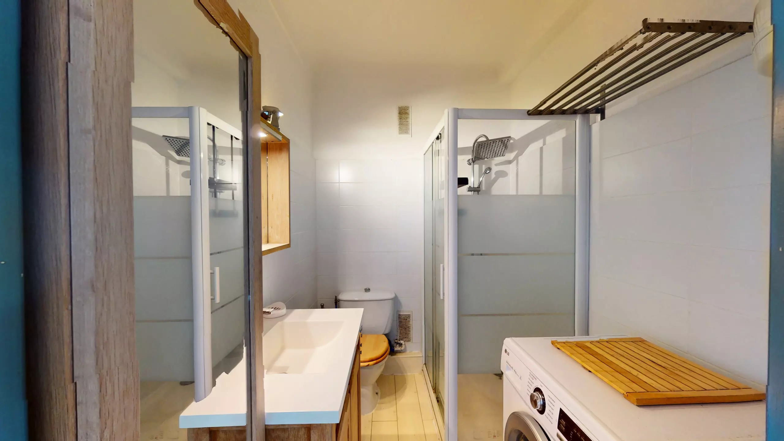 Il comprend une salle de douche avec douche, lavabo et toilettes.