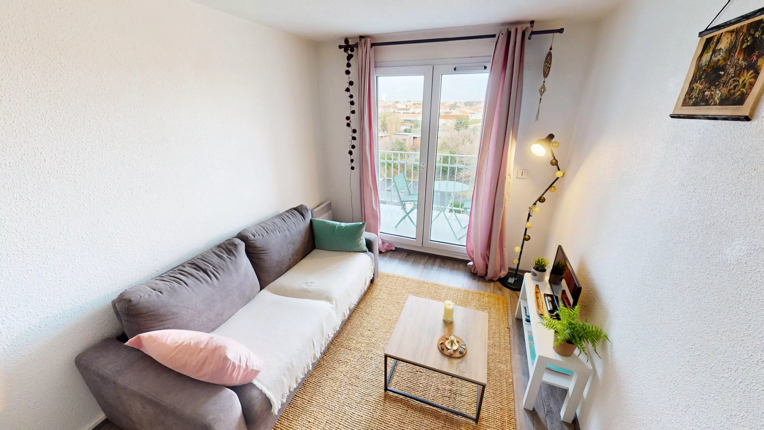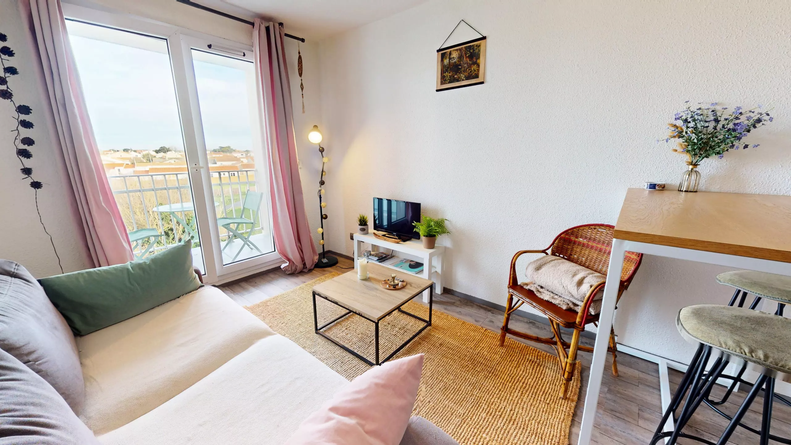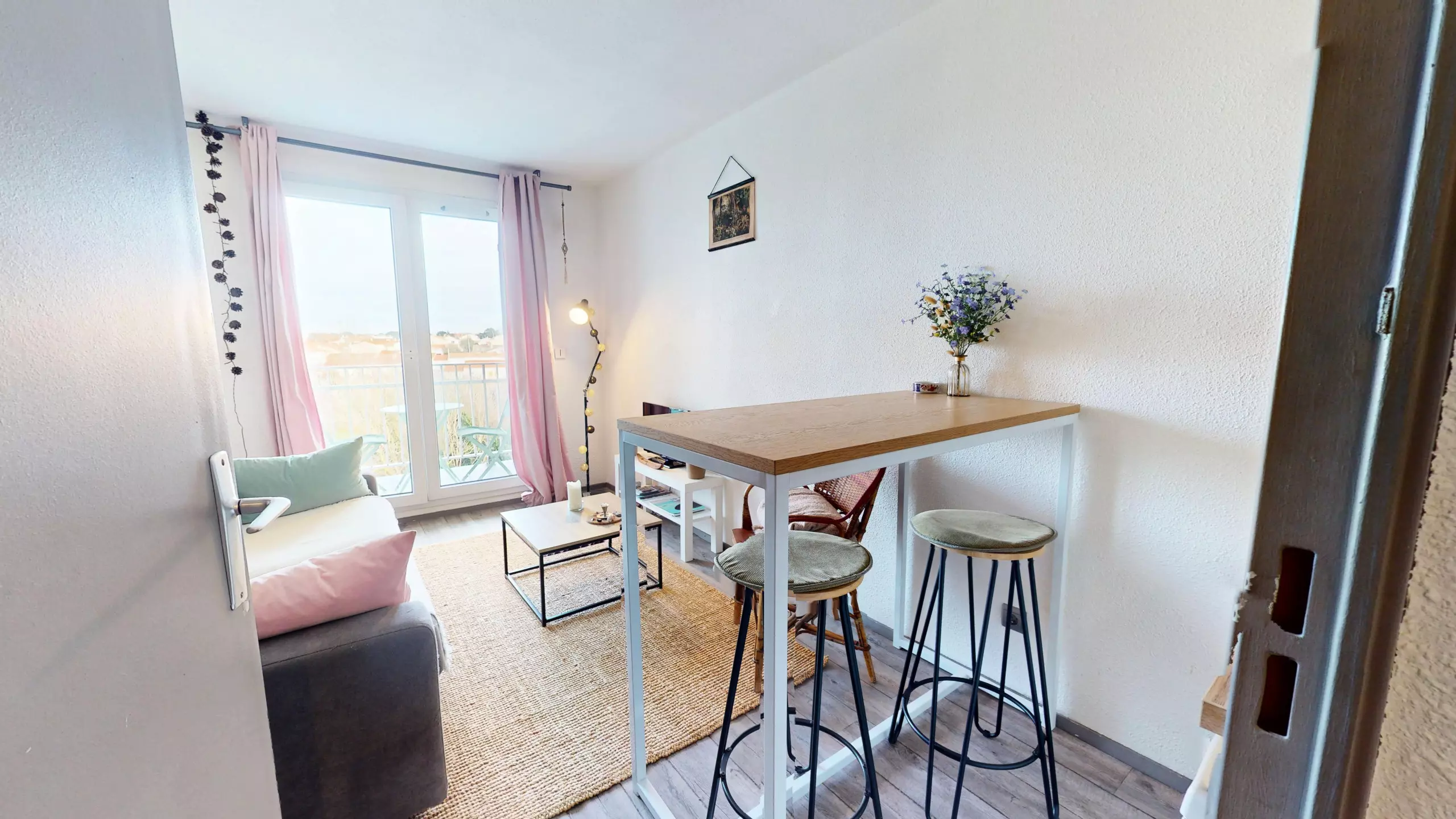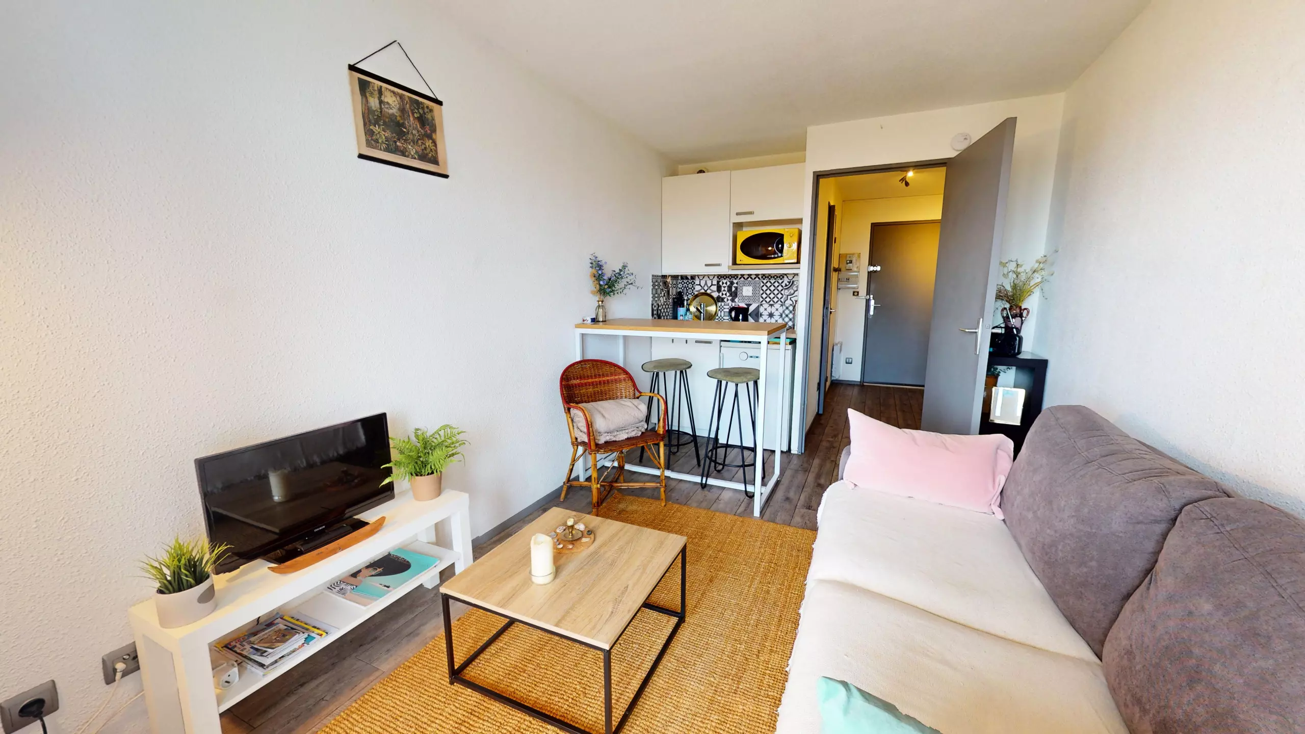 Dès l’entrée, vous découvrez une très belle pièce de vie lumineuse, aménagée avec une table haute et ses tabourets pour vos repas. Le salon cosy est équipé d’une télévision et d’un canapé-lit double 140x190, idéal pour des nuits confortables.
