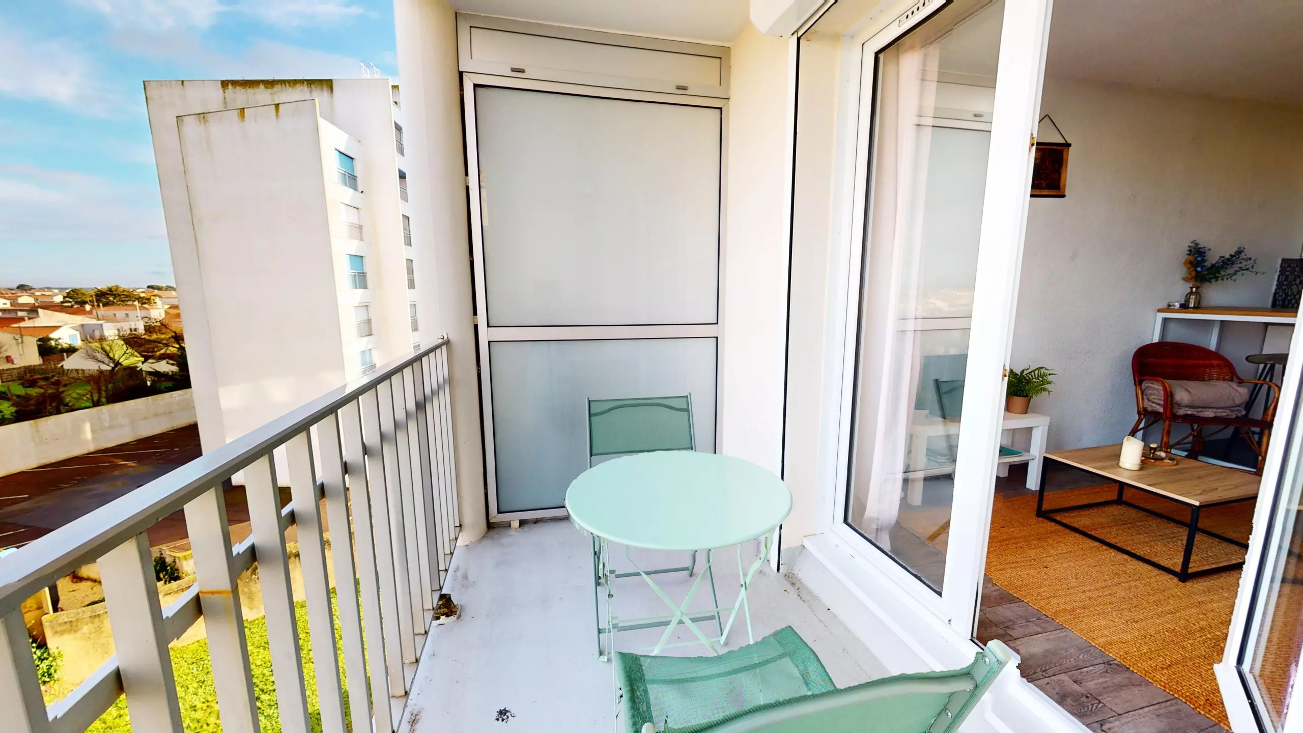 Le studio dispose d’un balcon aménagé avec une table et deux chaises, très mignon, offrant une vue sur les maisons, idéal pour vos petits-déjeuners ou vos moments de détente au grand air.