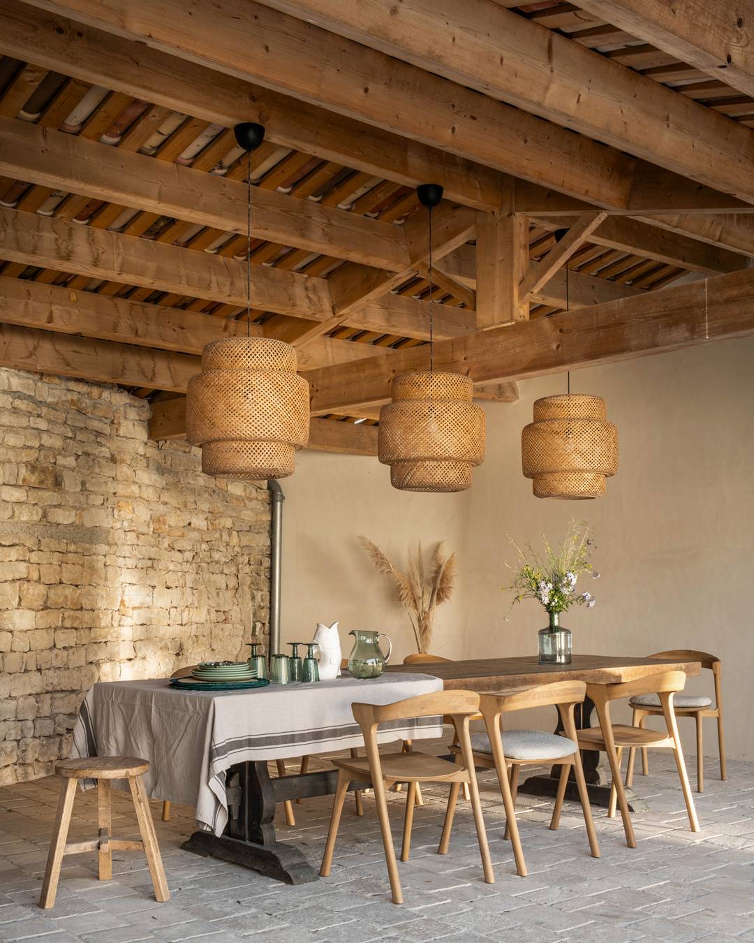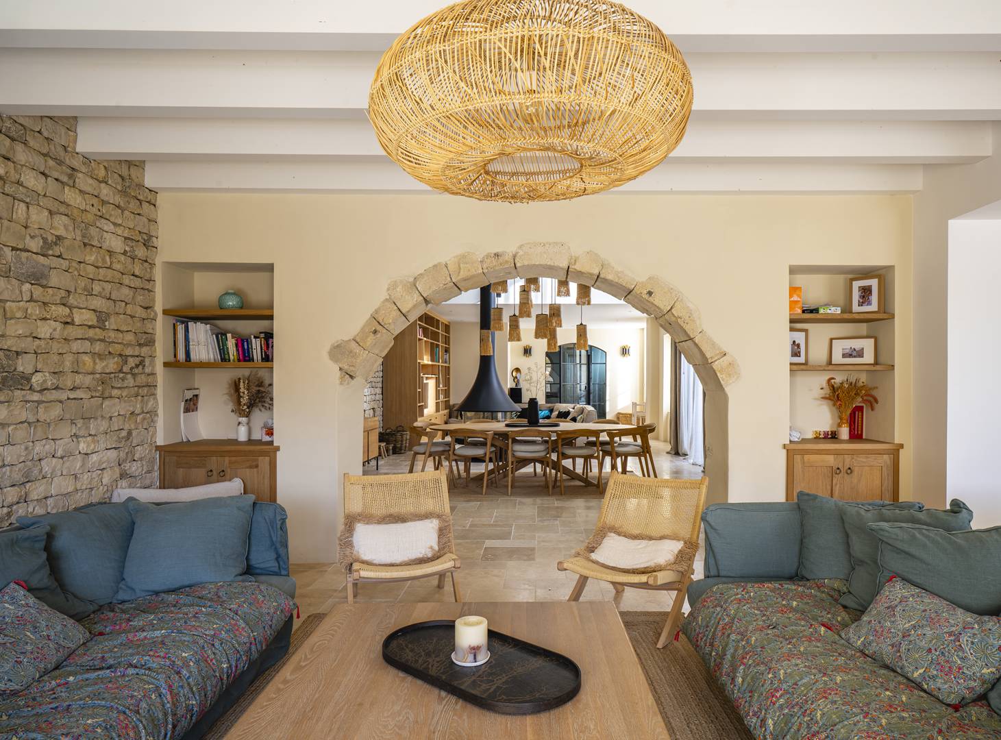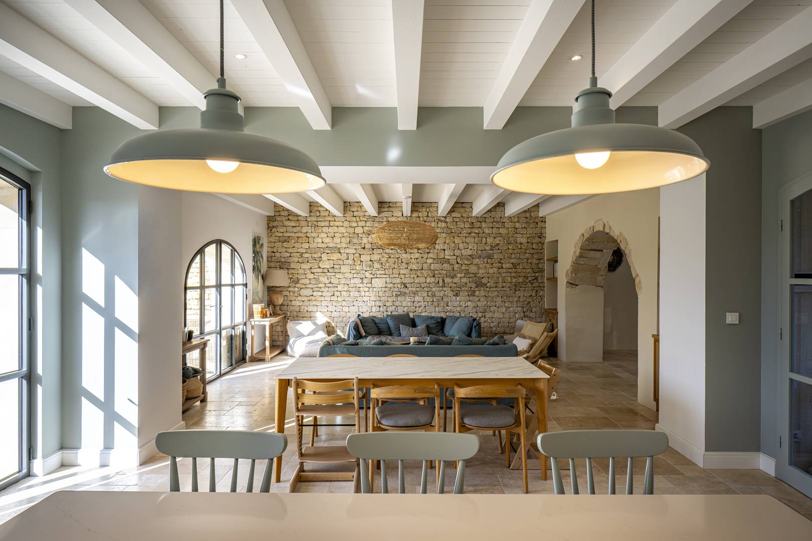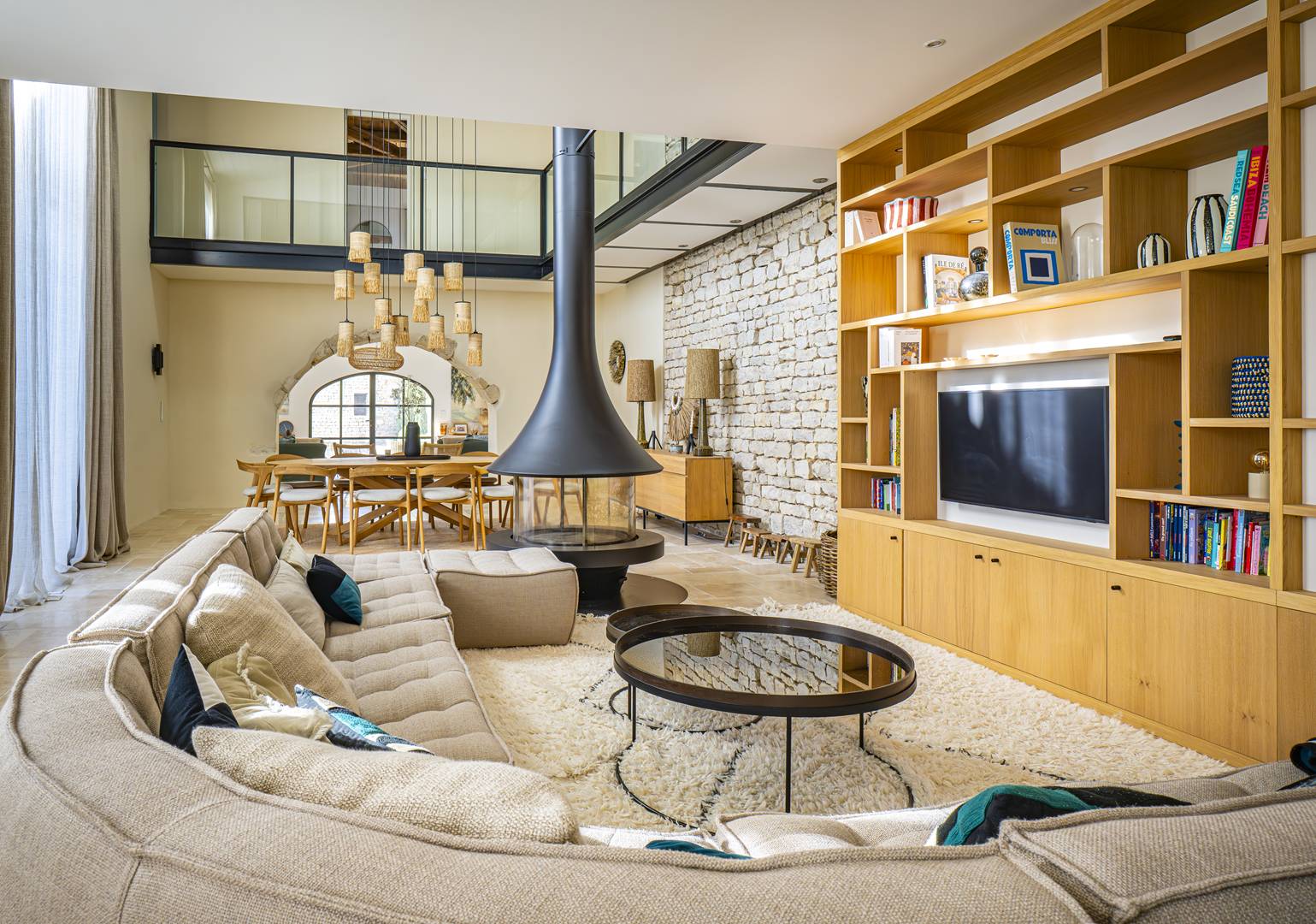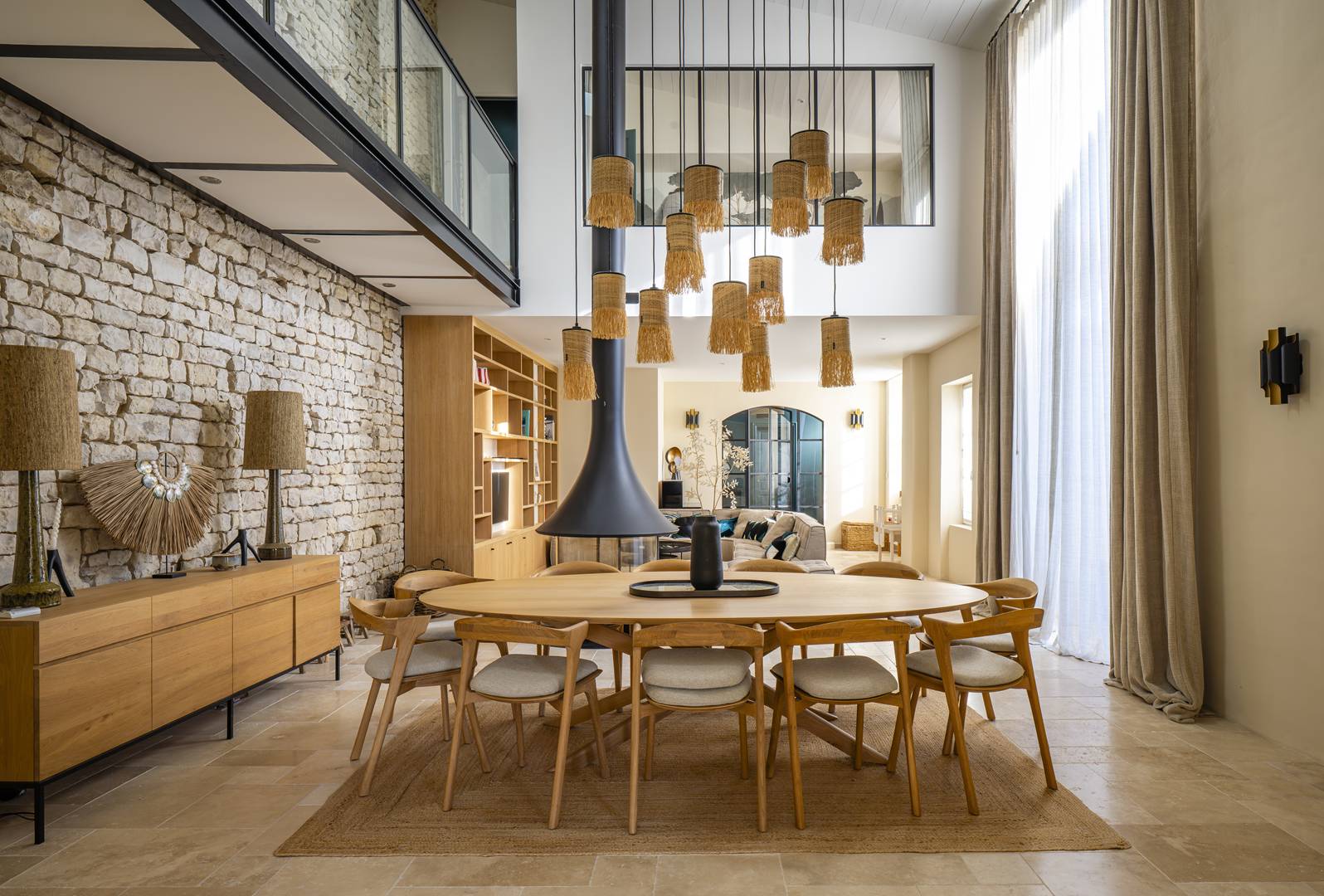 Un grand salon lumineux ouvert sur l’extérieur, comprenant un espace repas pour 12 convives et un luxueux salon
