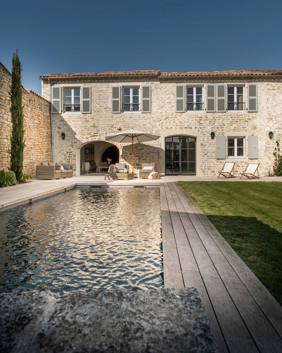 La villa principale dispose de 5 chambres, 2 salles de bain, une salle d'eau et 3 WC, répartis harmonieusement en deux ailes pour préserver l'intimité de chacun tout en profitant du bonheur d'être ensemble.