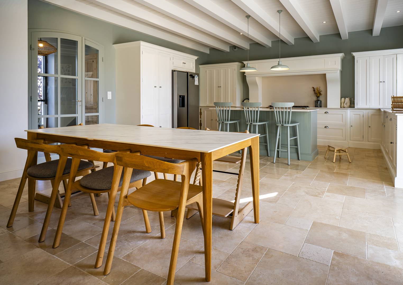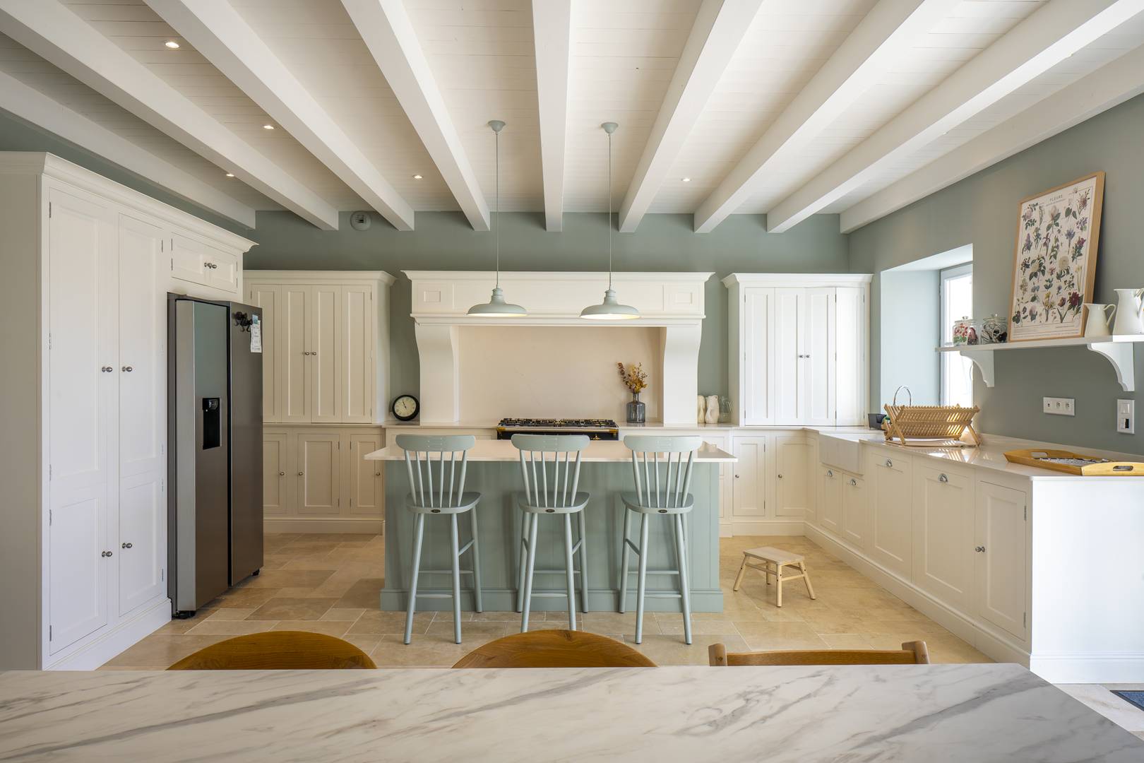 Une cuisine américaine moderne entièrement équipée, avec un Îlot central et 3 tabourets de bar