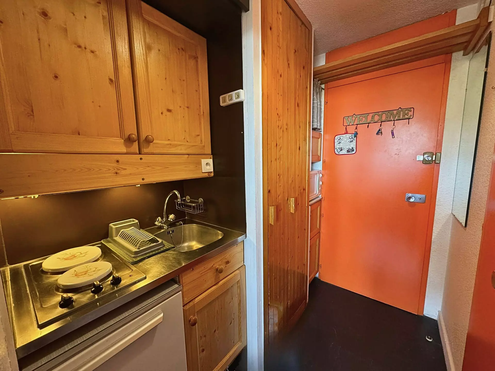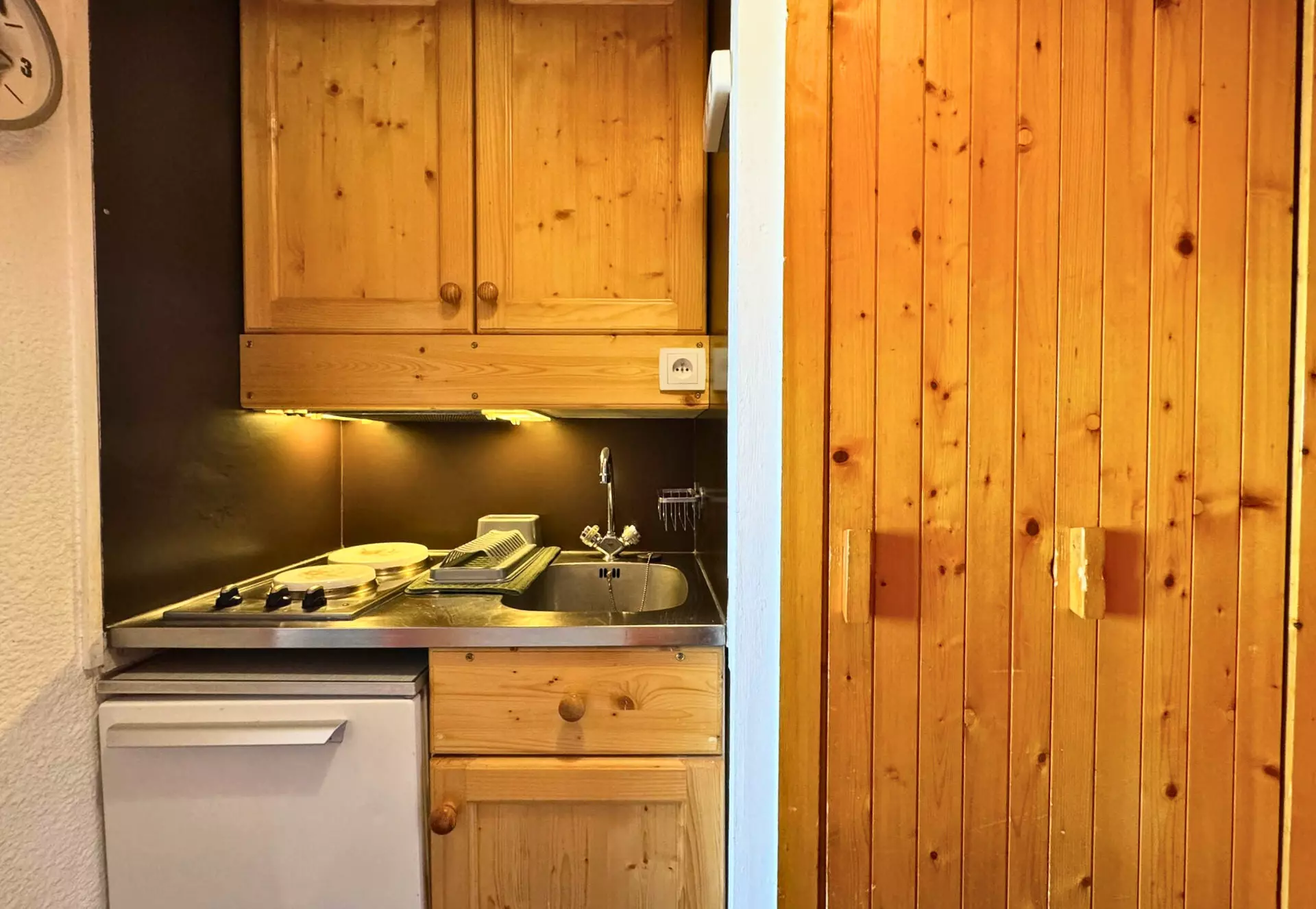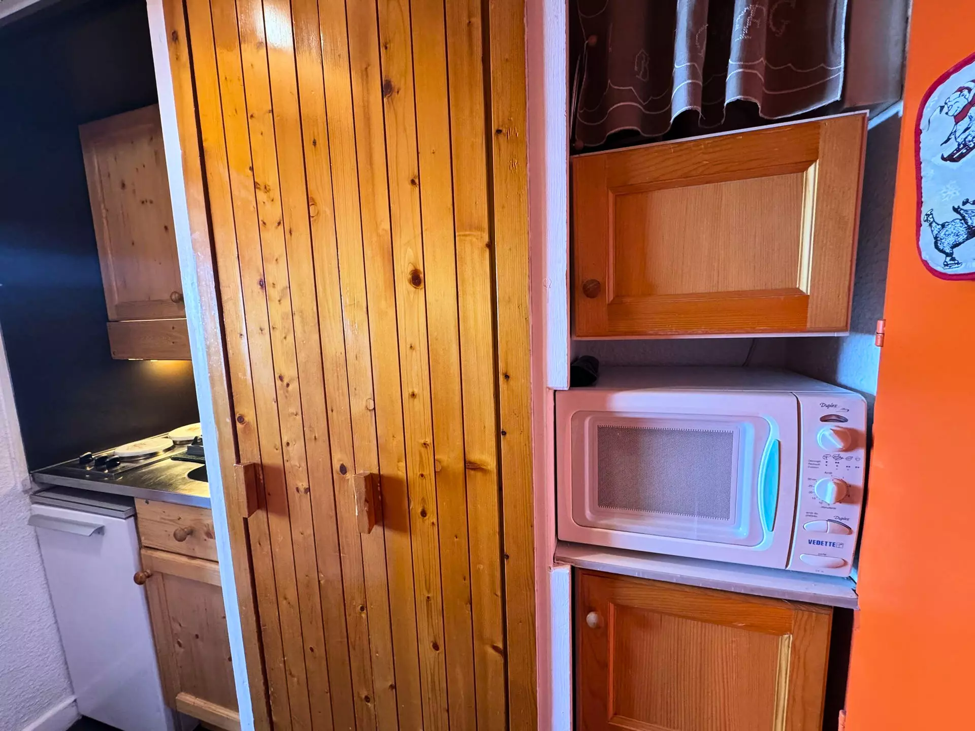 Cuisine : plaques de cuisson électriques (x2), micro-ondes, réfrigérateur, bouilloire, cafetière (Senseo), appareil à raclette (6pers.)