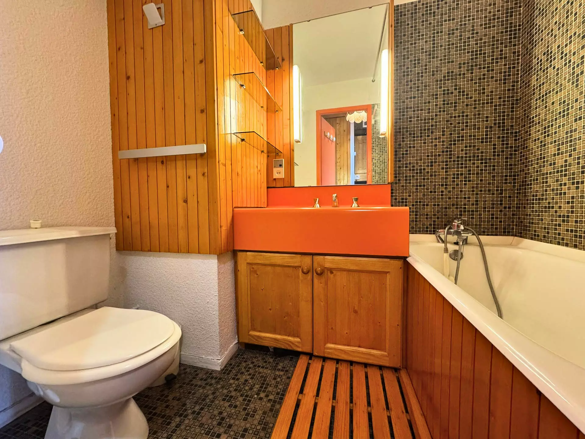 Salle de bain : lavabo, baignoire, toilettes