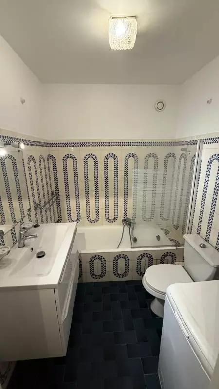 - Salle de bain avec baignoire, lavabo, machine à laver le linge, étendoir, WC