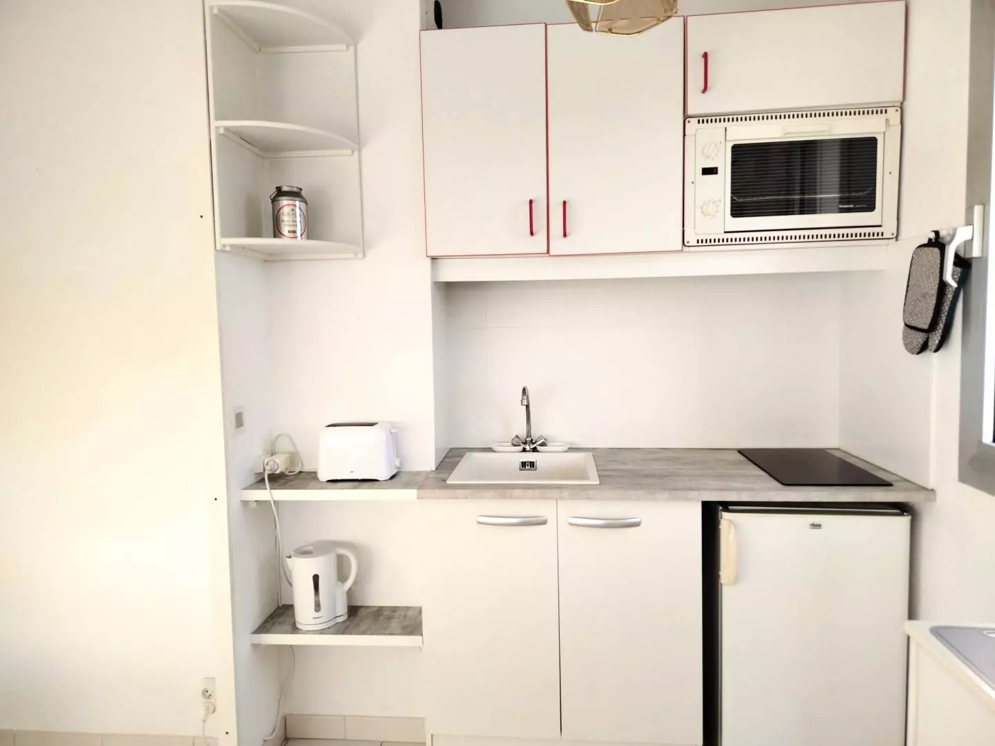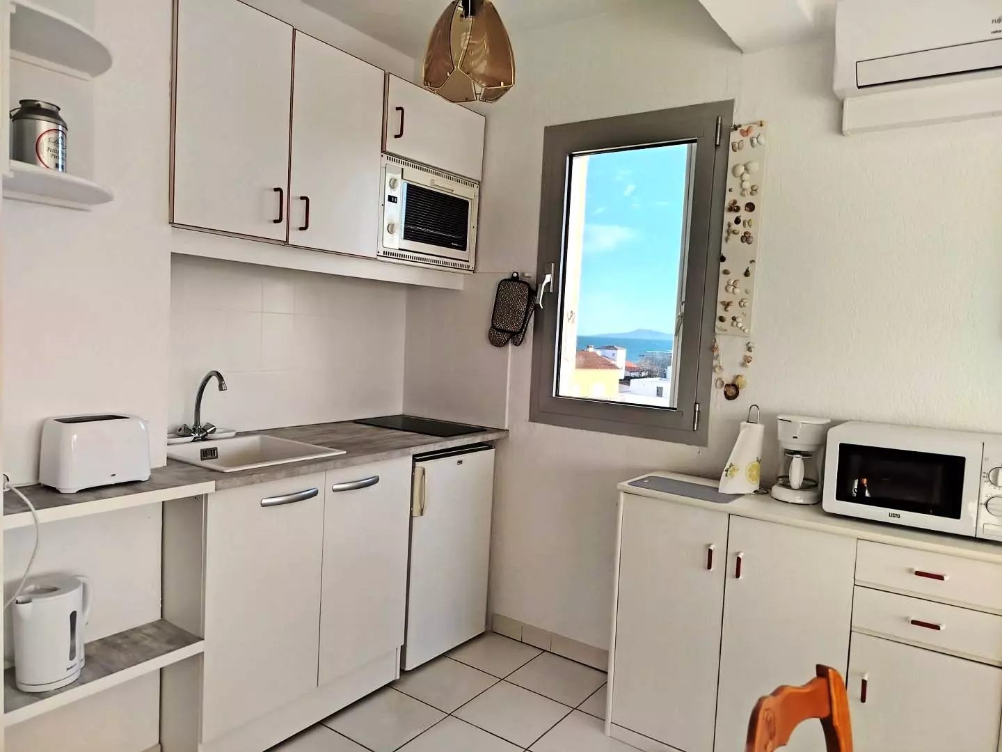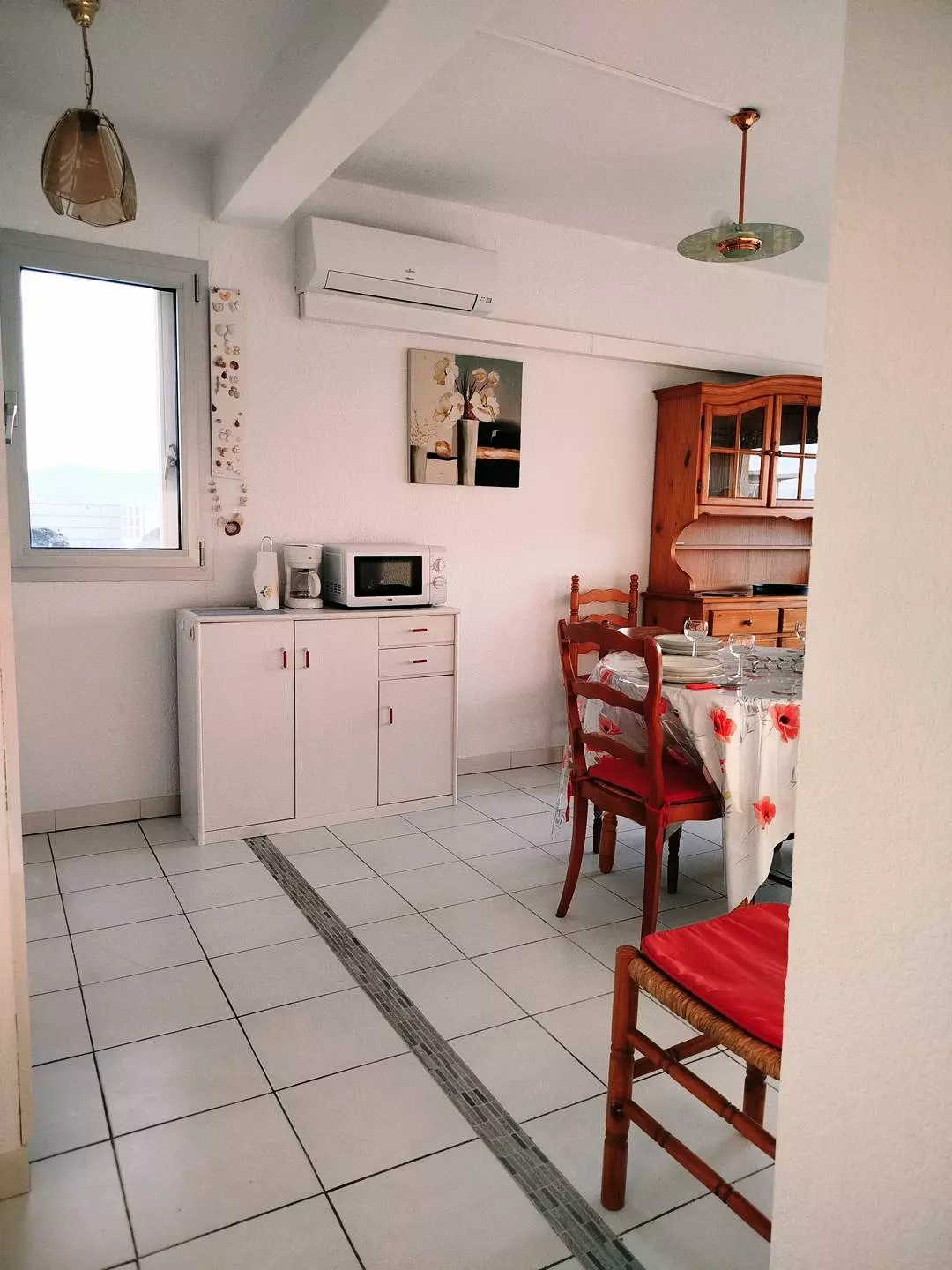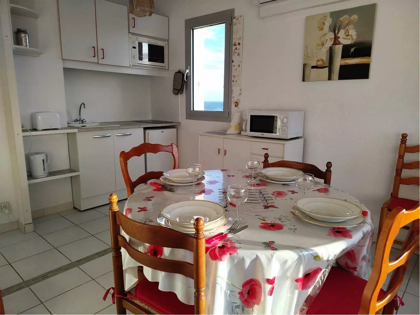 Entrée - Pièce de vie climatisée (coin repas, TV et canapé convertible) avec cuisine ouverte (plaque induction, four, micro onde, réfrigérateur TOP, cafetière filtres, grill pain, bouilloire..)- Cerise sur le gâteau vous pourrez contempler la mer tout en cuisinant !