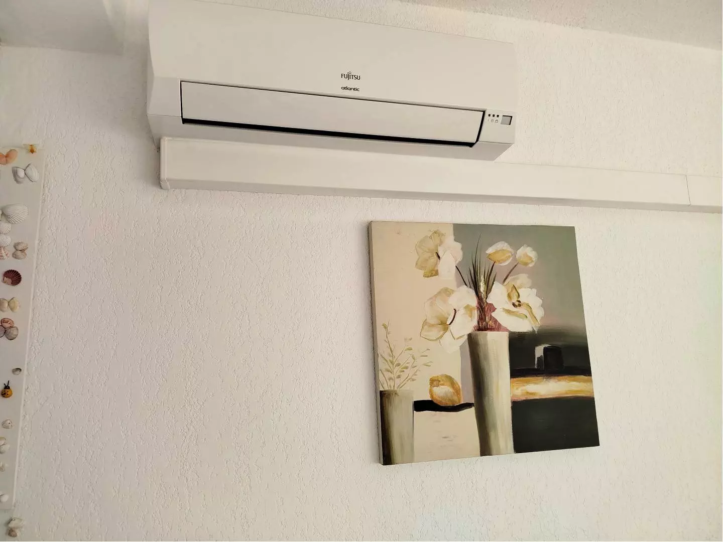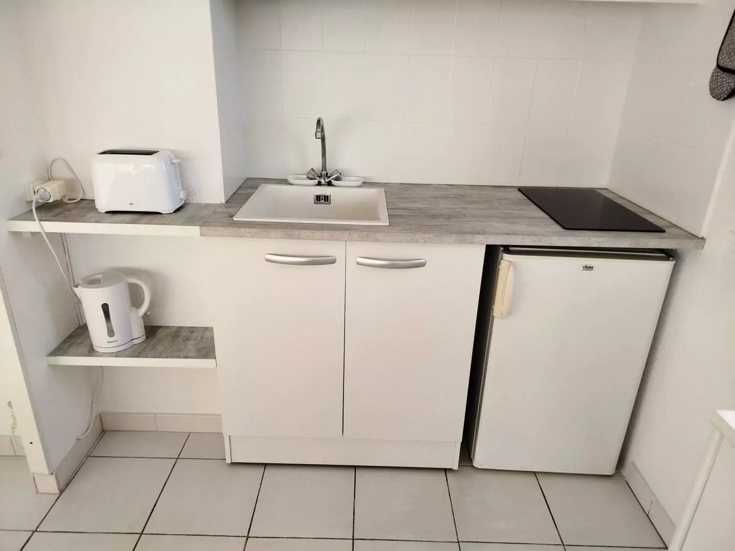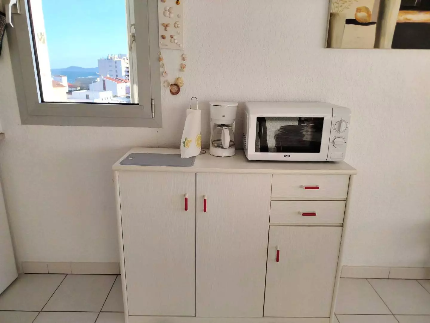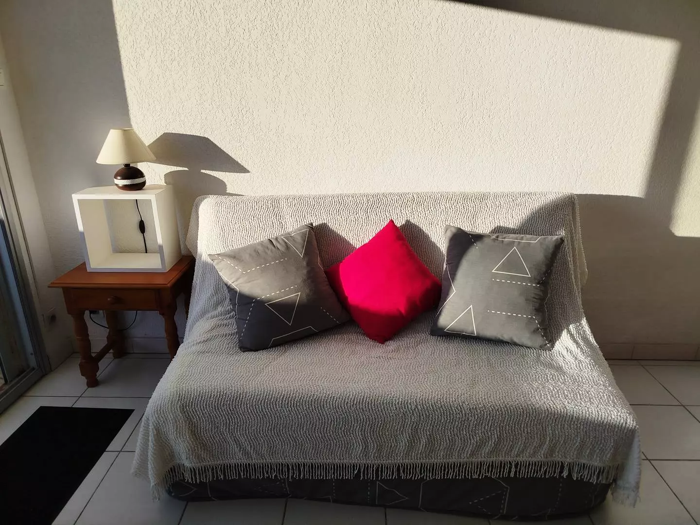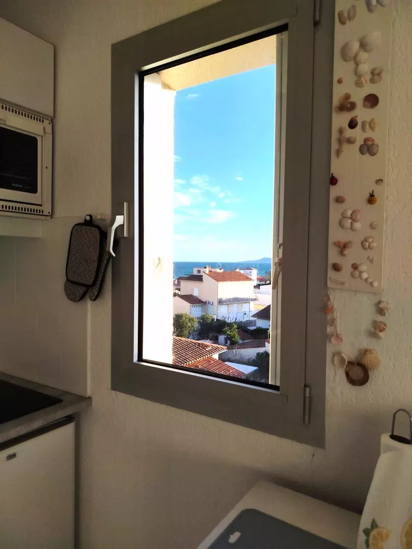 Entrée - Pièce de vie climatisée (coin repas, TV et canapé convertible) avec cuisine ouverte (plaque induction, four, micro onde, réfrigérateur TOP, cafetière filtres, grill pain, bouilloire..)- Cerise sur le gâteau vous pourrez contempler la mer tout en cuisinant !