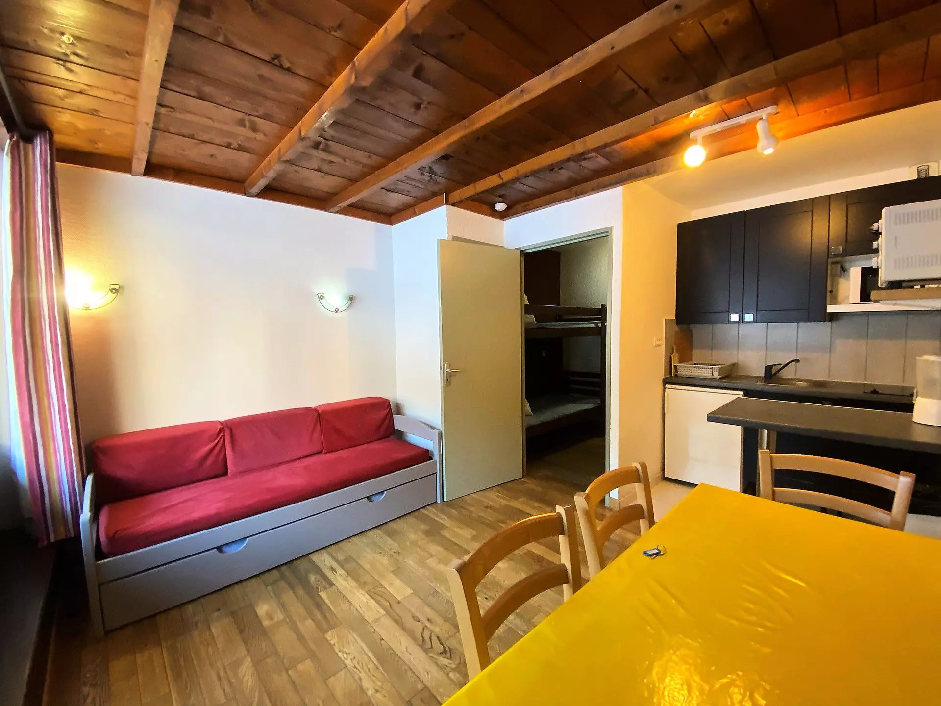 Il dispose de lits superposés dans l'entrée,un lit tiroir dans le séjour, ainsi qu'un coin repas et un petit bar.