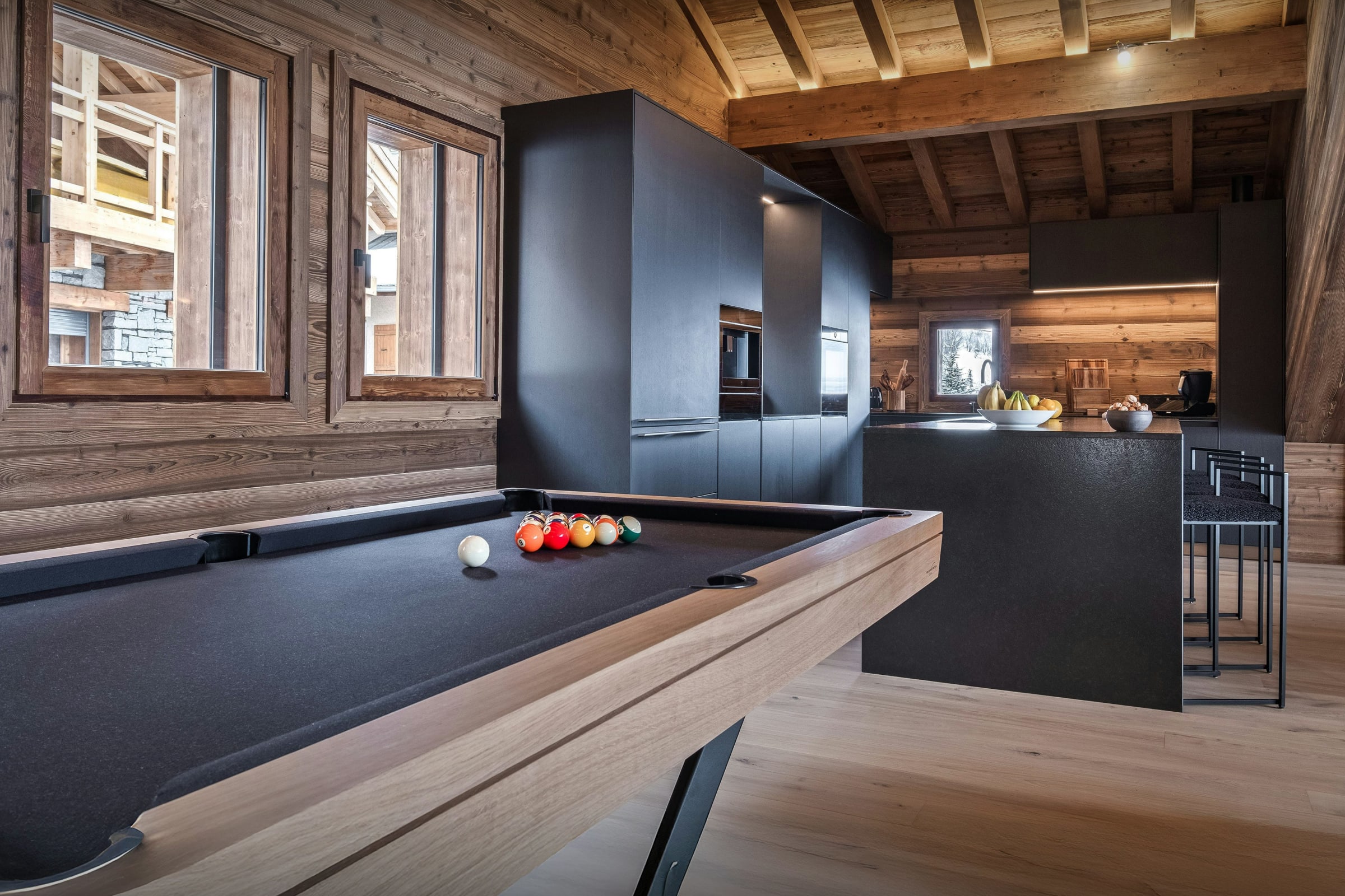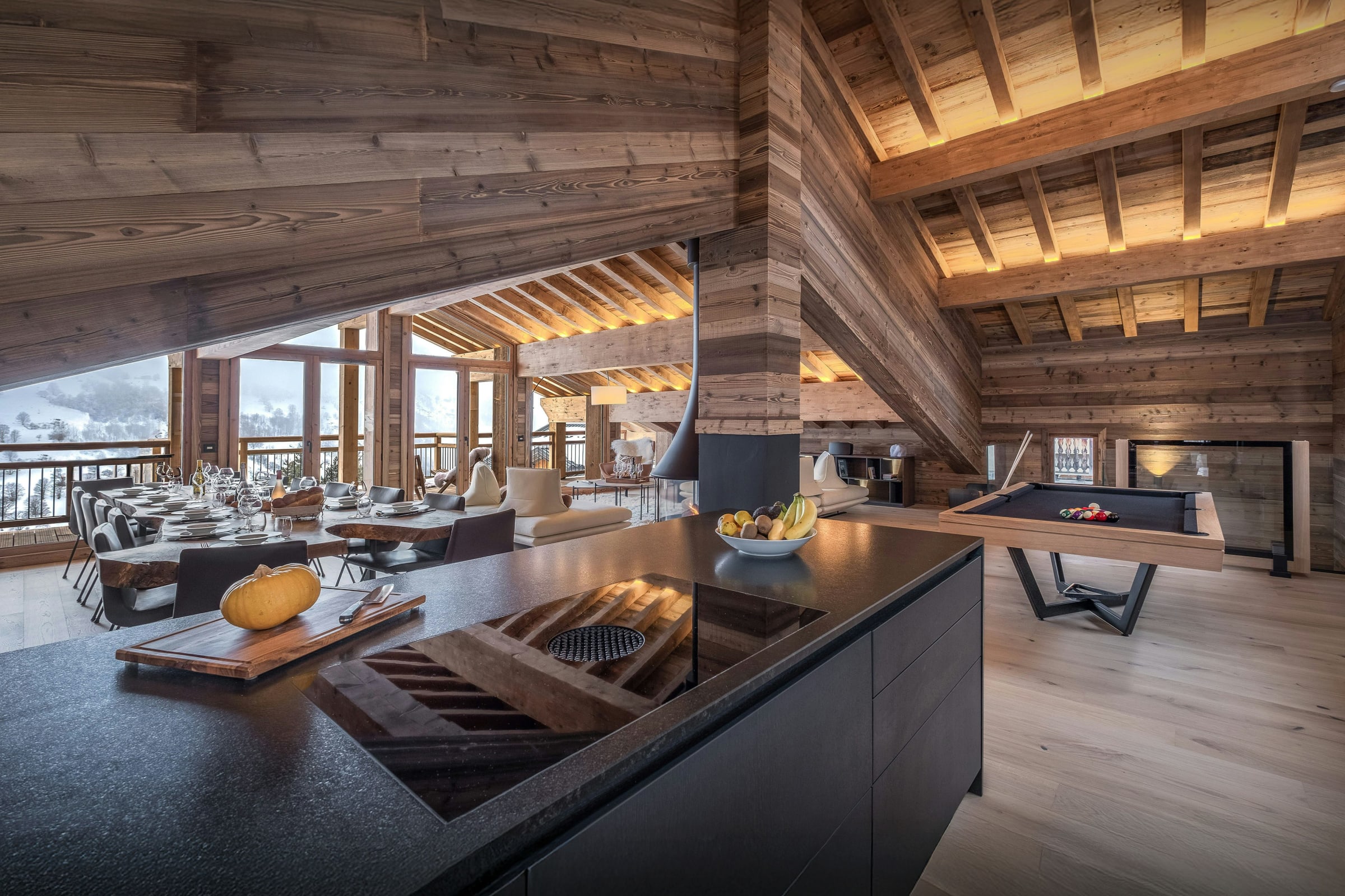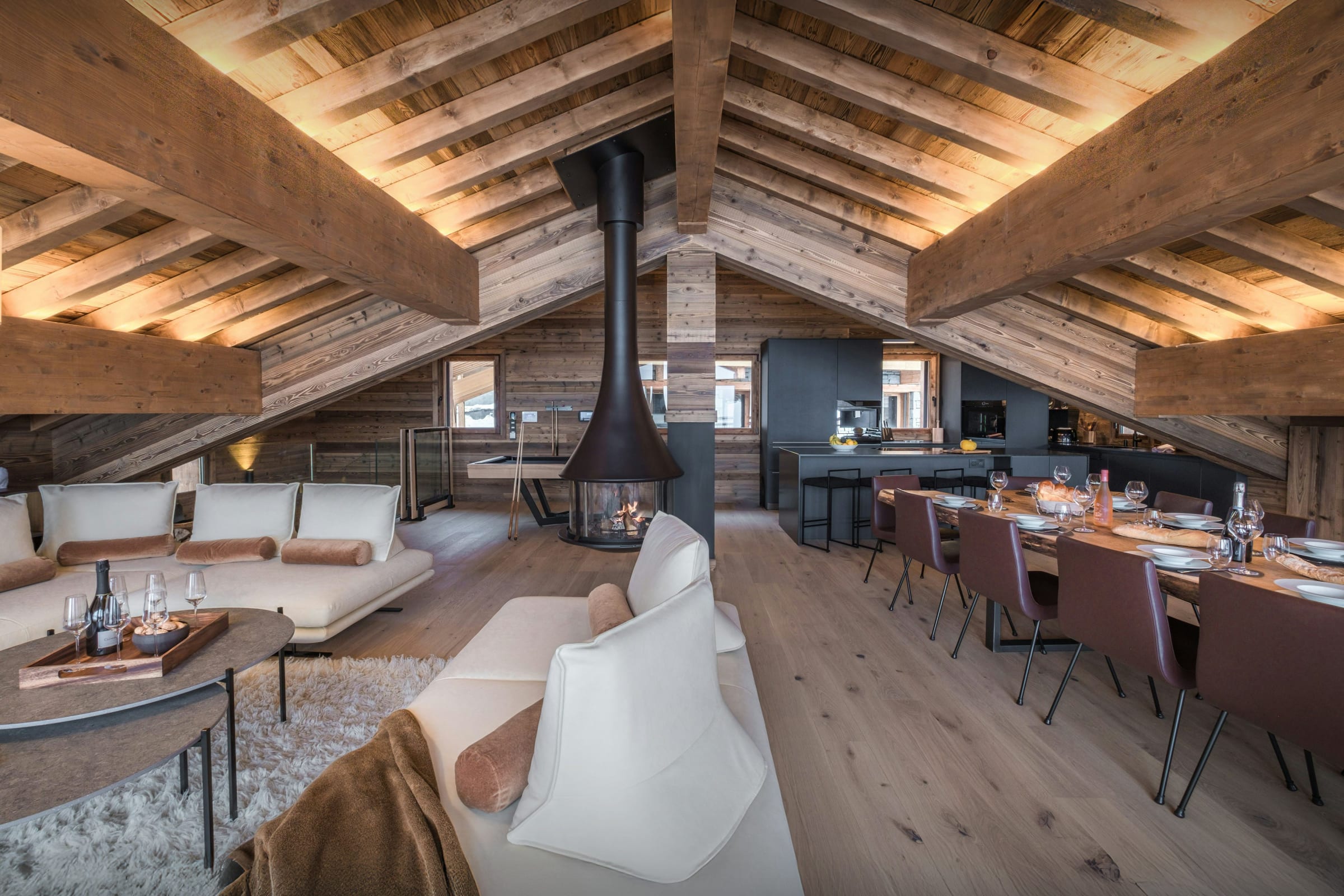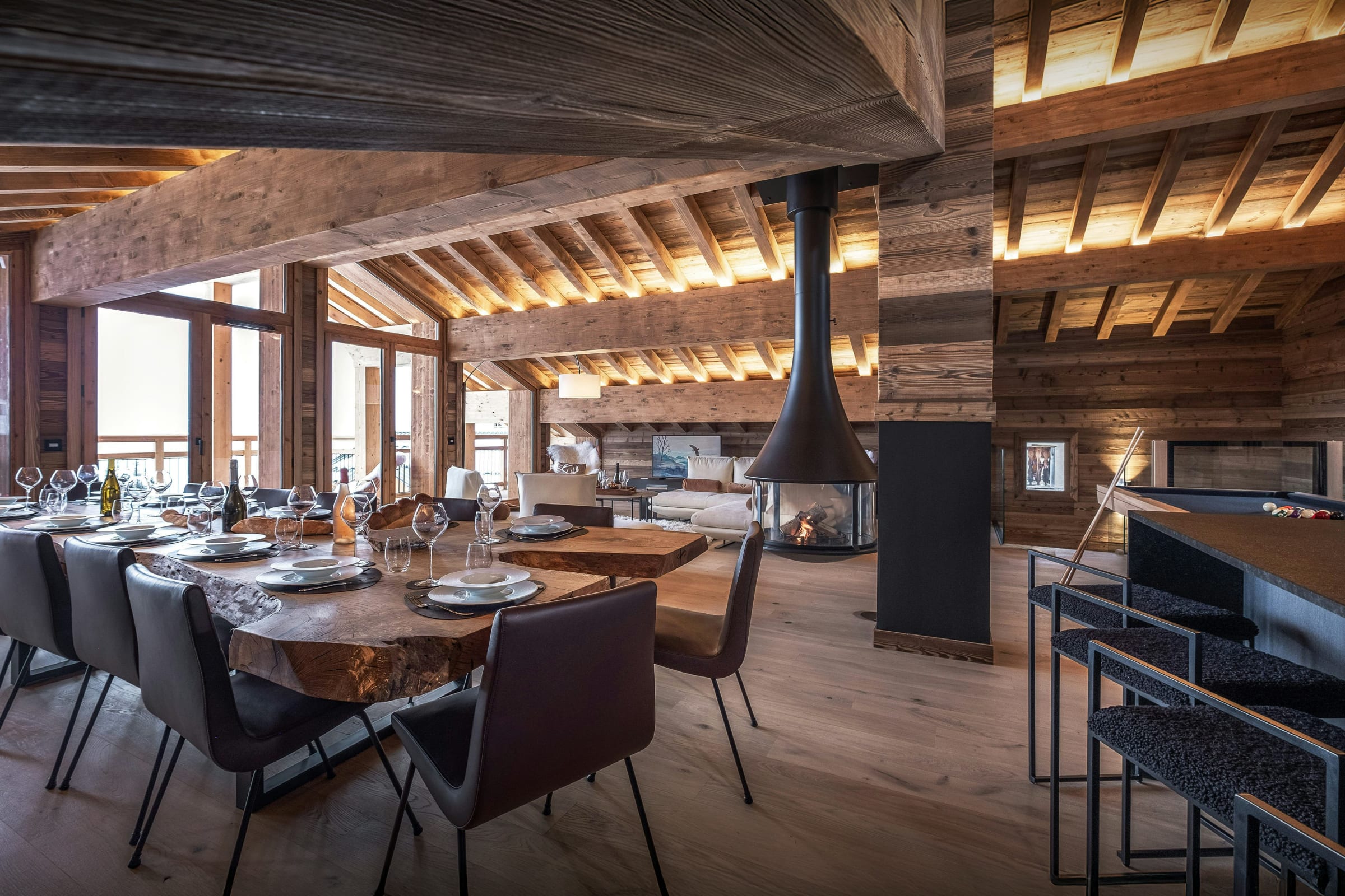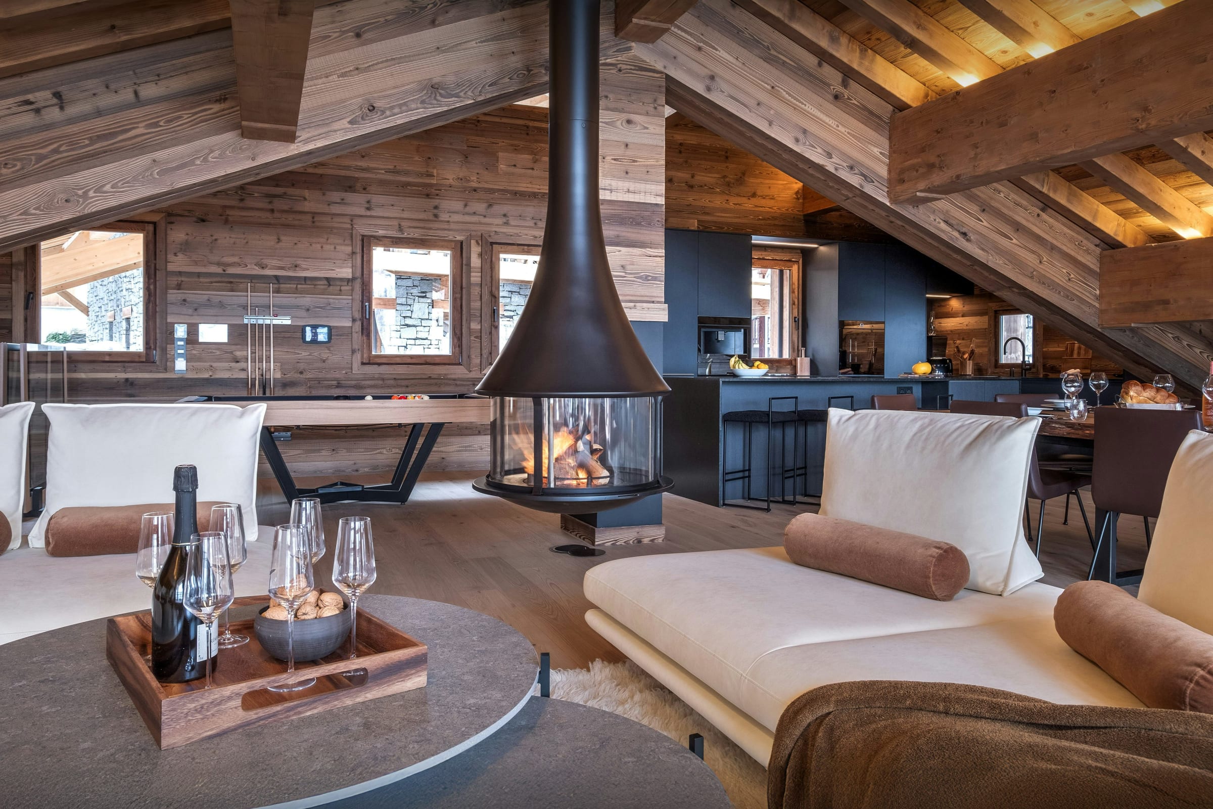 La pièce de vie, réchauffée par une cheminée suspendue, est l’un des atouts du Chalet Celestia. Le salon s’organise autour de larges canapés, propices aux échanges, tandis qu’une table de billard apporte une touche unique. La cuisine contemporaine s’ouvre naturellement sur cet espace, et de larges baies vitrées prolongent les moments partagés vers la terrasse.