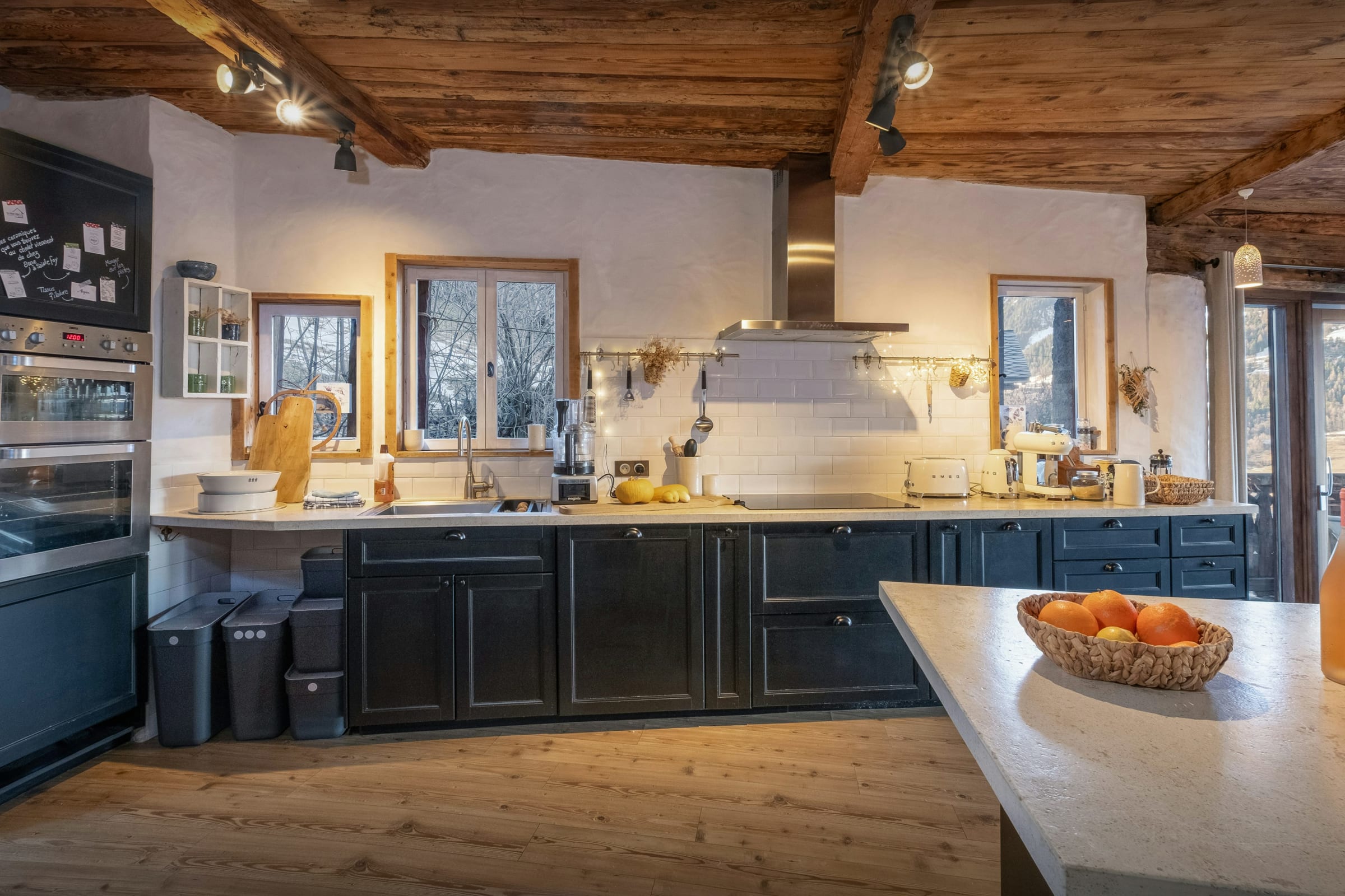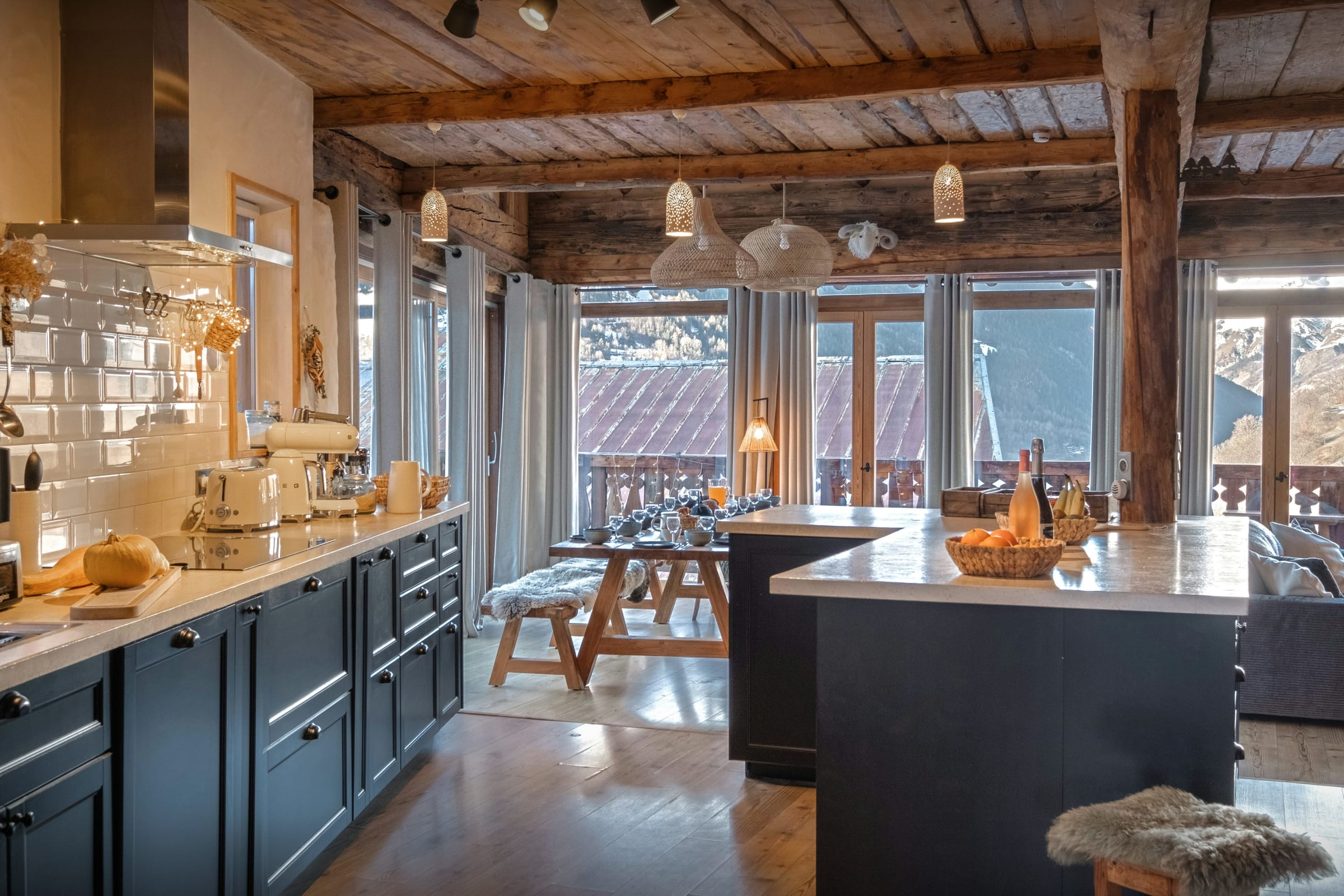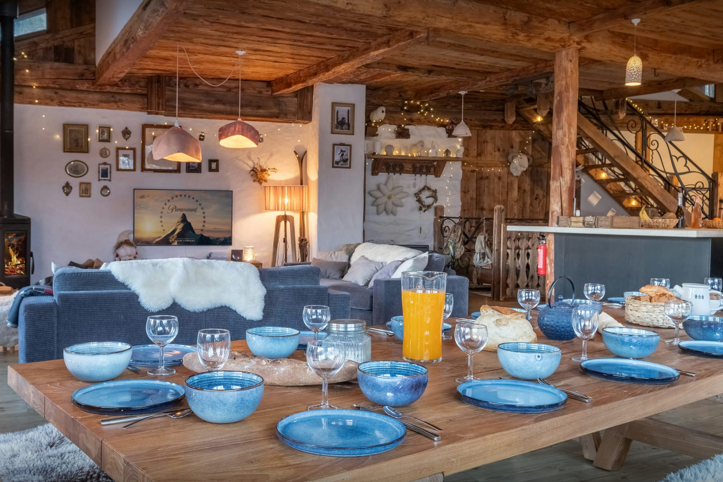 La pièce de vie est le véritable cœur du chalet. Baignée de lumière grâce à de larges baies vitrées, elle s’ouvre sur une terrasse et un balcon panoramique où le regard se perd dans le paysage. Le salon, réchauffé par son poêle à bois, invite à prolonger les soirées hivernales, tandis que la terrasse et son four à pizza deviennent le théâtre de moments conviviaux en été.