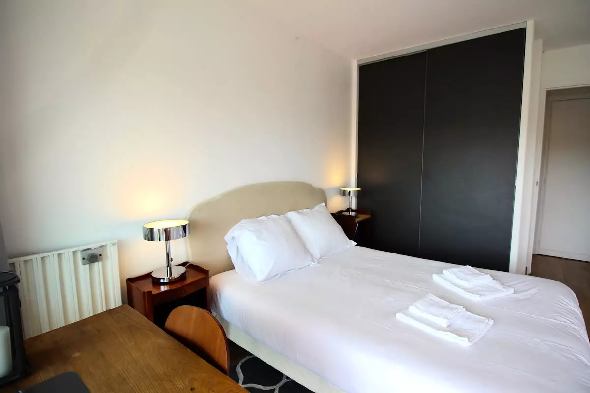 - La chambre comprend un grand lit double, une penderie et des placards, un petit bureau, et donne sur le balcon qui dessert également le salon. Vous pourrez vous y installer pour prendre un café ou un petit-déjeuner au soleil !