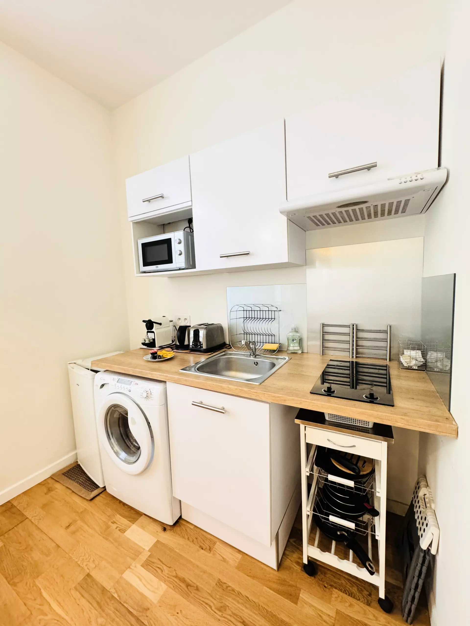 La partie cuisine est entièrement équipée avec un réfrigérateur, un four micro-ondes, une plaque électrique, une cafetière Nespresso, une bouilloire. La salle de douche avec WC est équipée d'un lave-linge pour plus de commodité.
