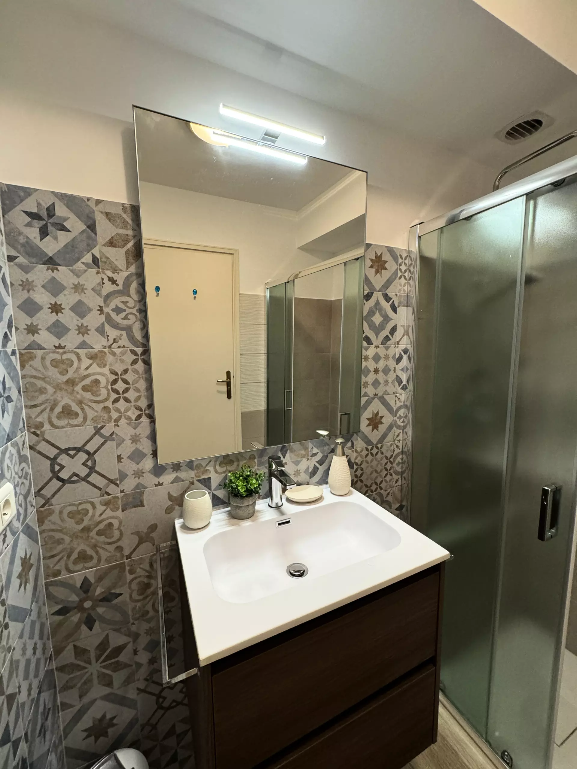 Cet appartement comprend un séjour lumineux avec un canapé confortable et une télévision, idéal pour se détendre après une journée bien remplie. Le séjour donne un accès direct à la terrasse, offrant une vue imprenable sur la ville. La cuisine moderne est entièrement équipée avec réfrigérateur, plaque de cuisson, four, micro-ondes et tous les ustensiles de cuisine nécessaires. Elle dispose également d'un espace de travail fonctionnel et de nombreux rangements.