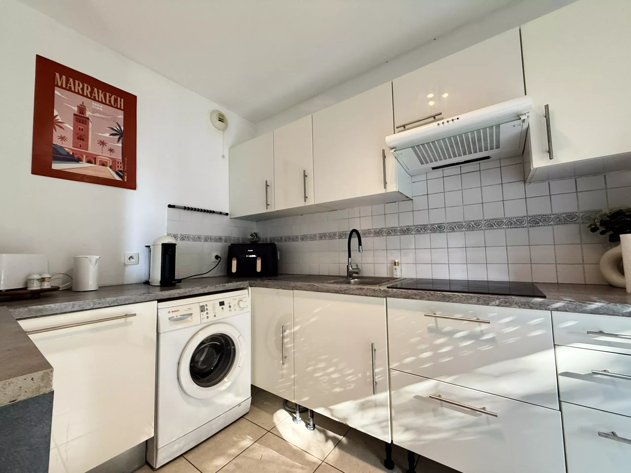 La cuisine américaine, moderne et fonctionnelle, comprend un réfrigérateur, congélateur, lave-vaisselle, lave-linge, cafetière, grille-pain, friteuse, bouilloire et tous les ustensiles nécessaires.