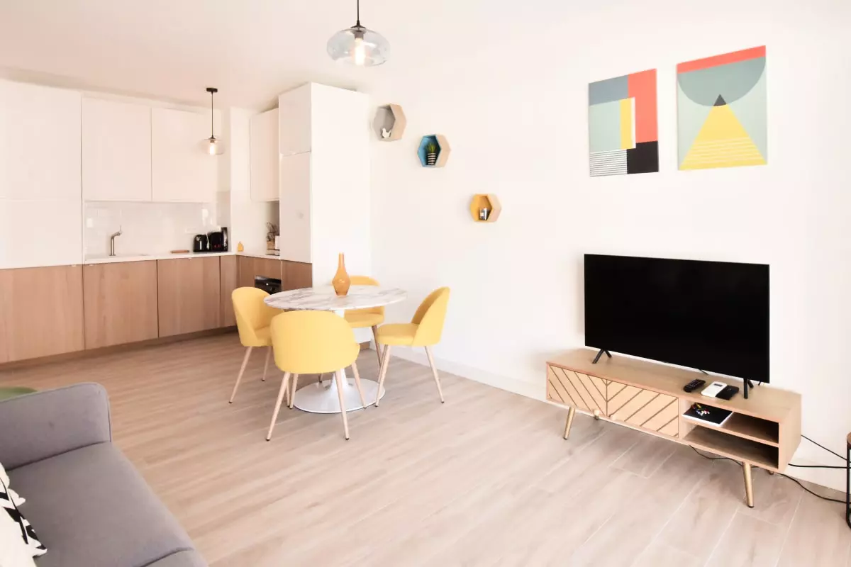 Depuis l’entrée, on accède directement à la pièce de vie. Le salon dispose d’un canapé, d’une télévision et d’un espace repas. De larges ouvertures donnent accès à la terrasse, idéale pour un café le matin ou un moment de détente en fin de journée.