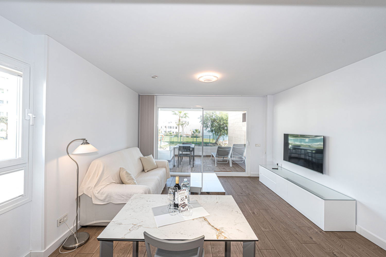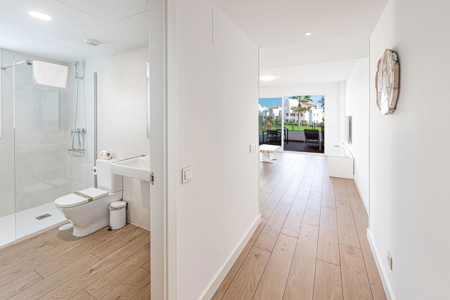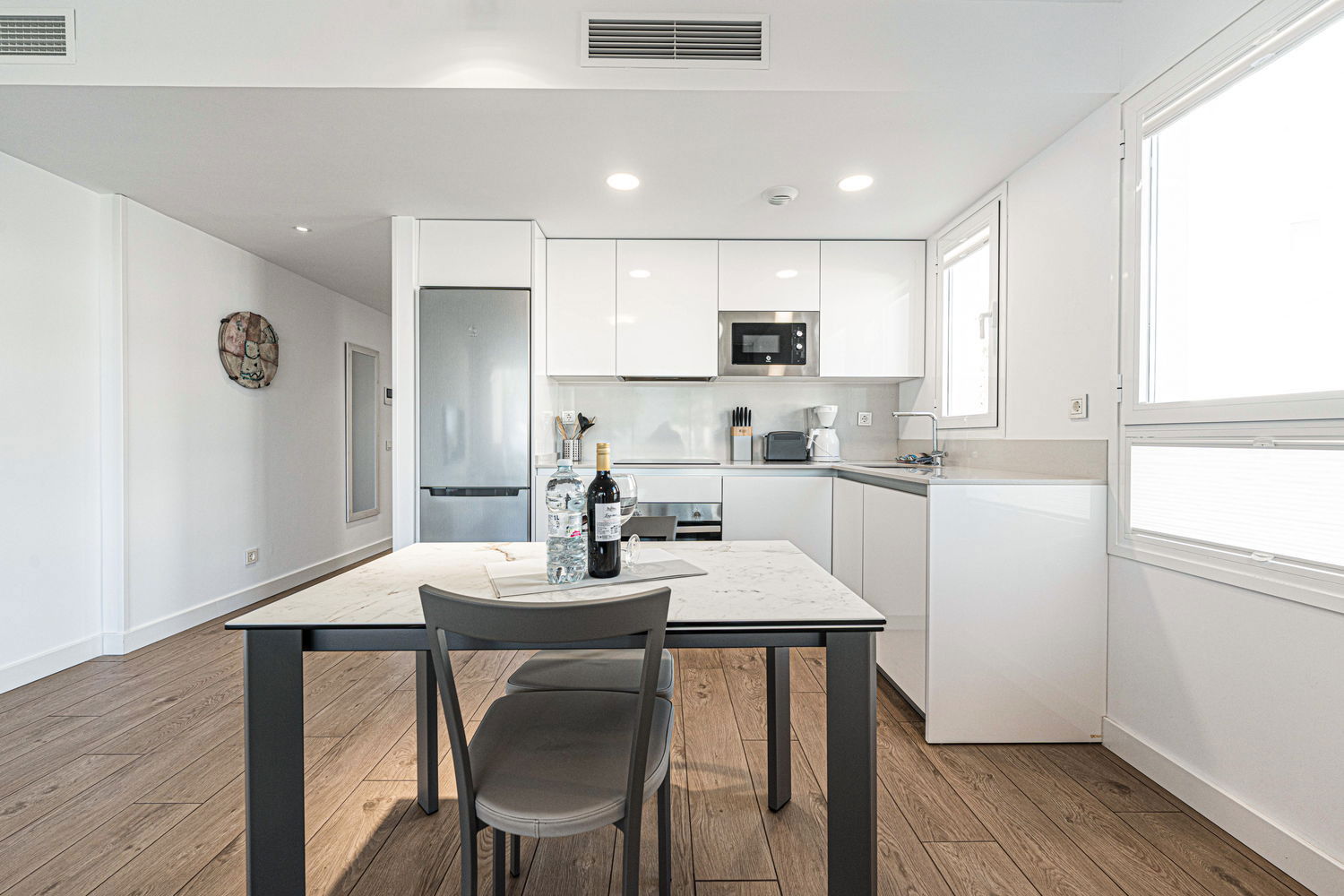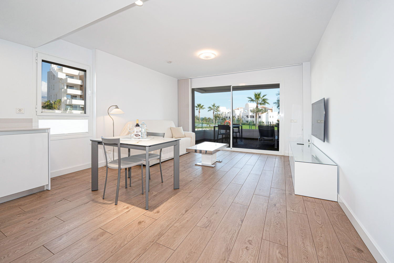 La Propriété : Appartement neuf, conçu pour un maximum de 2 personnes. Il dispose d'une chambre principale avec un lit double et d'une salle de bain moderne avec douche à l'italienne. La zone de vie intègre un salon-salle à manger avec une cuisine ouverte haut de gamme, équipée de détails de qualité : ensemble de couteaux Russell Hobbs, machine à café L'Or Barista, lave-vaisselle et lave-linge. Tout respire le style et la fonctionnalité.