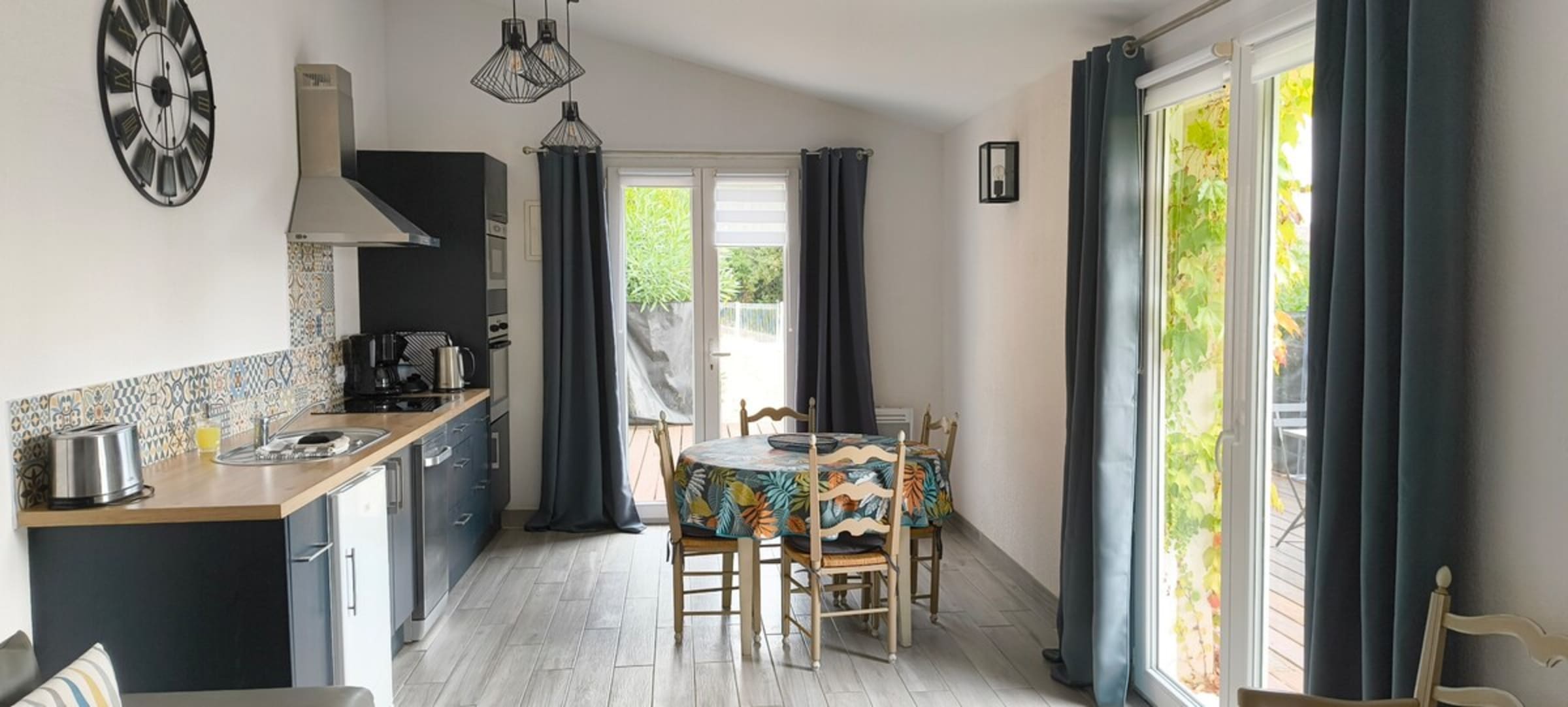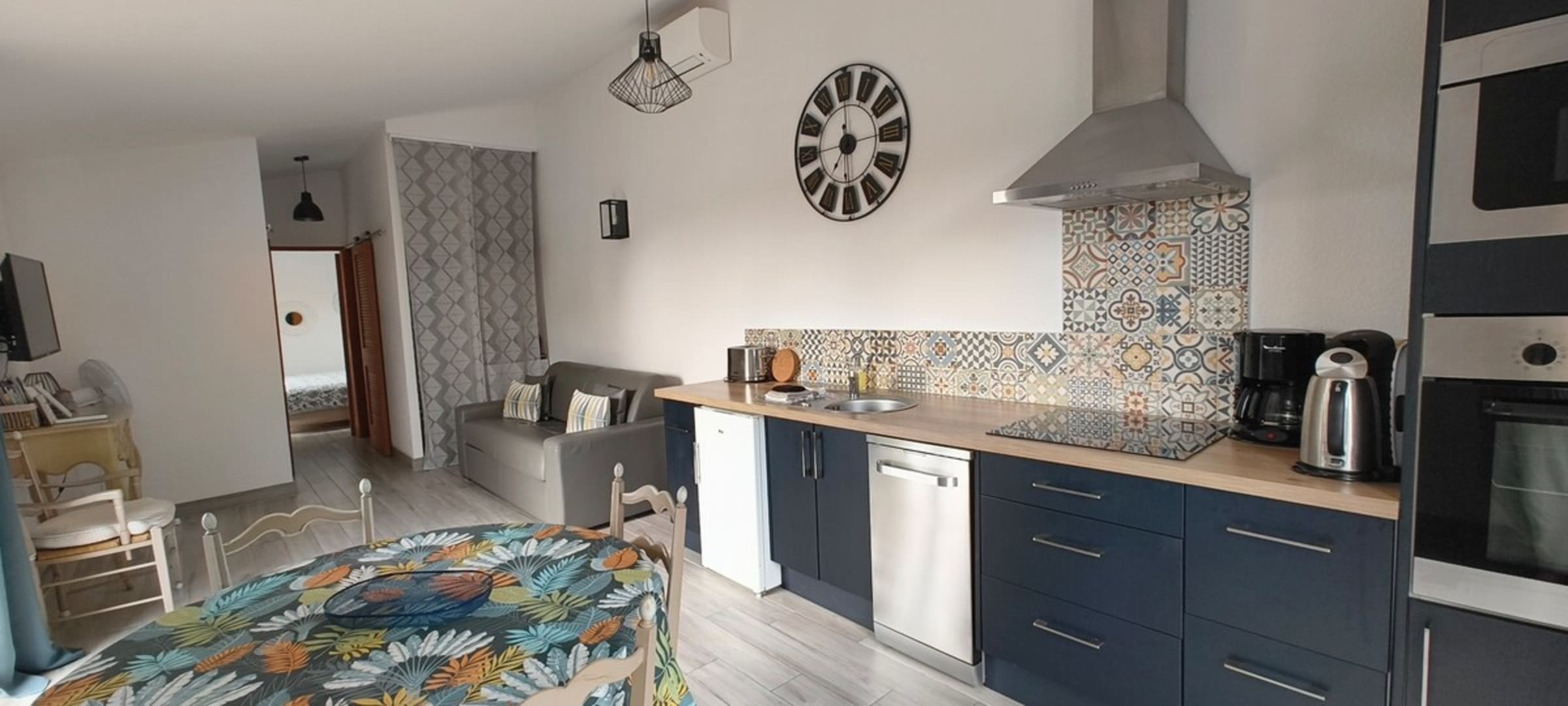 Espace de vie lumineux avec cuisine ouverte entièrement équipée (four, plaques vitrocéramiques, micro‑ondes, réfrigérateur, lave‑vaisselle, cafetière, bouilloire, grille‑pain).