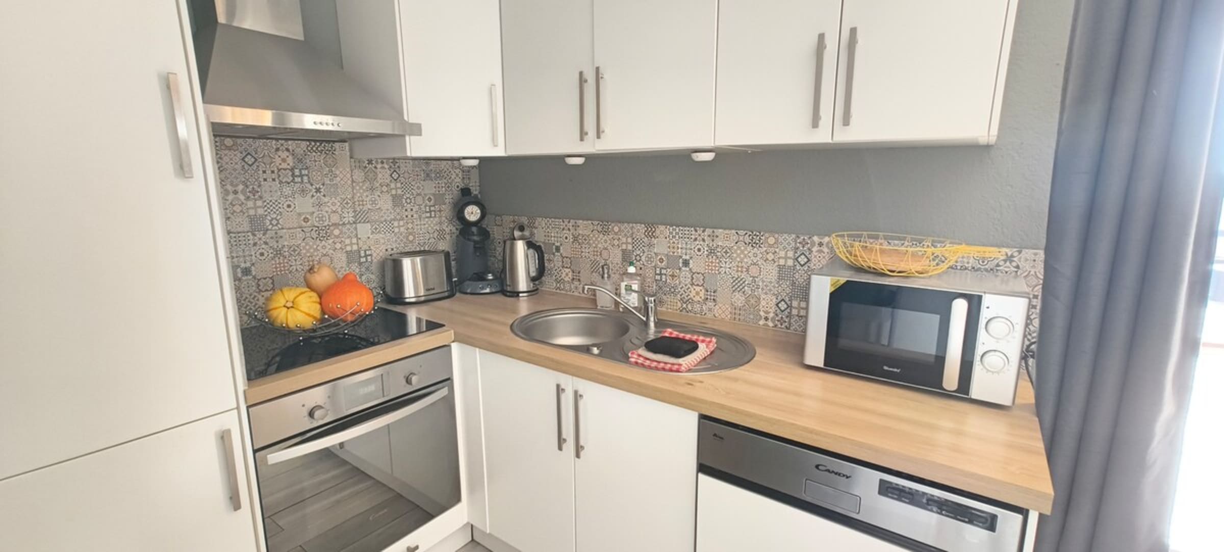 Bel espace de vie lumineux avec cuisine ouverte entièrement équipée (four, plaques vitrocéramiques, micro‑ondes, réfrigérateur, lave‑vaisselle, cafetière, bouilloire, grille‑pain).