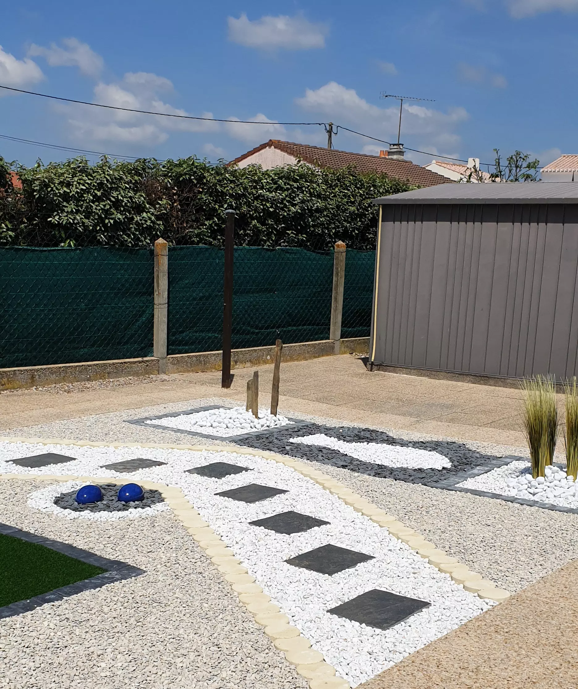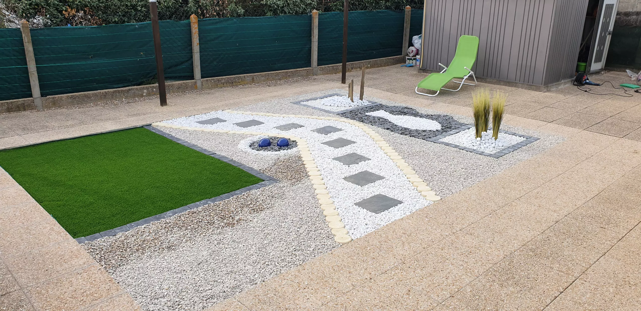 Le point fort de la maison ? Son extérieur ! La grande terrasse se distingue par ses superbes motifs géométriques en pierres, offrant un cachet unique à vos moments en plein air.