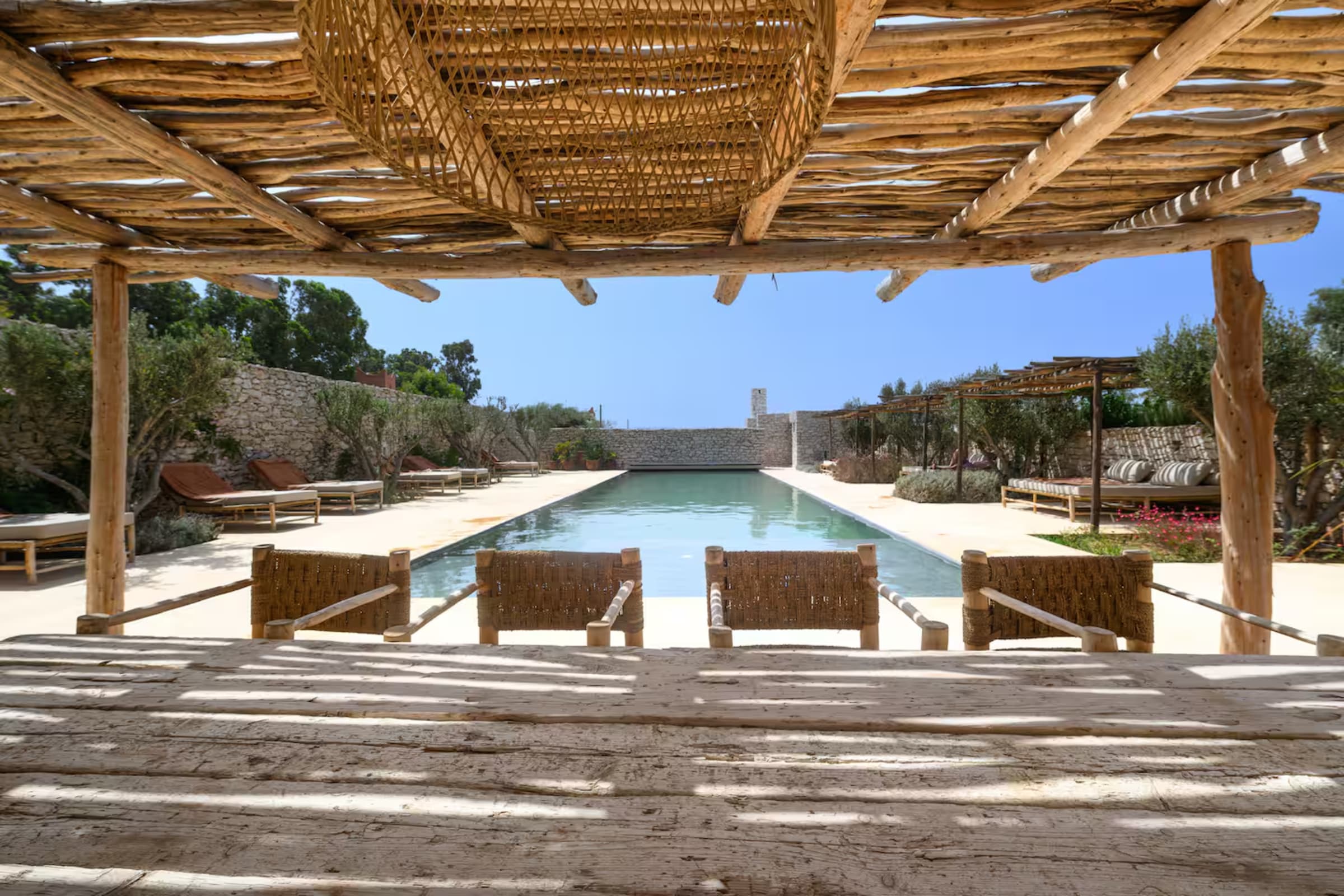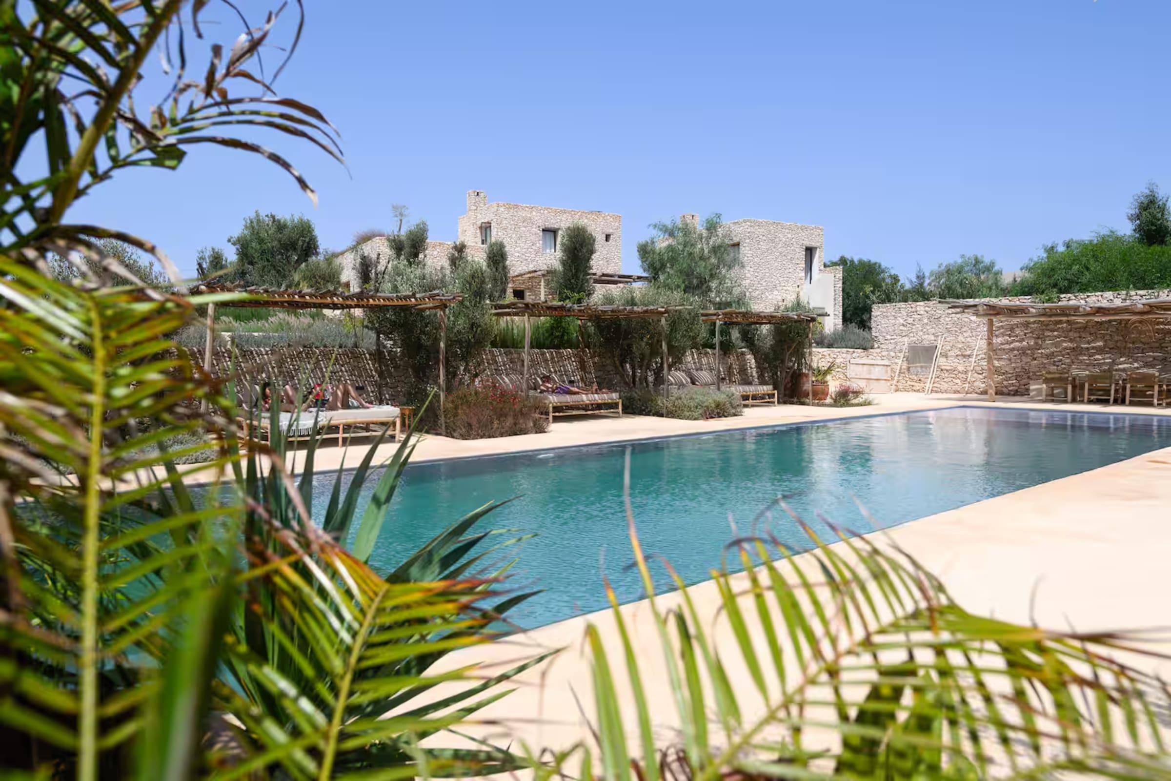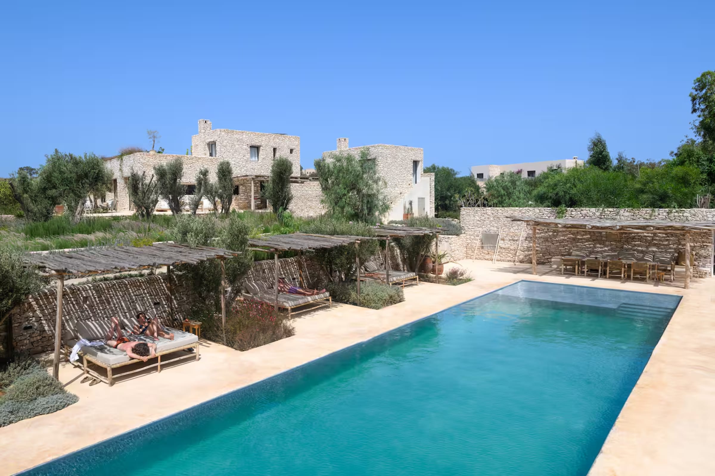 une immense piscine chauffée bordée de terrasses en pierre et de daybeds ombragés,