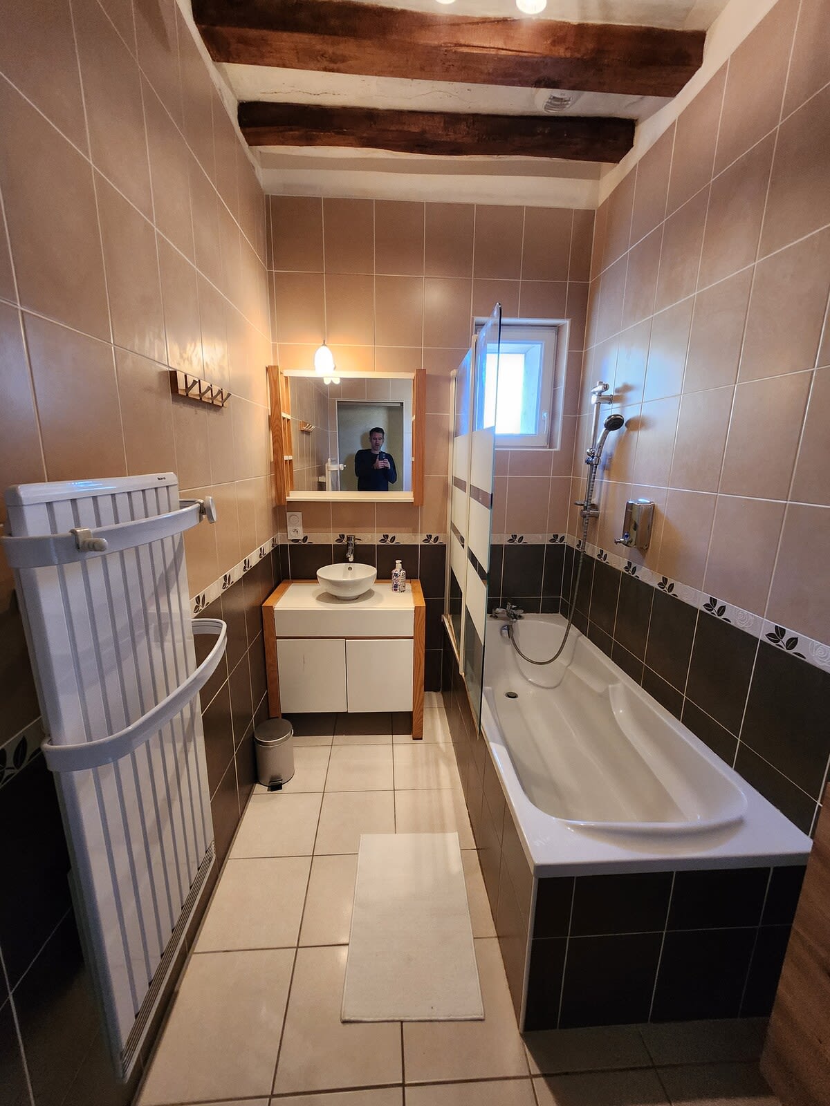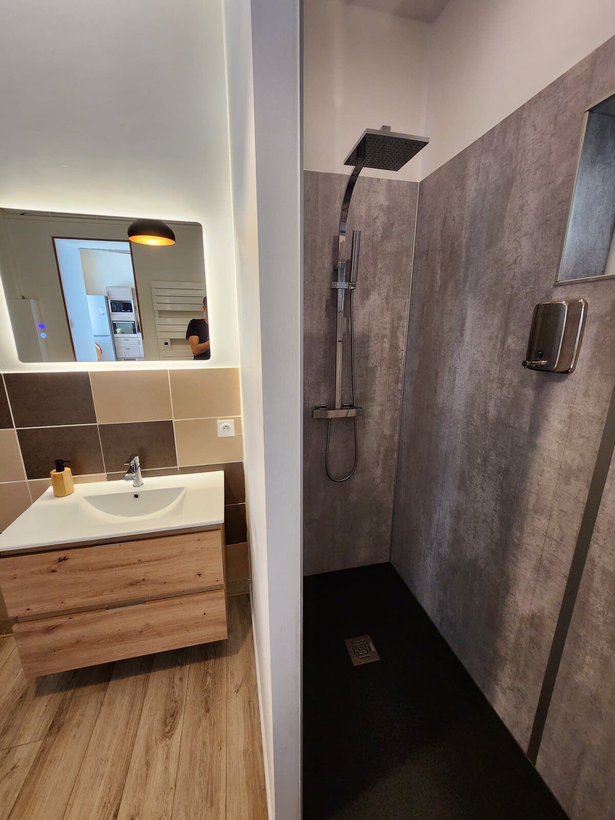 Une salle de bain avec baignoire et une salle d’eau avec douche à l’italienne.
