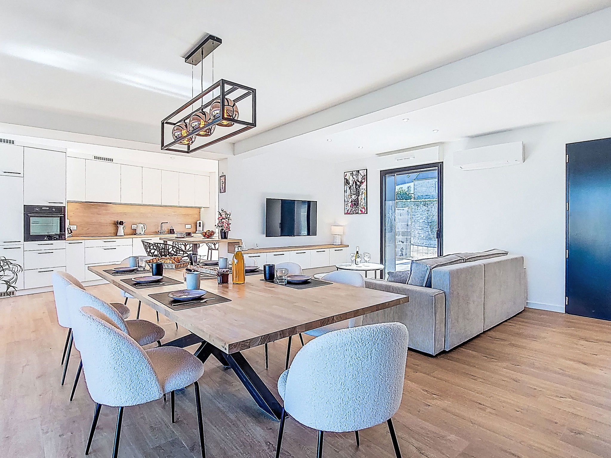 "Ty Béthanie", maison 5 pièces 130 m2. Spacieux et clair, aménagement confortable et de bon goût: grand séjour/salle à manger 40 m2, ouvert avec Télévision numérique et écran plat. Sortie sur le jardin, sur la terrasse. 1 chambre 15 m2 avec 2 lits (90 cm, longueur 200 cm). Grande cuisine ouverte (four, lave-vaisselle, 4 plaques à induction, grille-pain, bouilloire électrique, micro-ondes, congélateur, cafetière électrique, Capsules pour machine à café (Senseo) (NON INCLUSES)) avec bar. Douche/WC. À l'étage supérieur: séjour 12 m2, ouvert. 1 chambre 12 m2 avec 2 lits (90 cm, longueur 200 cm). 1 chambre 12 m2 avec 1 grand-lit (160 cm, longueur 200 cm). Douche, WC séparé. Chauffage, air-conditionné. Grande terrasse 60 m2, situation sud, grande terrasse 30 m2, situation nord. Meubles de terrasse, barbecue, chaises longues. Vue partielle sur la mer. A disposition: lave-linge, sèche-linge, fer à repasser, chaise haute pour enfant, lit bébé jusqu'à 2 ans, sèche-cheveux. Internet (Connexion WIFI, gratuit). Veuillez noter: maison non-fumeur. Maximum 1 animal/ chien de petite taille autorisé. Détecteur de fumée. Le rez-de-chaussé de la maison est adapté pour PMR. Annonce d'un particulier (art 155, IV du CGI).