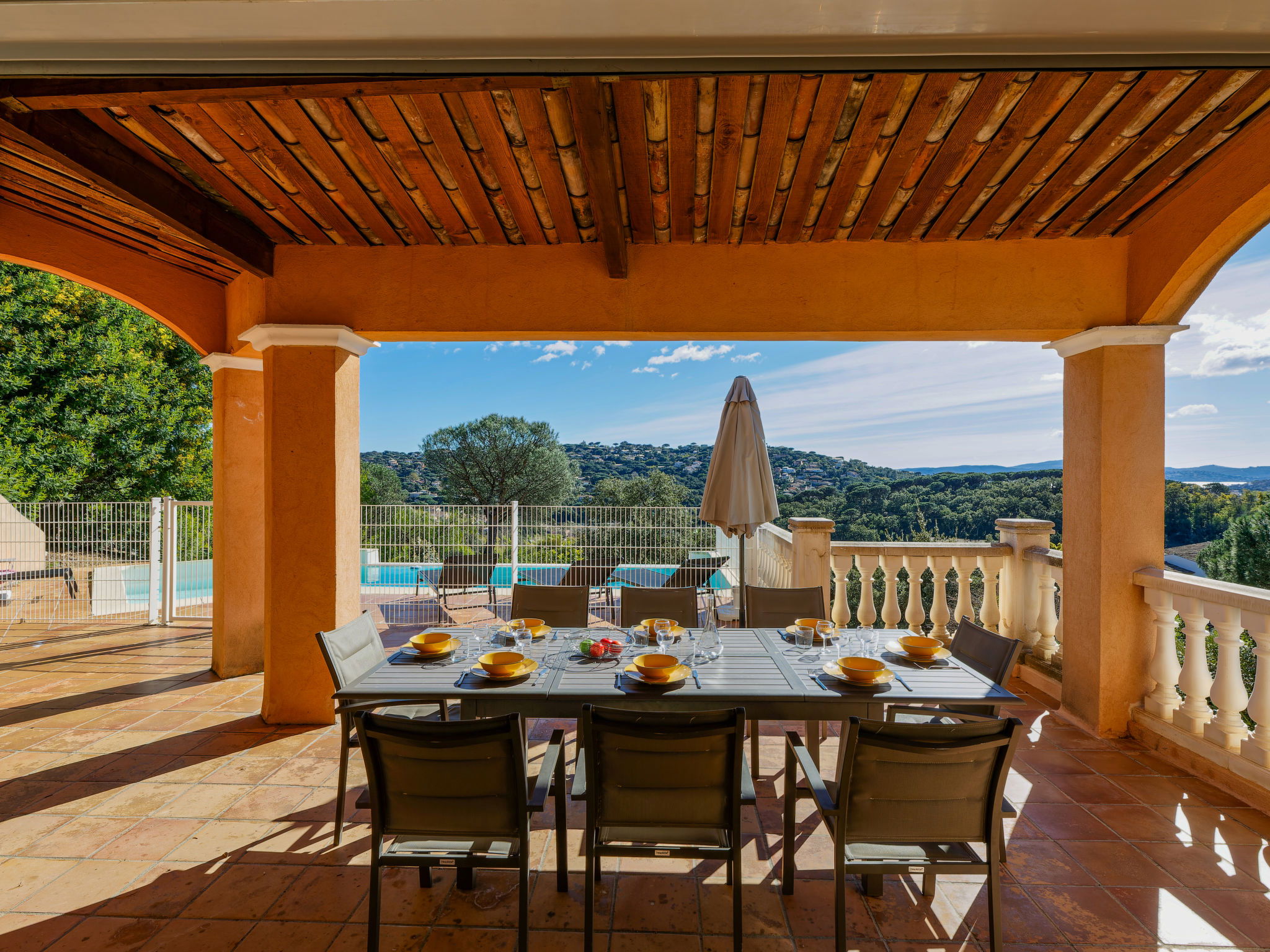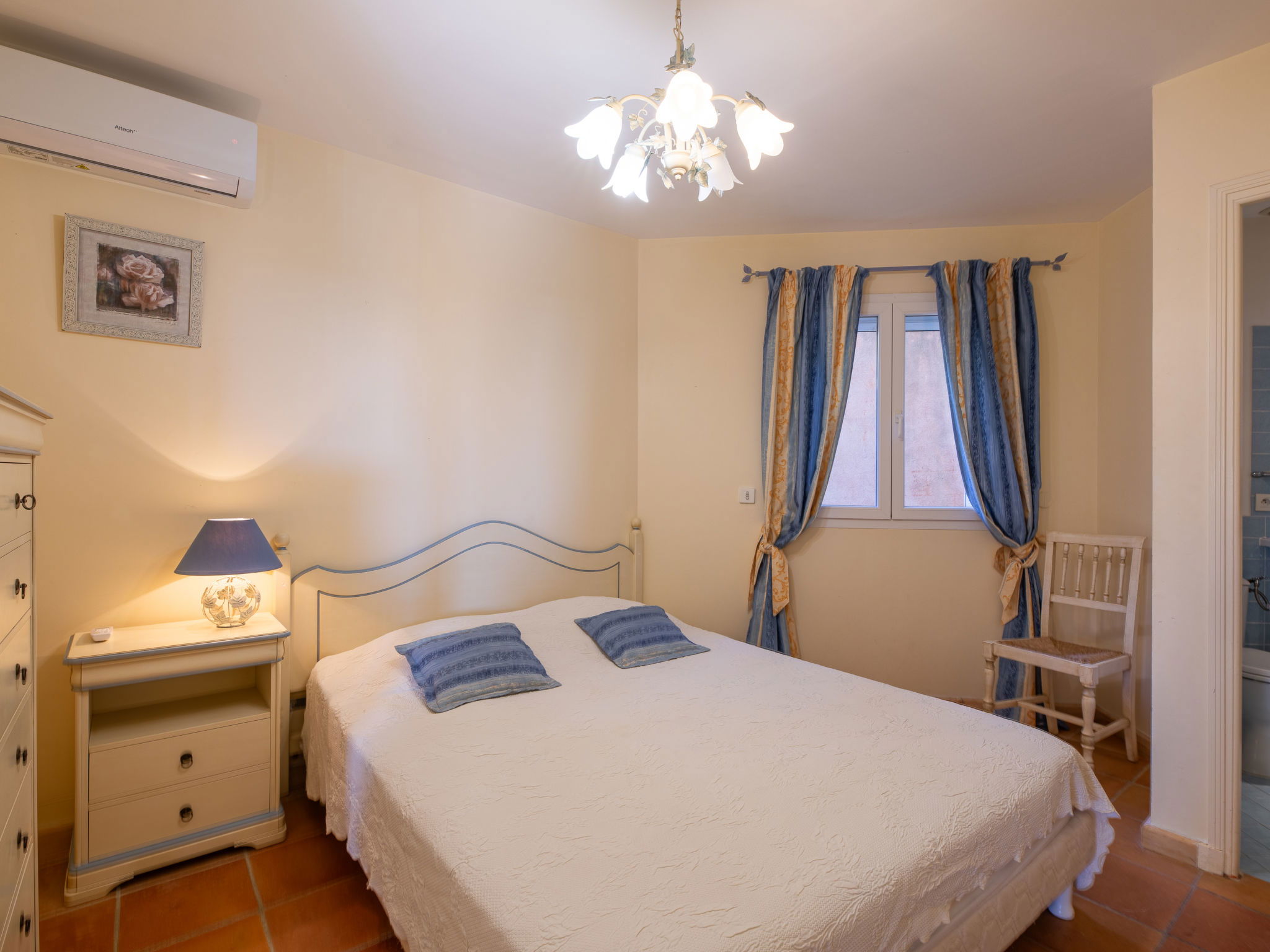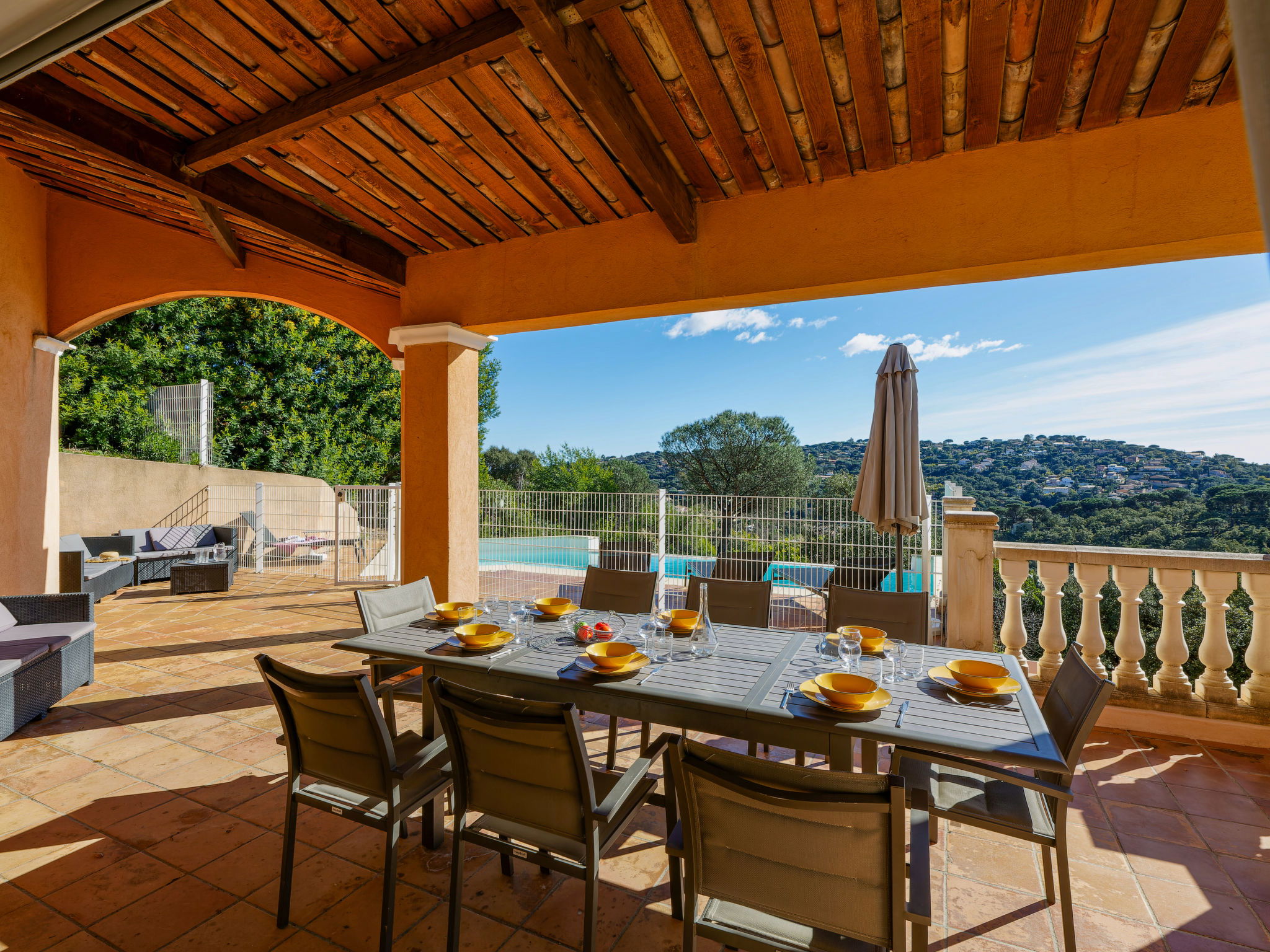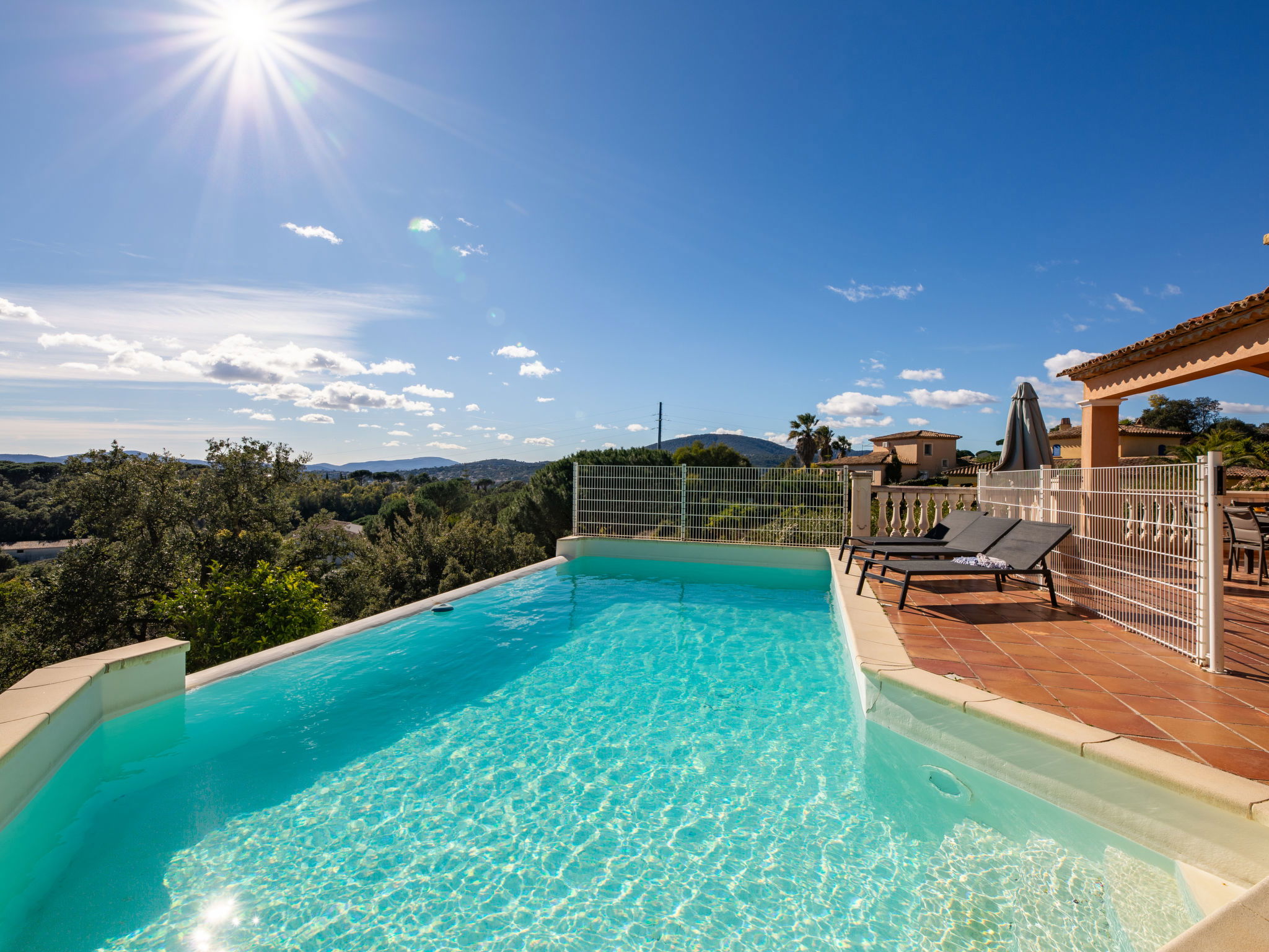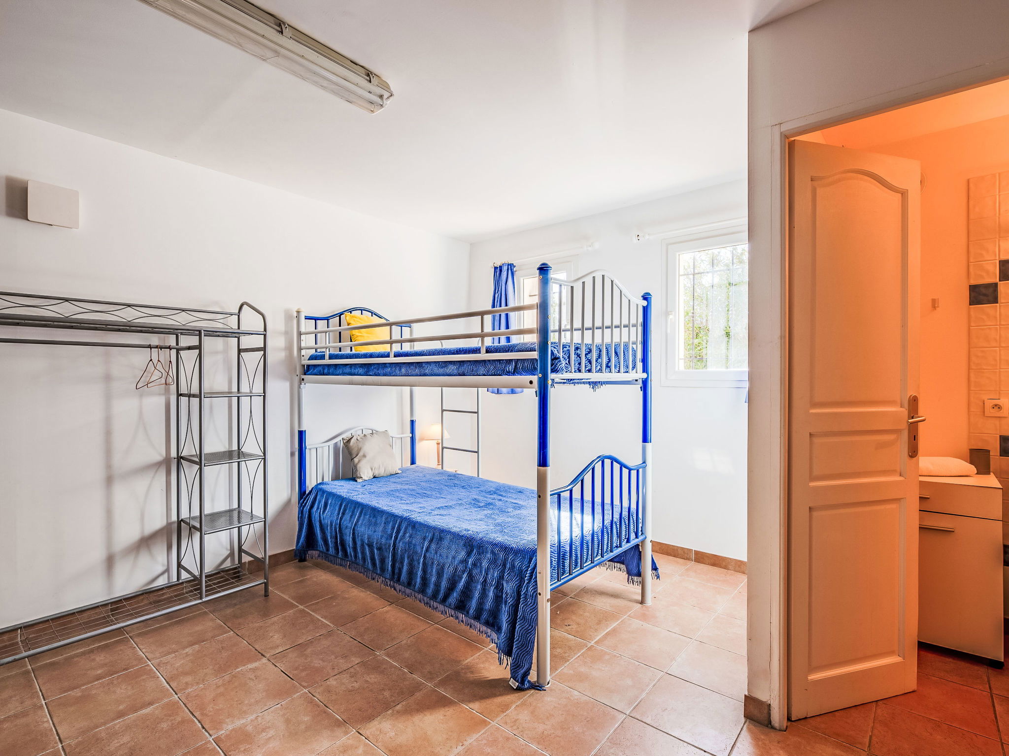 "La Figuière", maison 5 pièces 180 m2 sur 3 niveaux. Clair, aménagement de bon goût: séjour/salle à manger avec table pour les repas et TV (écran plat), DVD. Sortie sur la terrasse, sur la piscine. 1 chambre avec 1 grand-lit (160 cm, longueur 200 cm), bain/WC. Cuisine ouverte (four, lave-vaisselle, 3 plaques à induction, grille-pain, bouilloire électrique, micro-ondes, congélateur, cafetière électrique). WC séparé. Air-conditionné, chauffage à air chaud. À l'étage inférieur: 1 chambre avec 2 x 2 lits superposés (90 cm, longueur 190 cm), WC séparés et douche. À l'étage supérieur: 1 chambre avec 2 lits (90 cm, longueur 200 cm), douche/WC. Sortie sur le balcon. 1 chambre avec 1 grand-lit (160 cm, longueur 200 cm), douche/WC. Sortie sur le balcon. Chauffage électrique. Balcon 25 m2, situation sud-ouest, terrasse 40 m2 partiellement couverte, situation sud-ouest. Meubles de terrasse, barbecue. A disposition: lave-linge, sèche-linge, fer à repasser. Internet (Connexion WIFI, gratuit). Veuillez noter: détecteur de fumée. Annonce d'un professionnel (art 155, IV du CGI) 83115000475DP