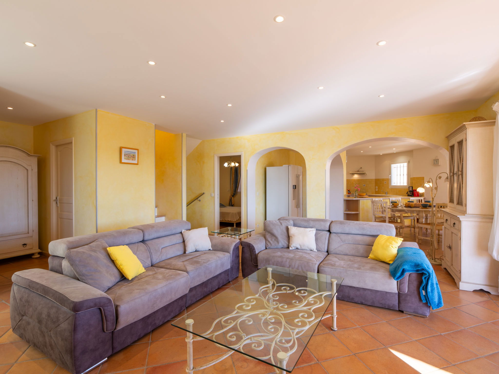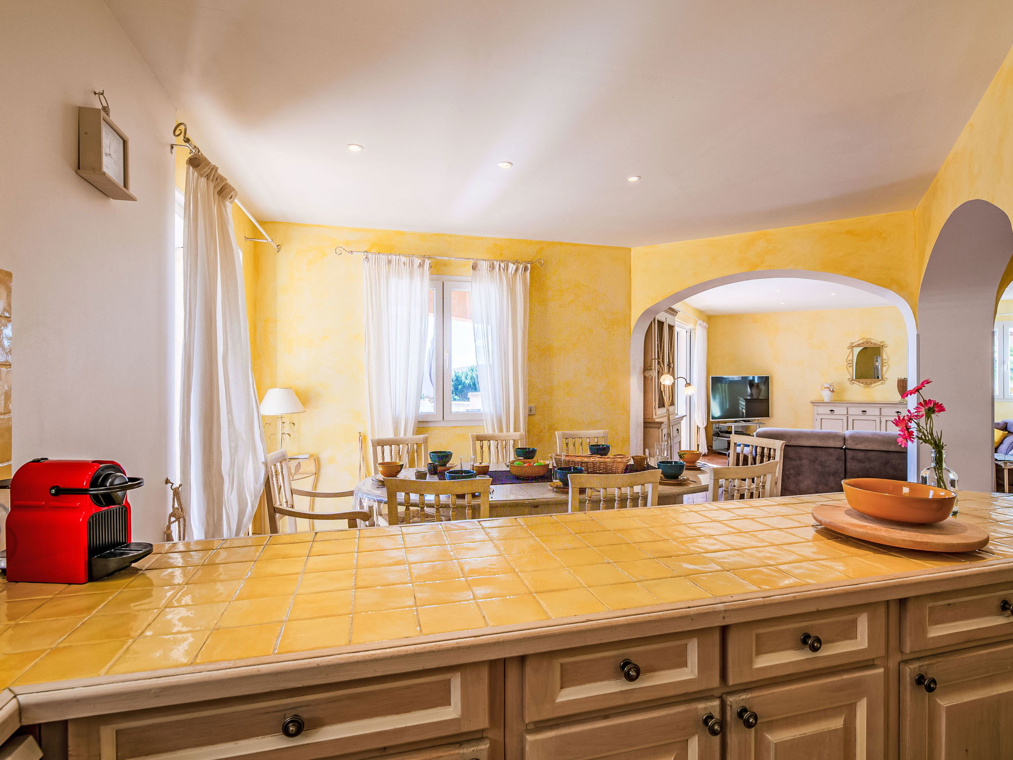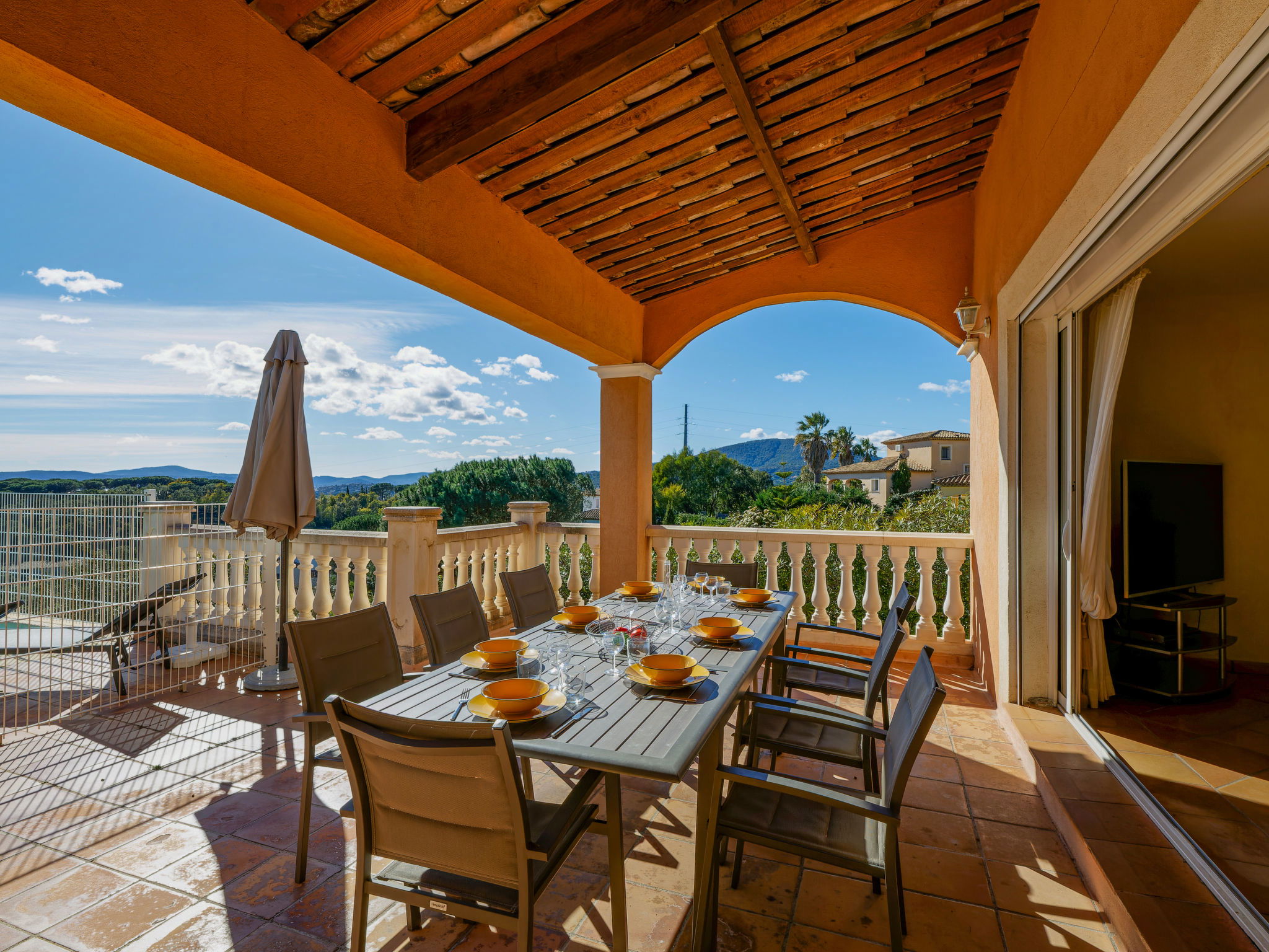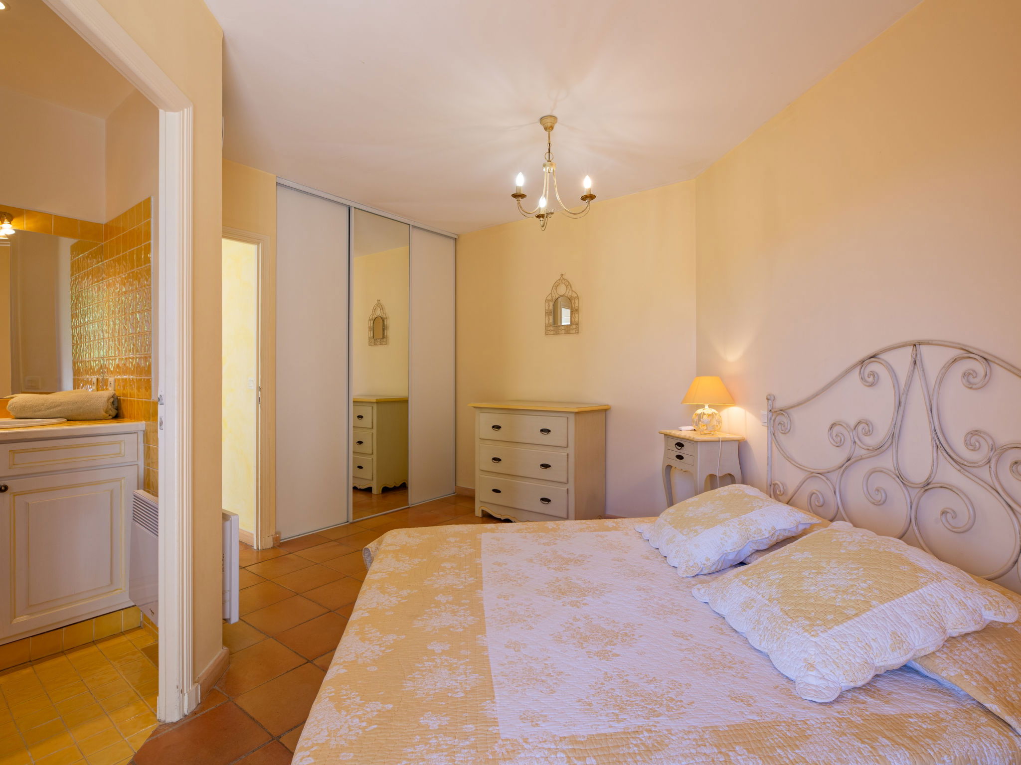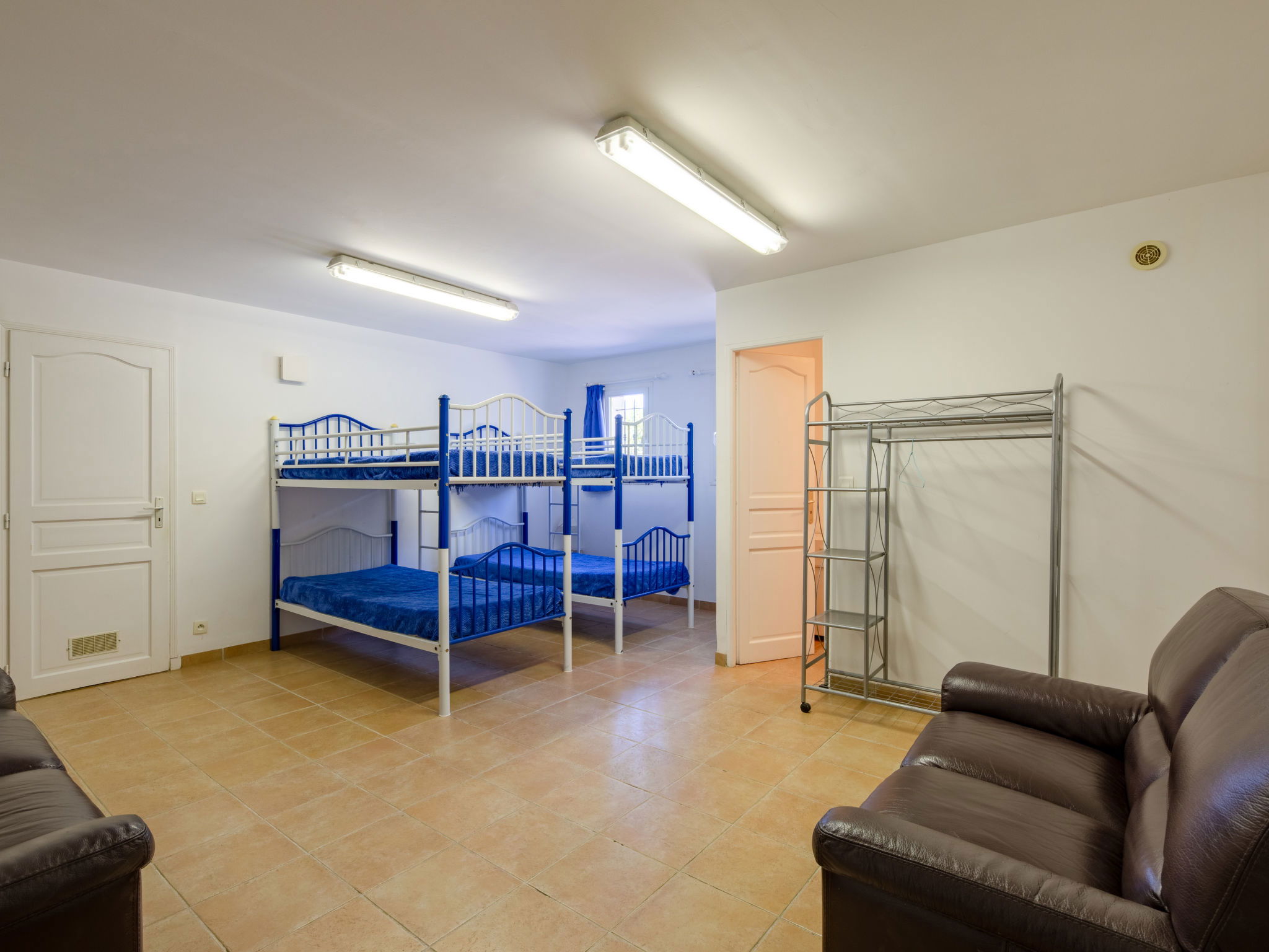 "La Figuière", maison 5 pièces 180 m2 sur 3 niveaux. Clair, aménagement de bon goût: séjour/salle à manger avec table pour les repas et TV (écran plat), DVD. Sortie sur la terrasse, sur la piscine. 1 chambre avec 1 grand-lit (160 cm, longueur 200 cm), bain/WC. Cuisine ouverte (four, lave-vaisselle, 3 plaques à induction, grille-pain, bouilloire électrique, micro-ondes, congélateur, cafetière électrique). WC séparé. Air-conditionné, chauffage à air chaud. À l'étage inférieur: 1 chambre avec 2 x 2 lits superposés (90 cm, longueur 190 cm), WC séparés et douche. À l'étage supérieur: 1 chambre avec 2 lits (90 cm, longueur 200 cm), douche/WC. Sortie sur le balcon. 1 chambre avec 1 grand-lit (160 cm, longueur 200 cm), douche/WC. Sortie sur le balcon. Chauffage électrique. Balcon 25 m2, situation sud-ouest, terrasse 40 m2 partiellement couverte, situation sud-ouest. Meubles de terrasse, barbecue. A disposition: lave-linge, sèche-linge, fer à repasser. Internet (Connexion WIFI, gratuit). Veuillez noter: détecteur de fumée. Annonce d'un professionnel (art 155, IV du CGI) 83115000475DP