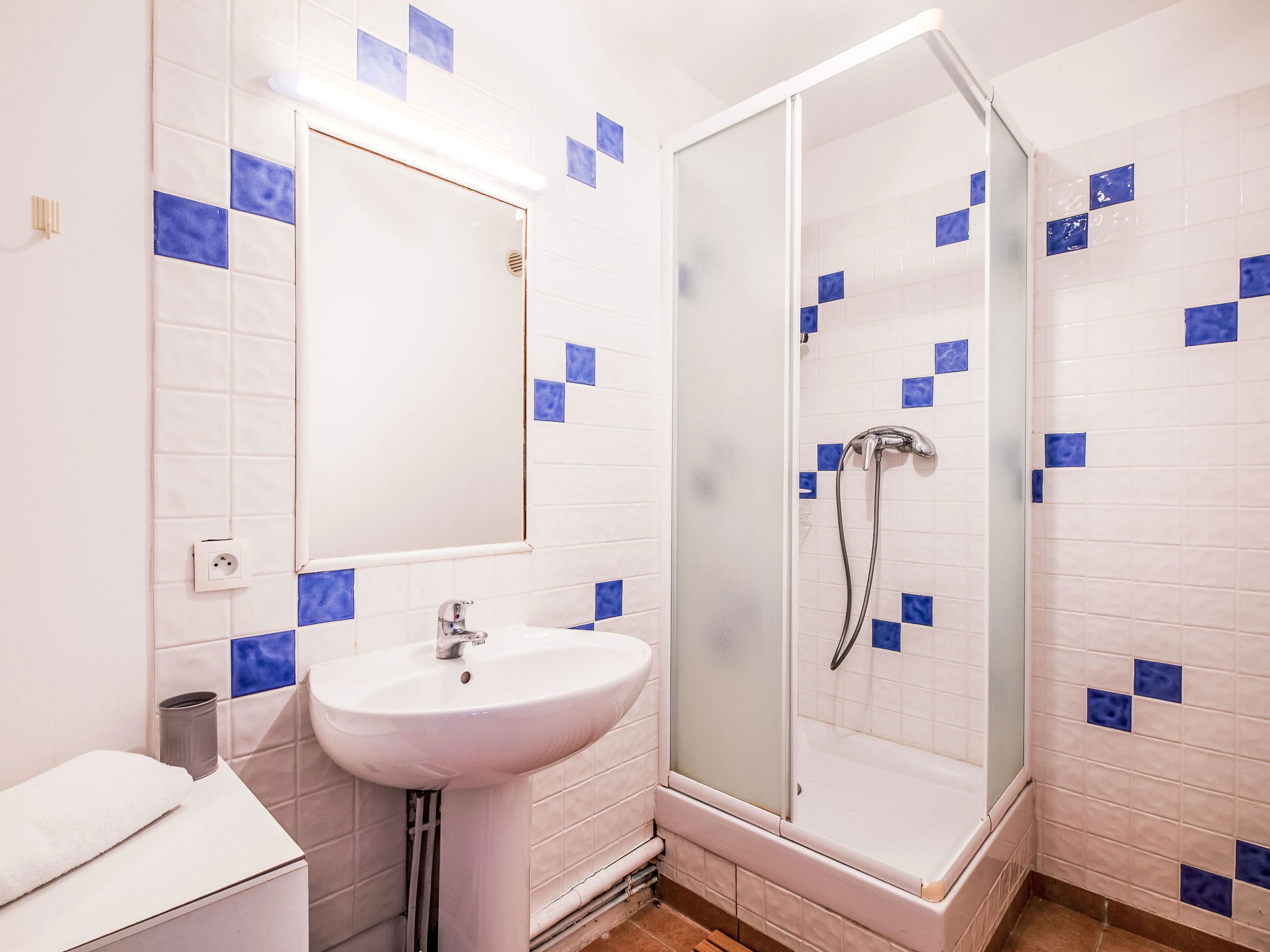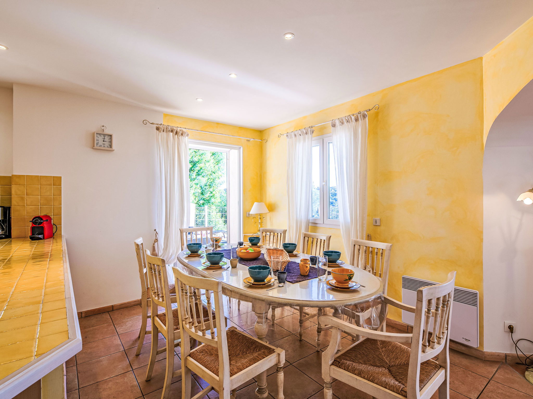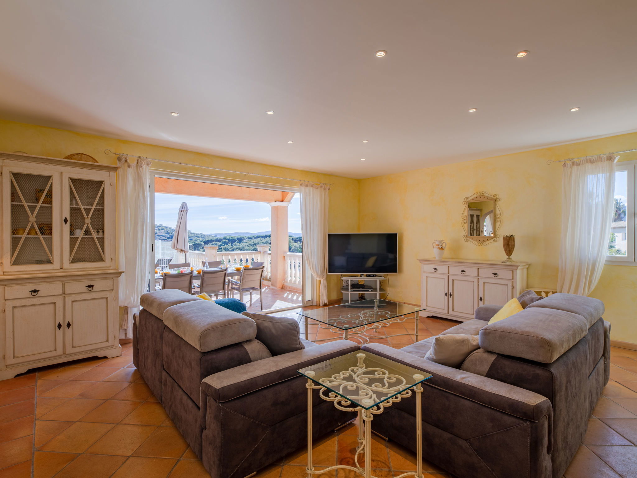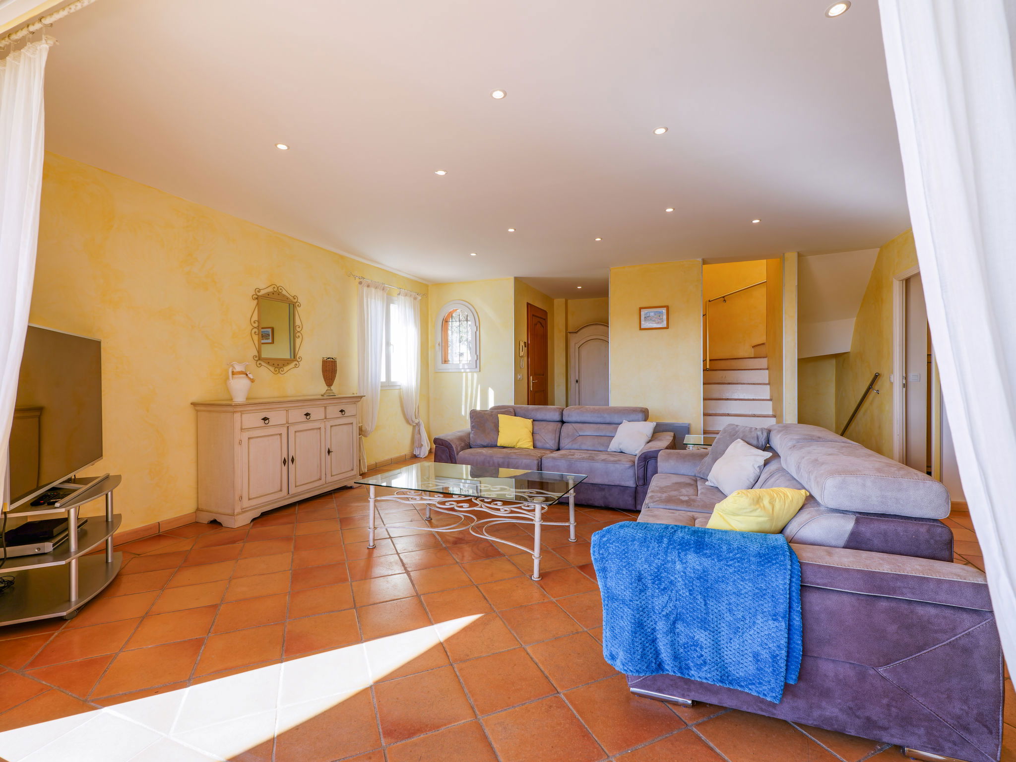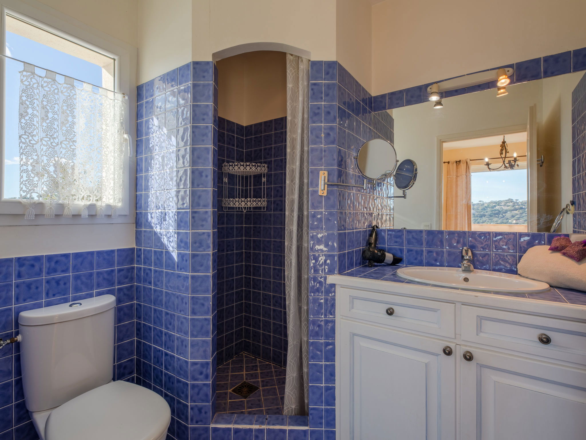 "La Figuière", maison 5 pièces 180 m2 sur 3 niveaux. Clair, aménagement de bon goût: séjour/salle à manger avec table pour les repas et TV (écran plat), DVD. Sortie sur la terrasse, sur la piscine. 1 chambre avec 1 grand-lit (160 cm, longueur 200 cm), bain/WC. Cuisine ouverte (four, lave-vaisselle, 3 plaques à induction, grille-pain, bouilloire électrique, micro-ondes, congélateur, cafetière électrique). WC séparé. Air-conditionné, chauffage à air chaud. À l'étage inférieur: 1 chambre avec 2 x 2 lits superposés (90 cm, longueur 190 cm), WC séparés et douche. À l'étage supérieur: 1 chambre avec 2 lits (90 cm, longueur 200 cm), douche/WC. Sortie sur le balcon. 1 chambre avec 1 grand-lit (160 cm, longueur 200 cm), douche/WC. Sortie sur le balcon. Chauffage électrique. Balcon 25 m2, situation sud-ouest, terrasse 40 m2 partiellement couverte, situation sud-ouest. Meubles de terrasse, barbecue. A disposition: lave-linge, sèche-linge, fer à repasser. Internet (Connexion WIFI, gratuit). Veuillez noter: détecteur de fumée. Annonce d'un professionnel (art 155, IV du CGI) 83115000475DP